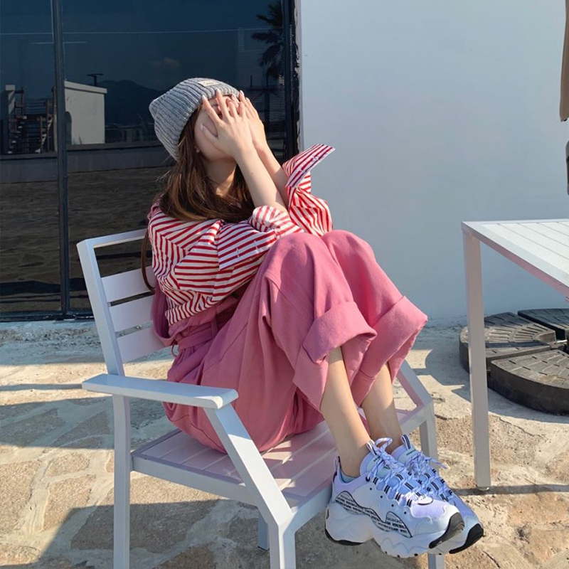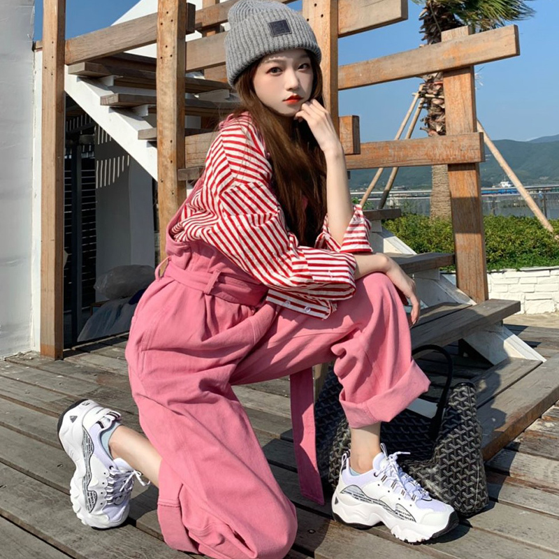2021秋冬季休閒粉色工裝牛仔抱嬰袋褲女韓版寬鬆收腰顯高闊腿直筒褲