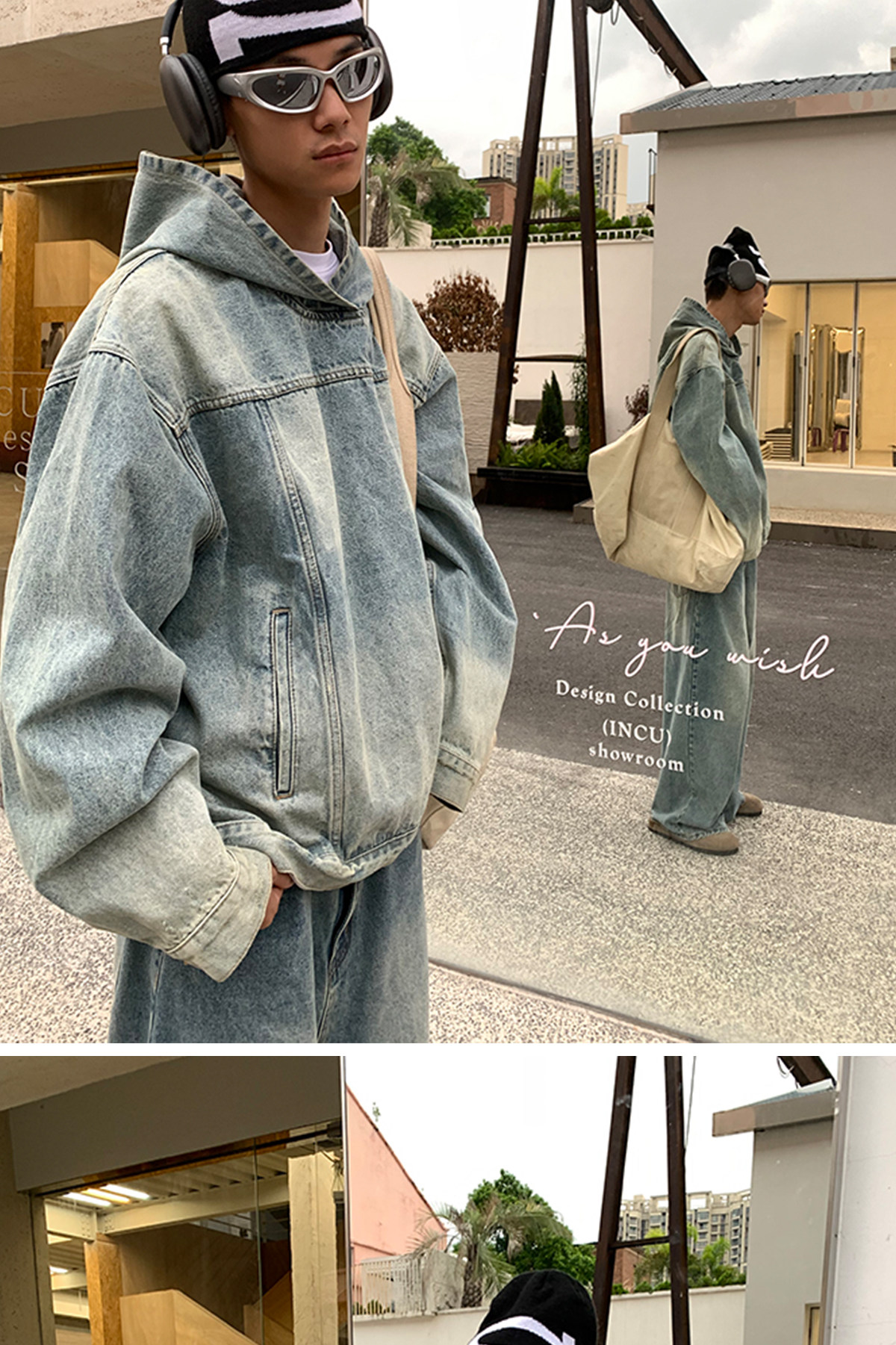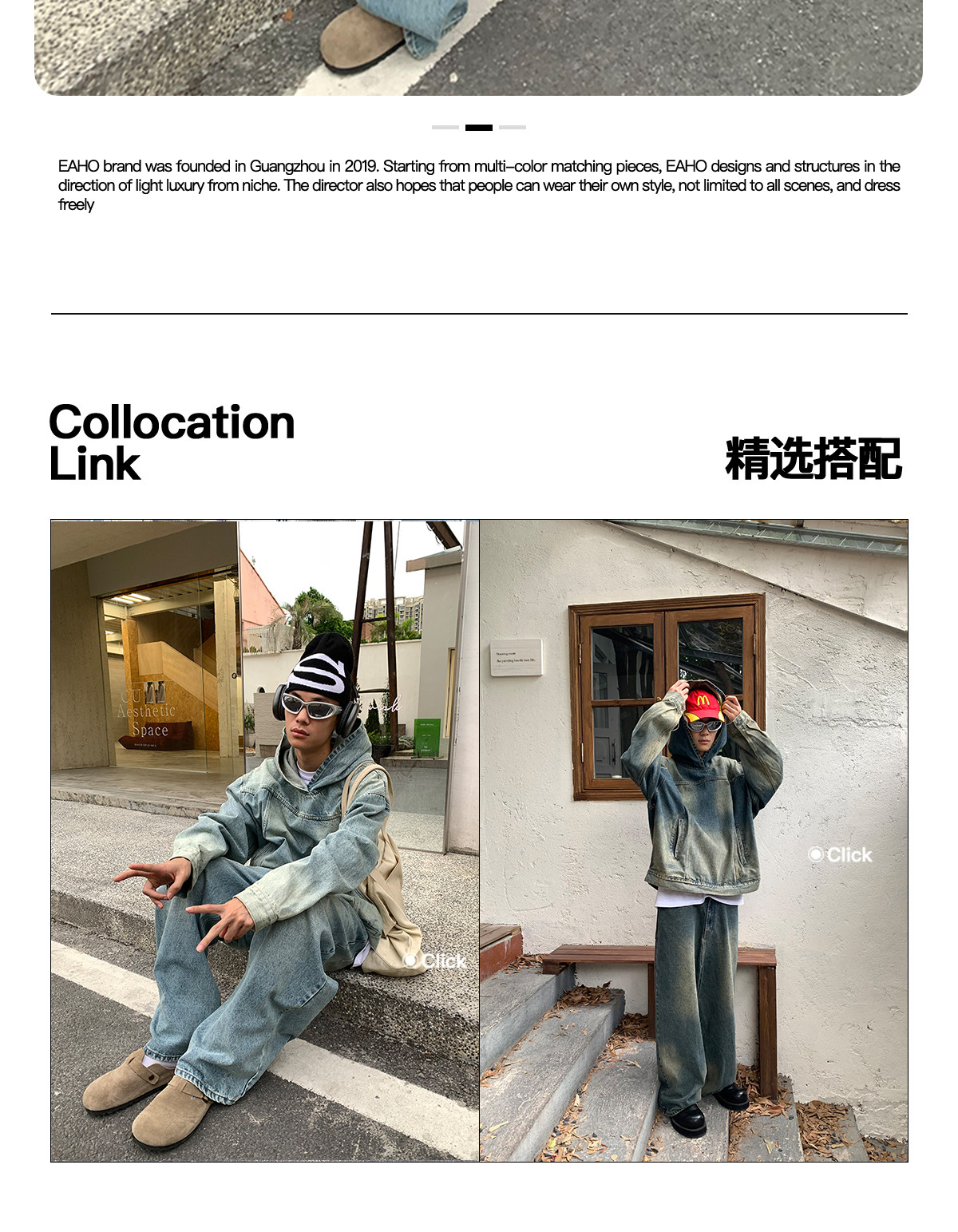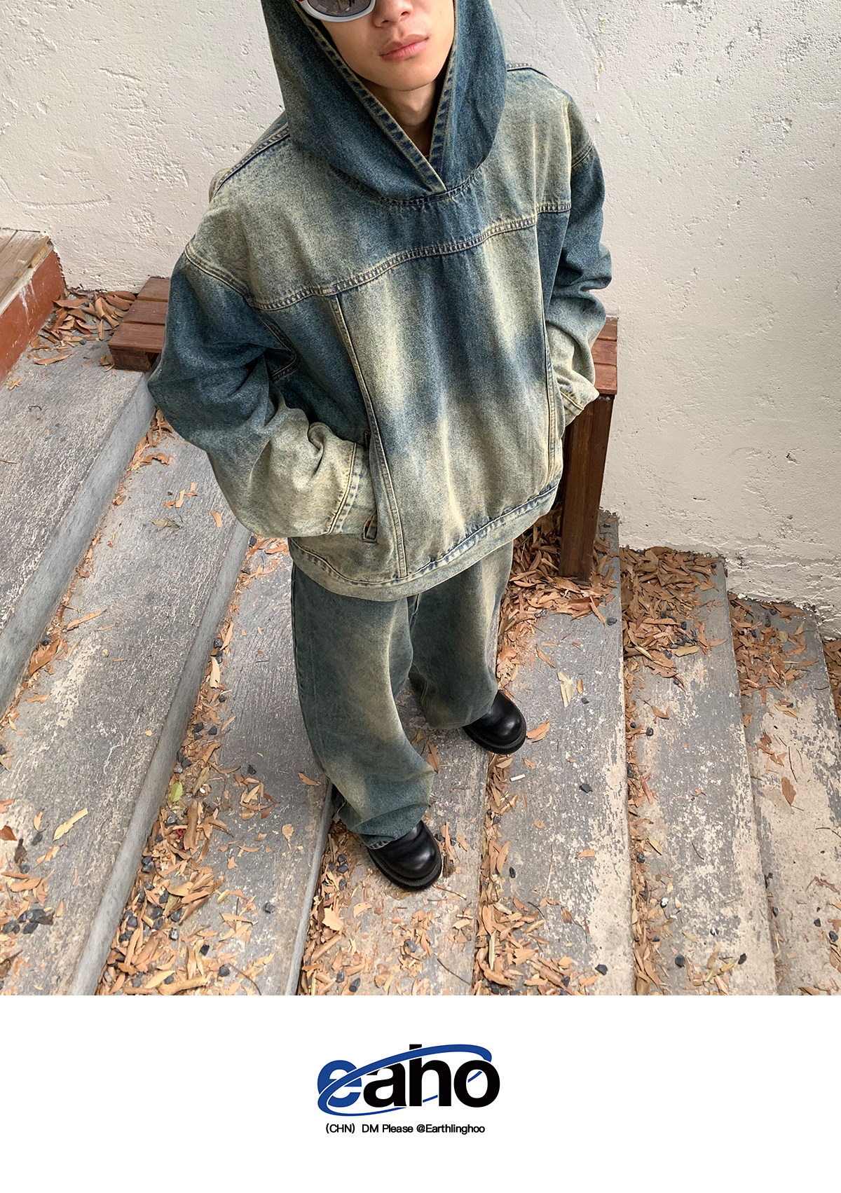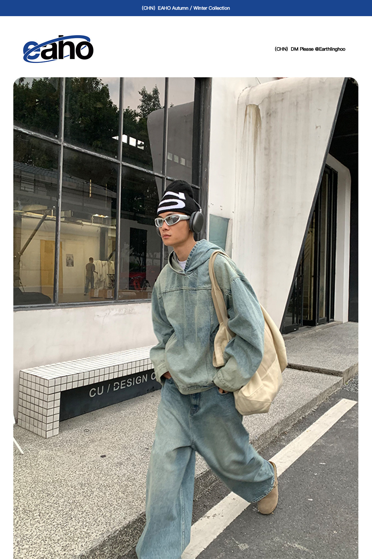 EAHO美式復古連帽運動衫外套牛仔褲套裝男秋季新款水洗做舊兩件套