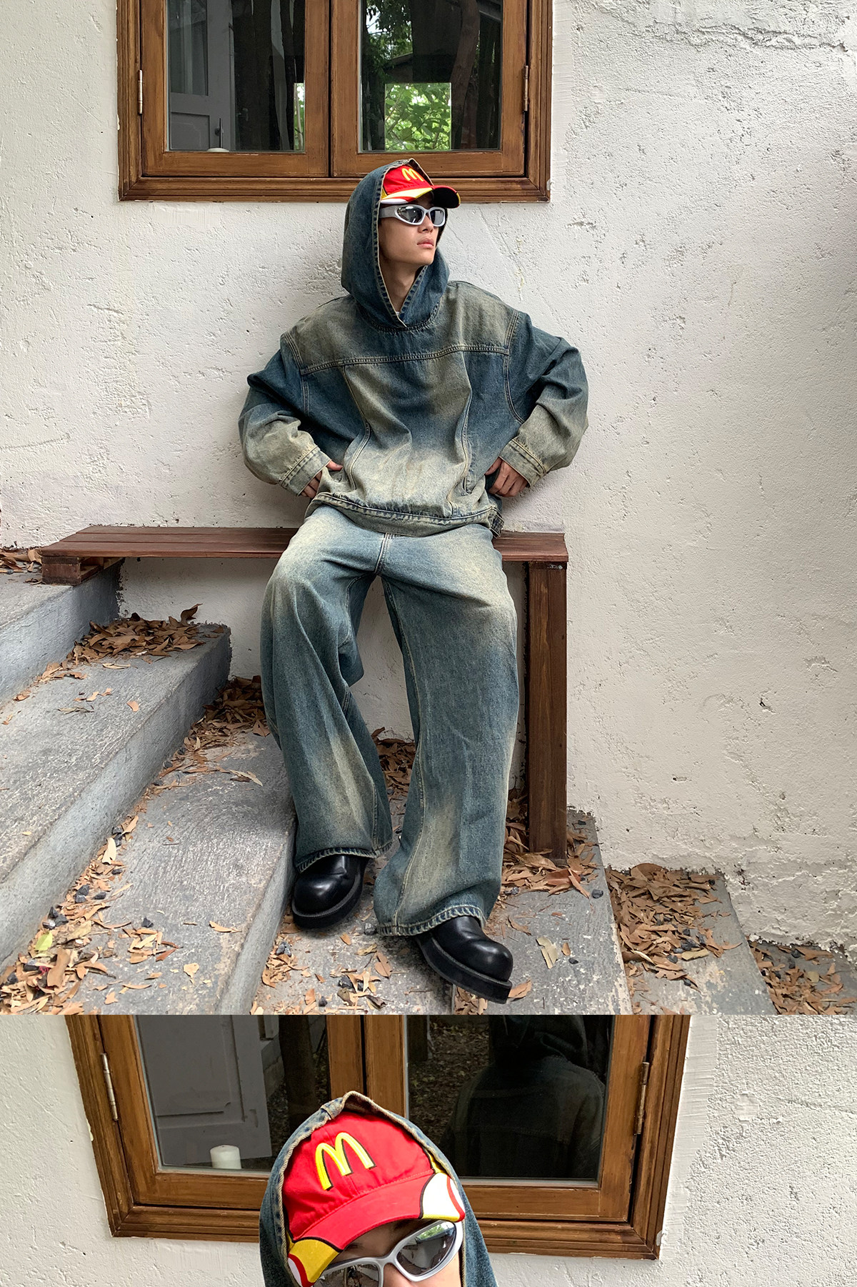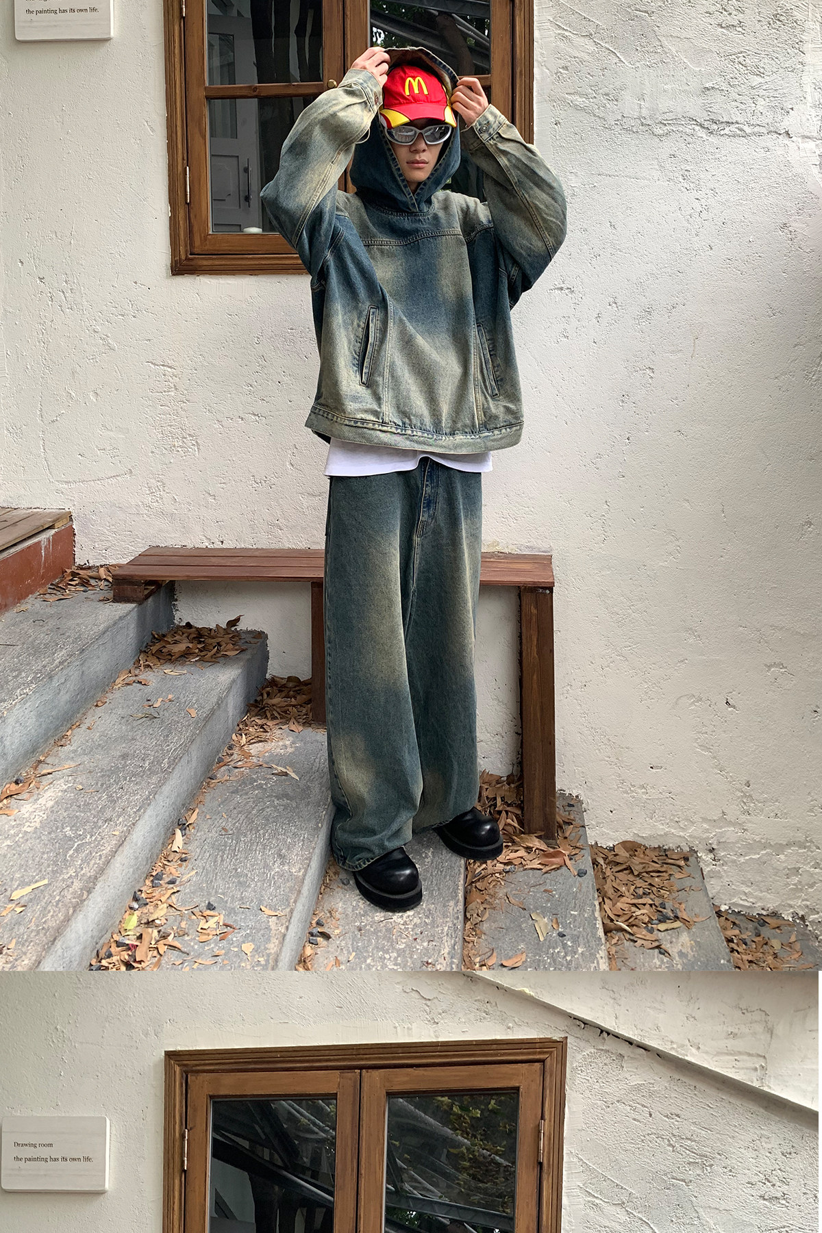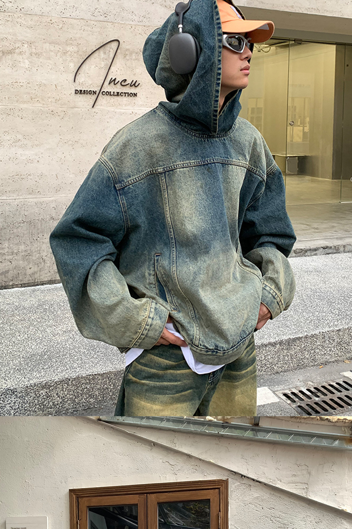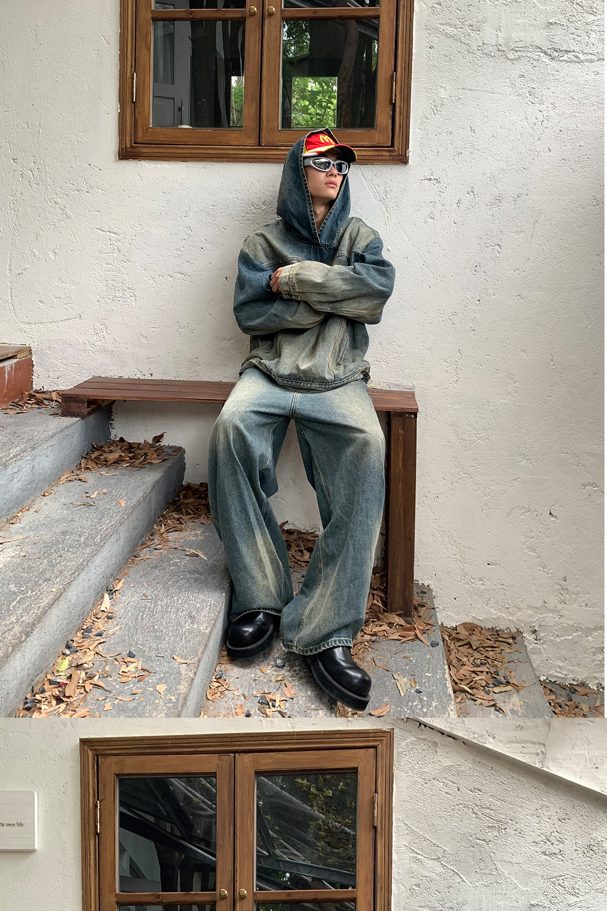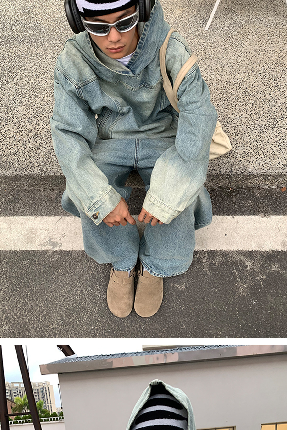EAHO美式復古連帽運動衫外套牛仔褲套裝男秋季新款水洗做舊兩件套