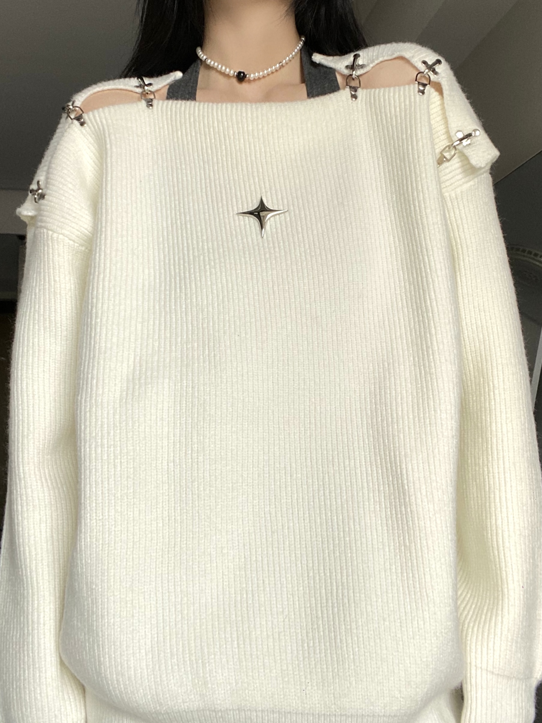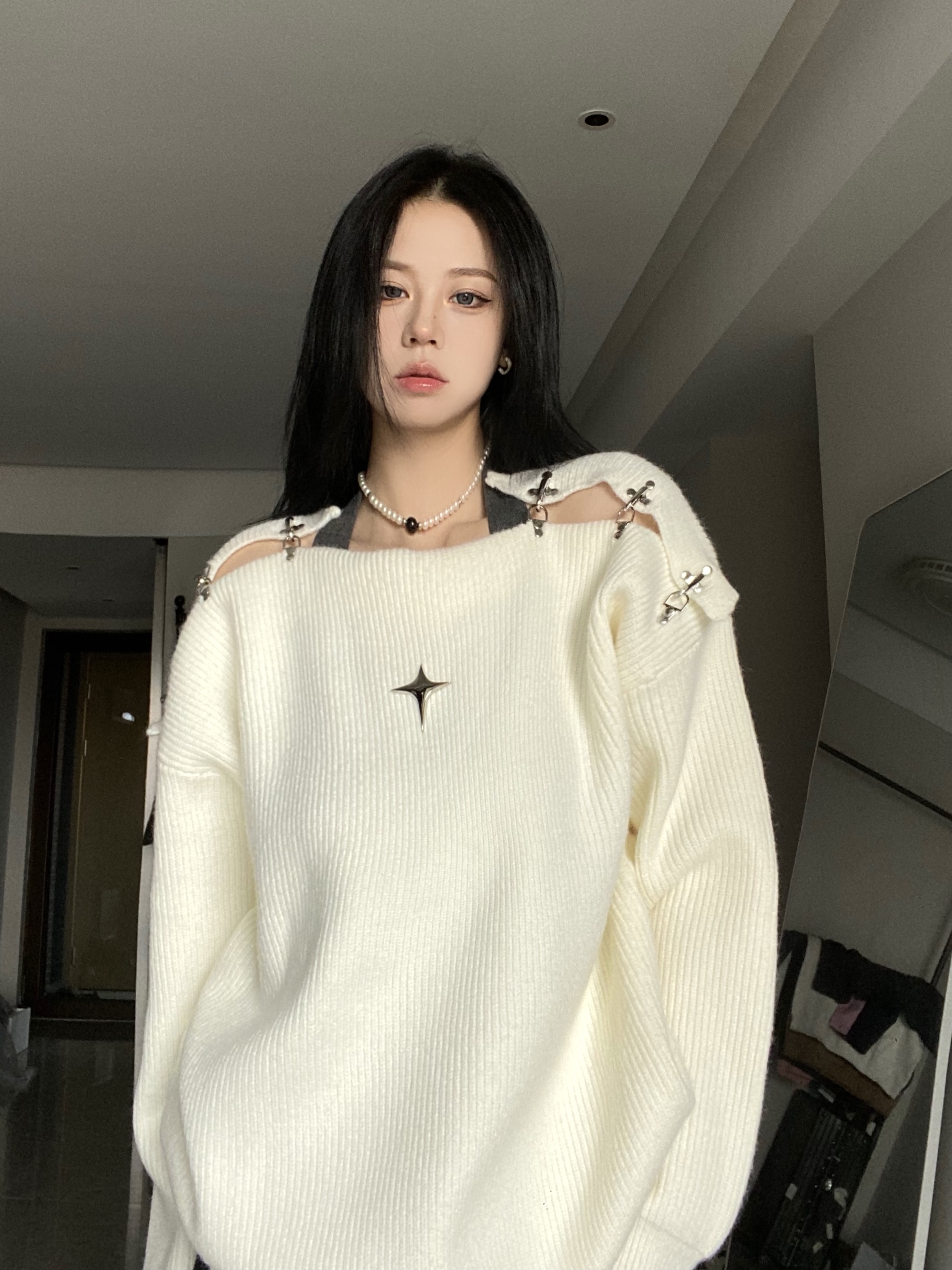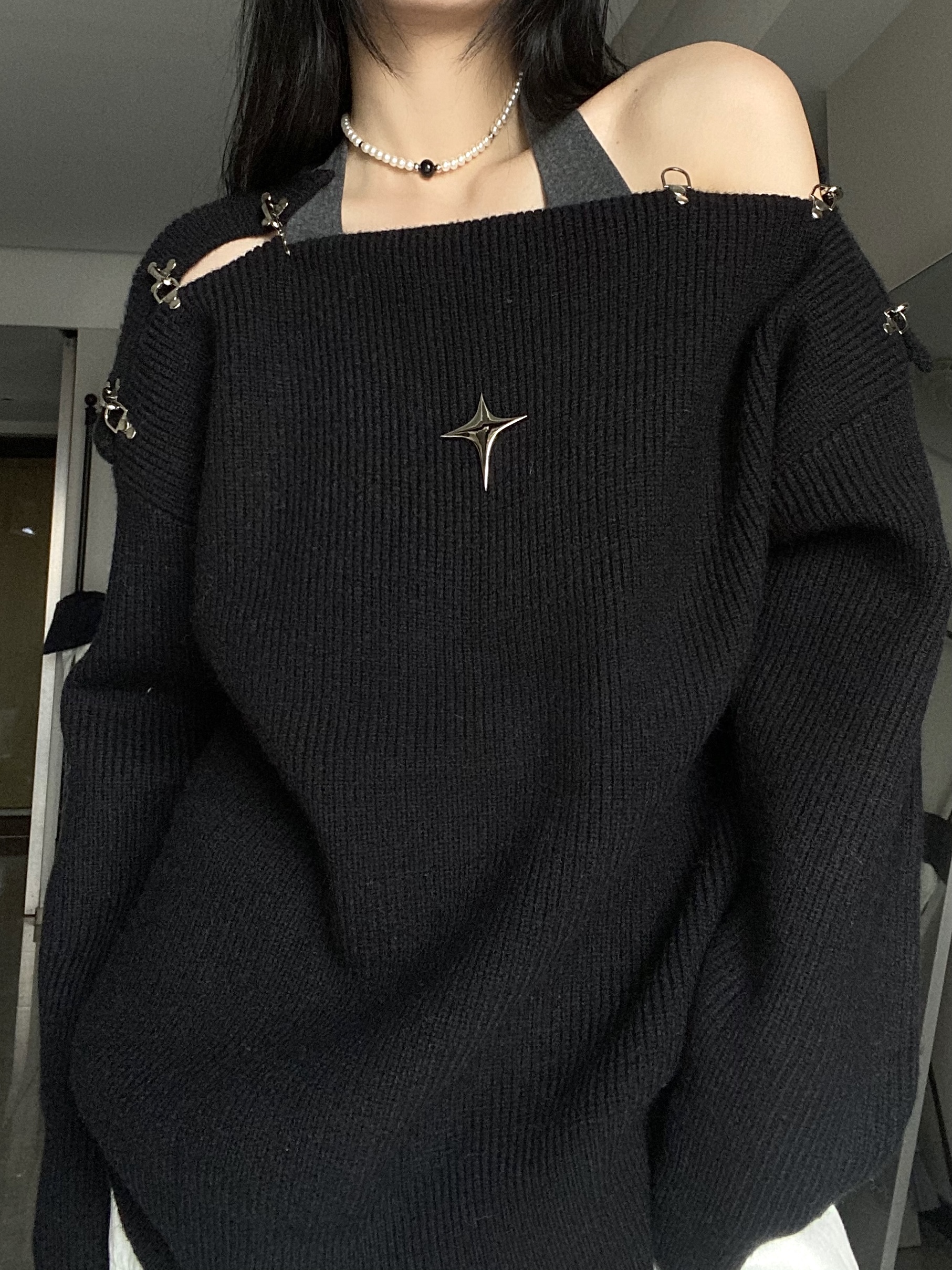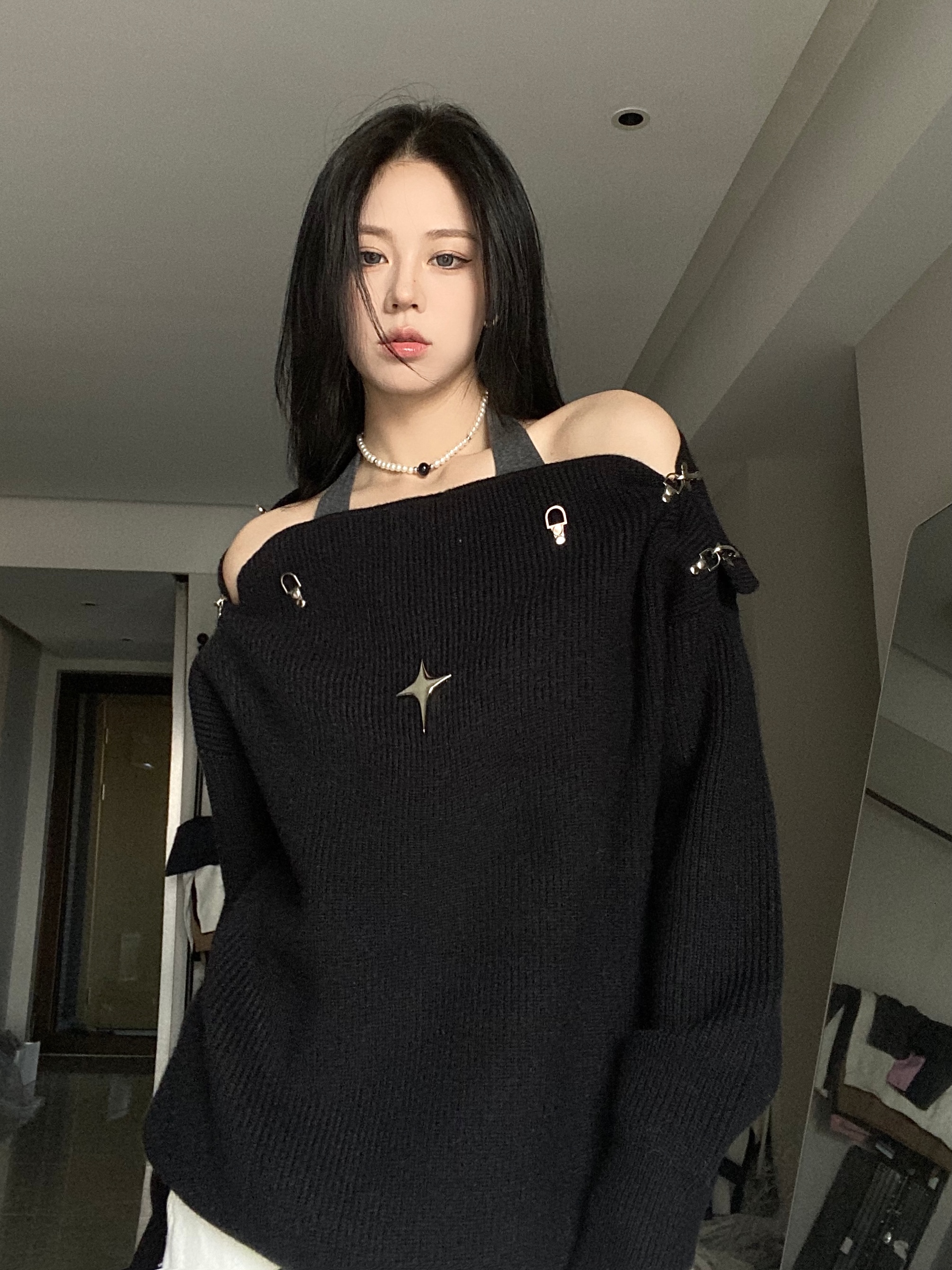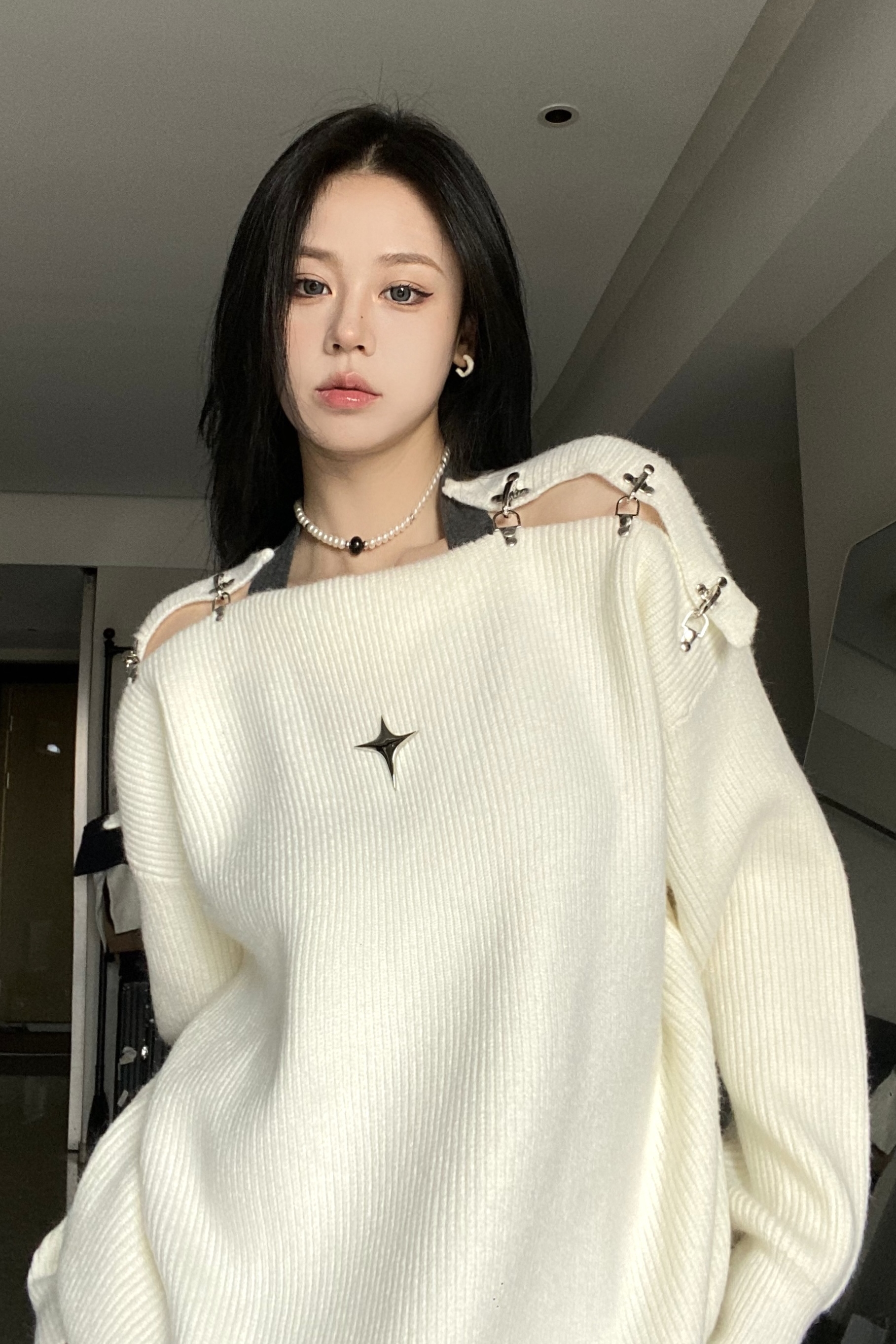 BabyStudios飛機扣辣妹露肩毛衣設計感一字肩鏤空氛圍針織上衣秋