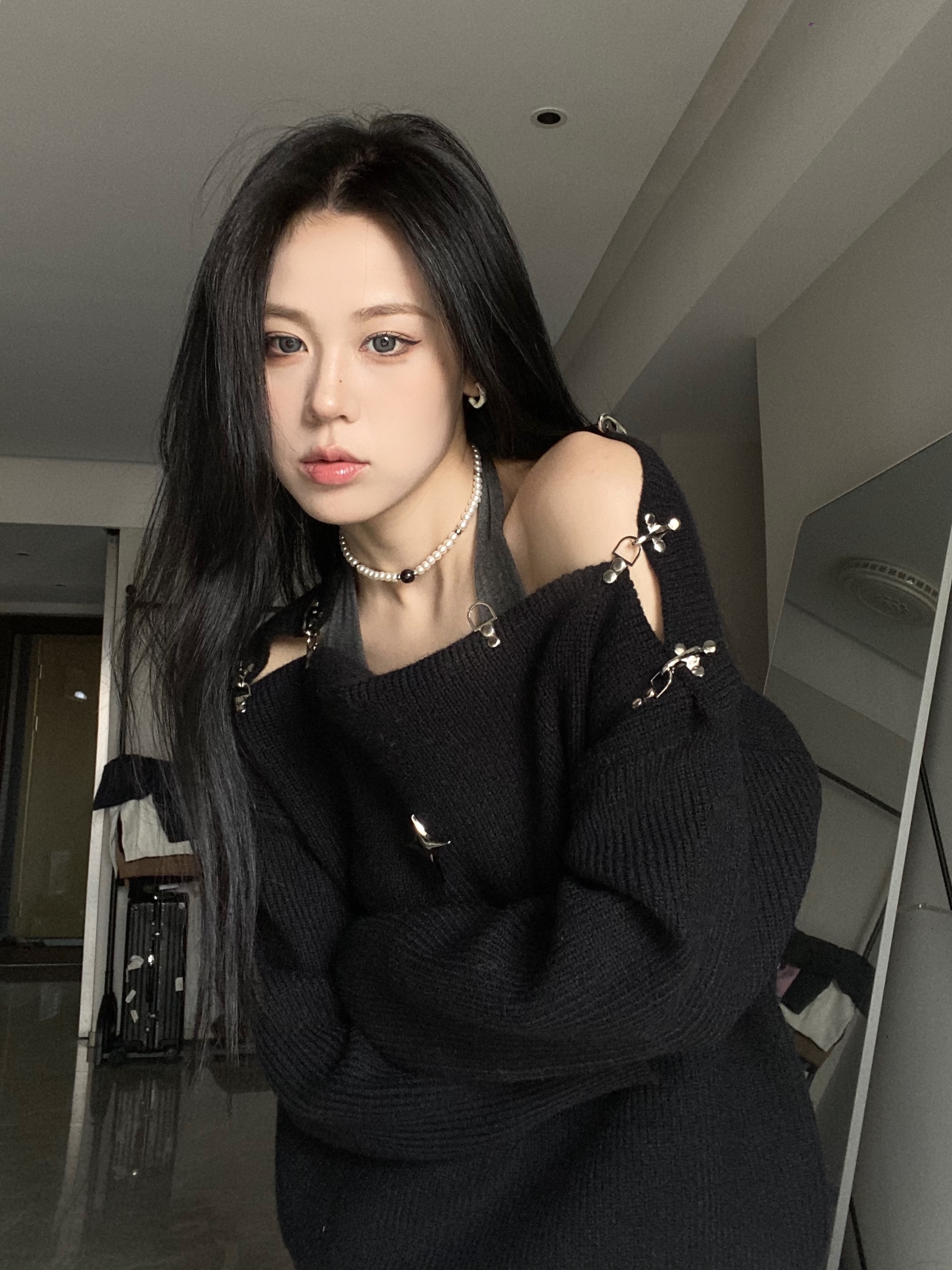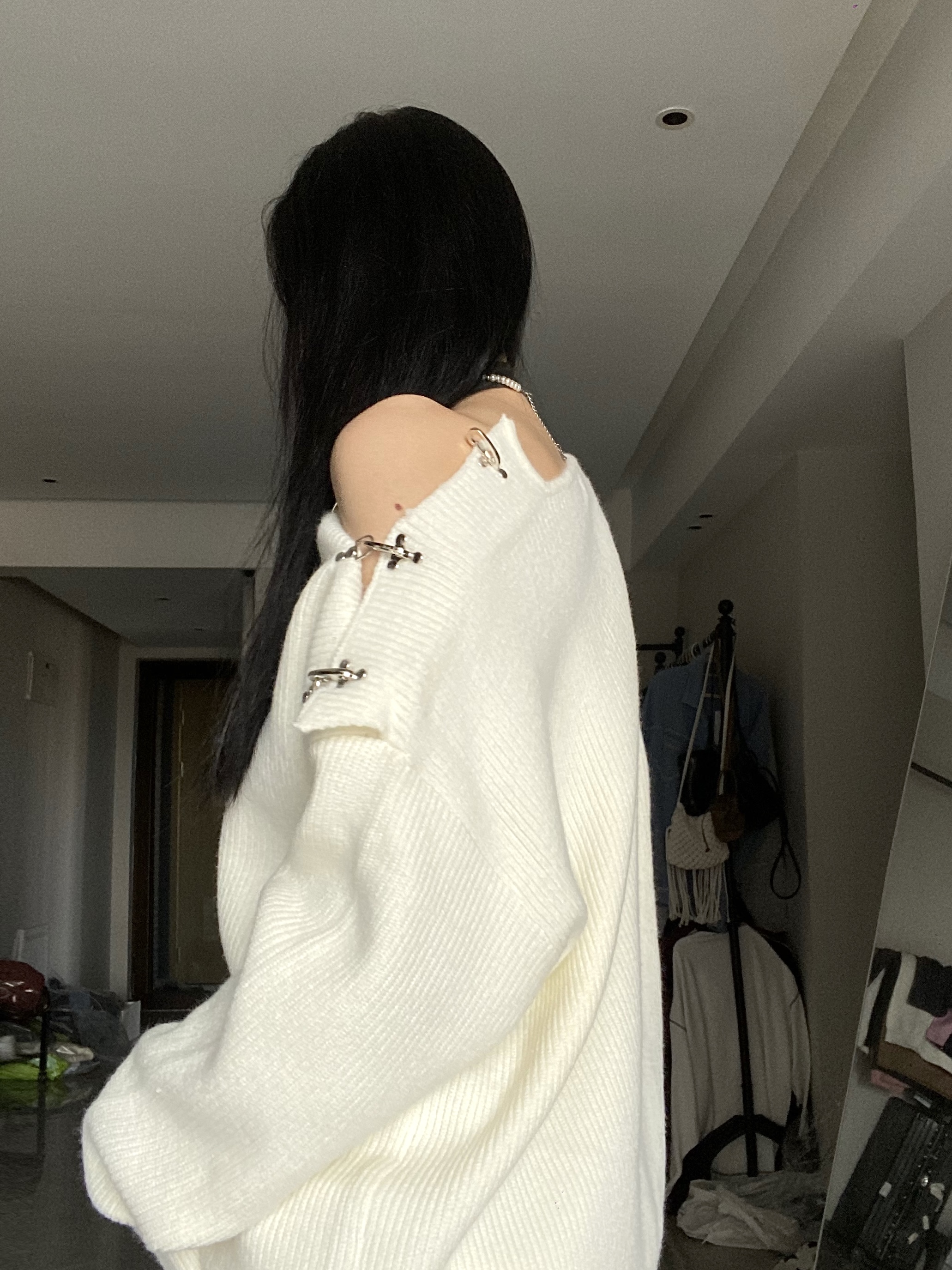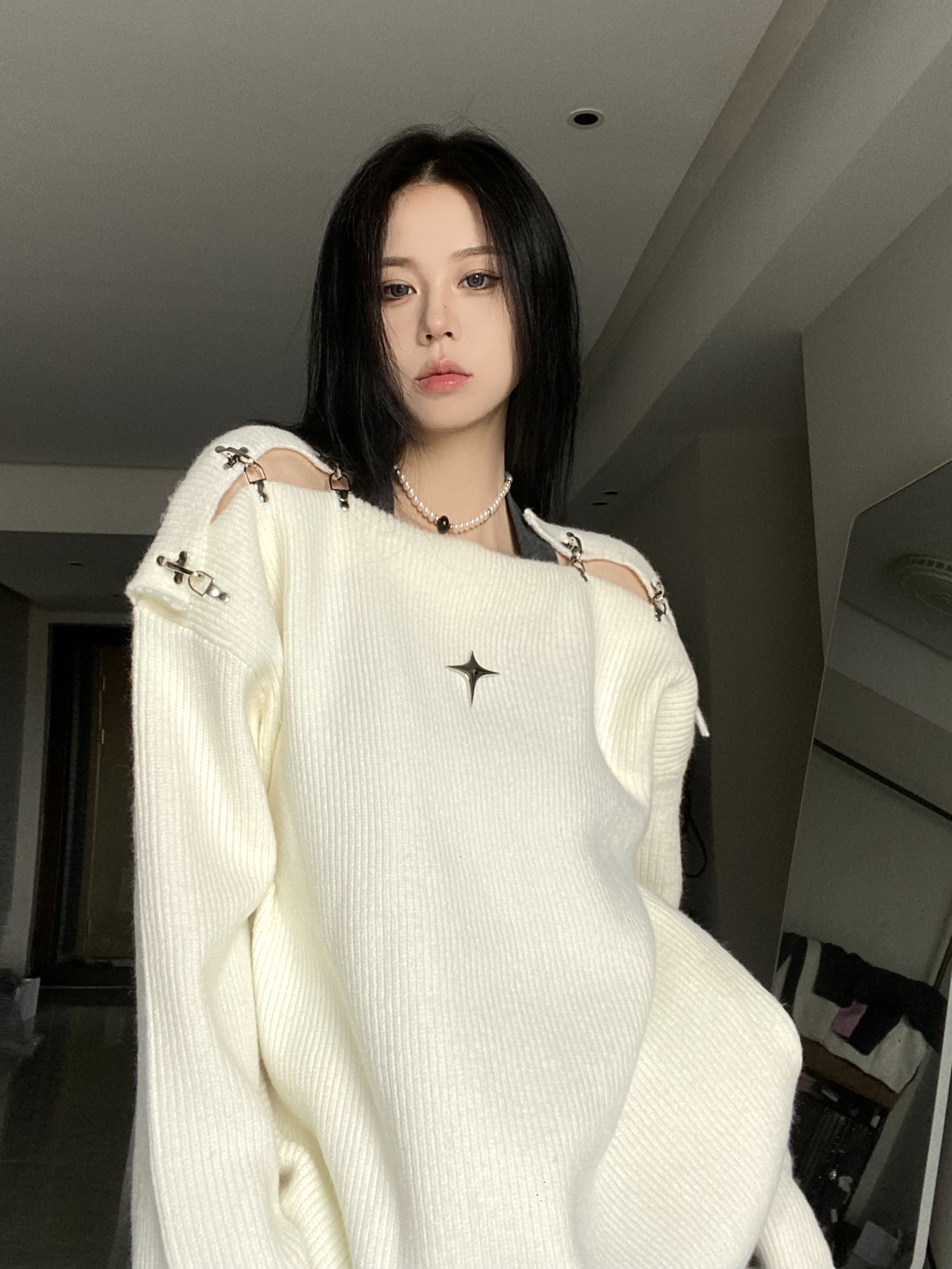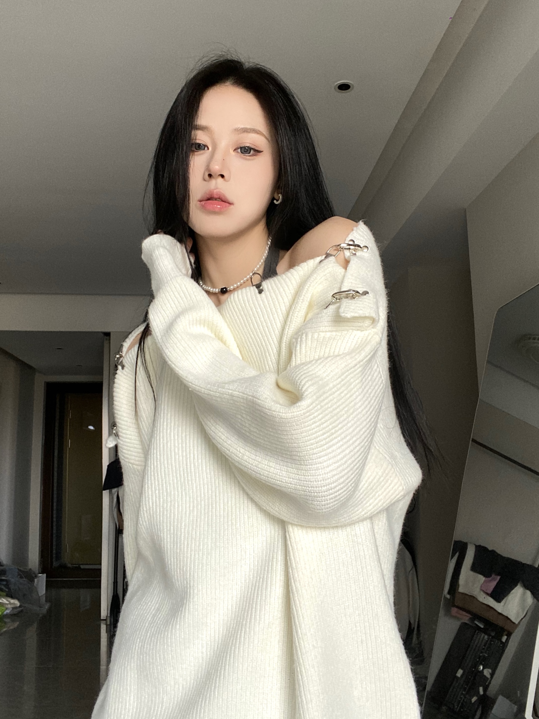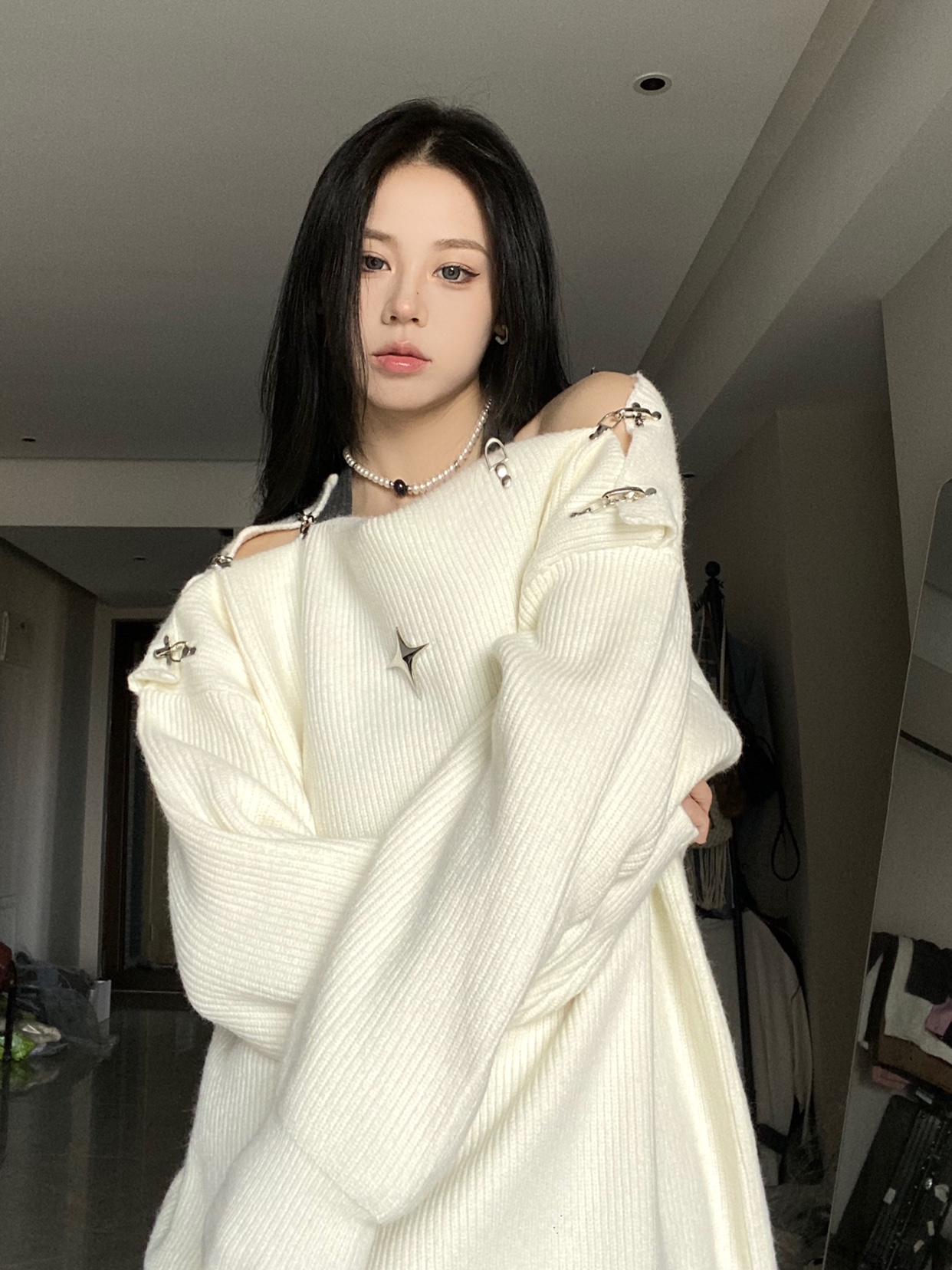 BabyStudios飛機扣辣妹露肩毛衣設計感一字肩鏤空氛圍針織上衣秋