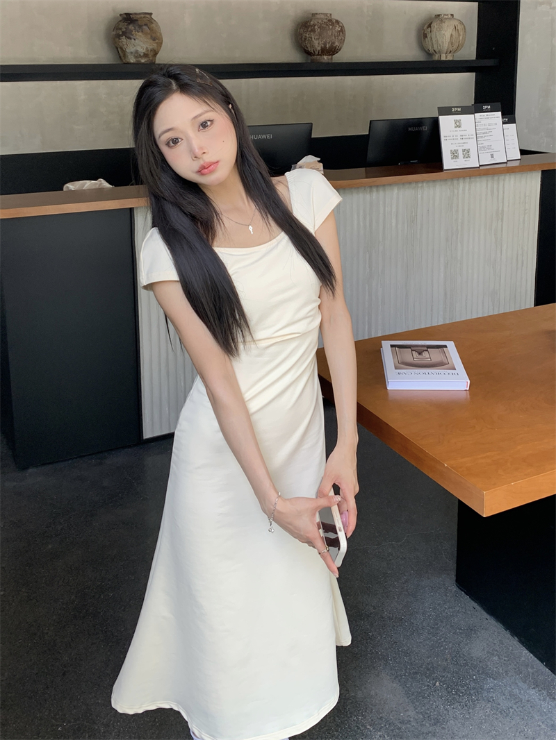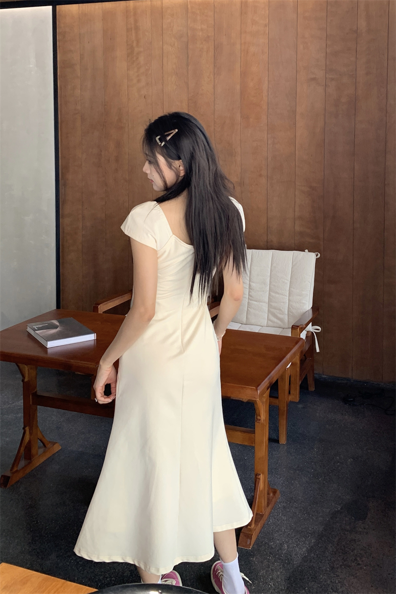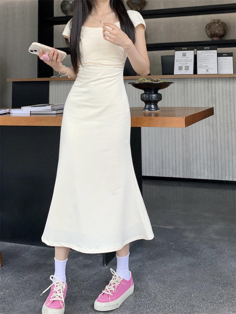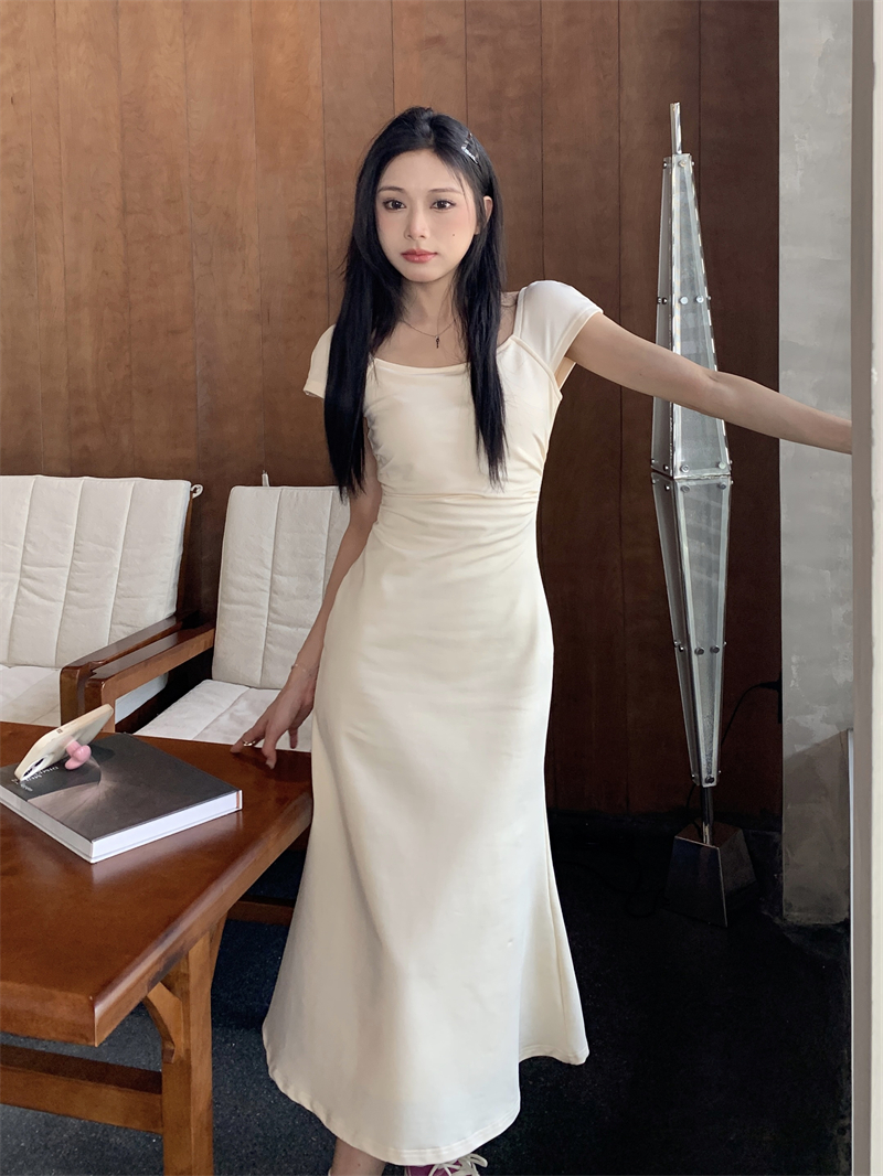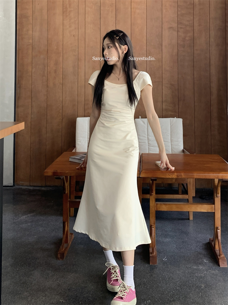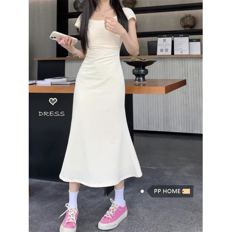 PPHOME花間白芍~溫柔風包臀裙洋裝女夏季新款收腰抽褶針織長裙