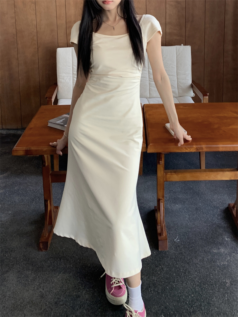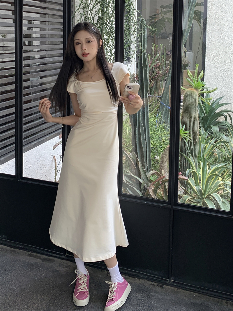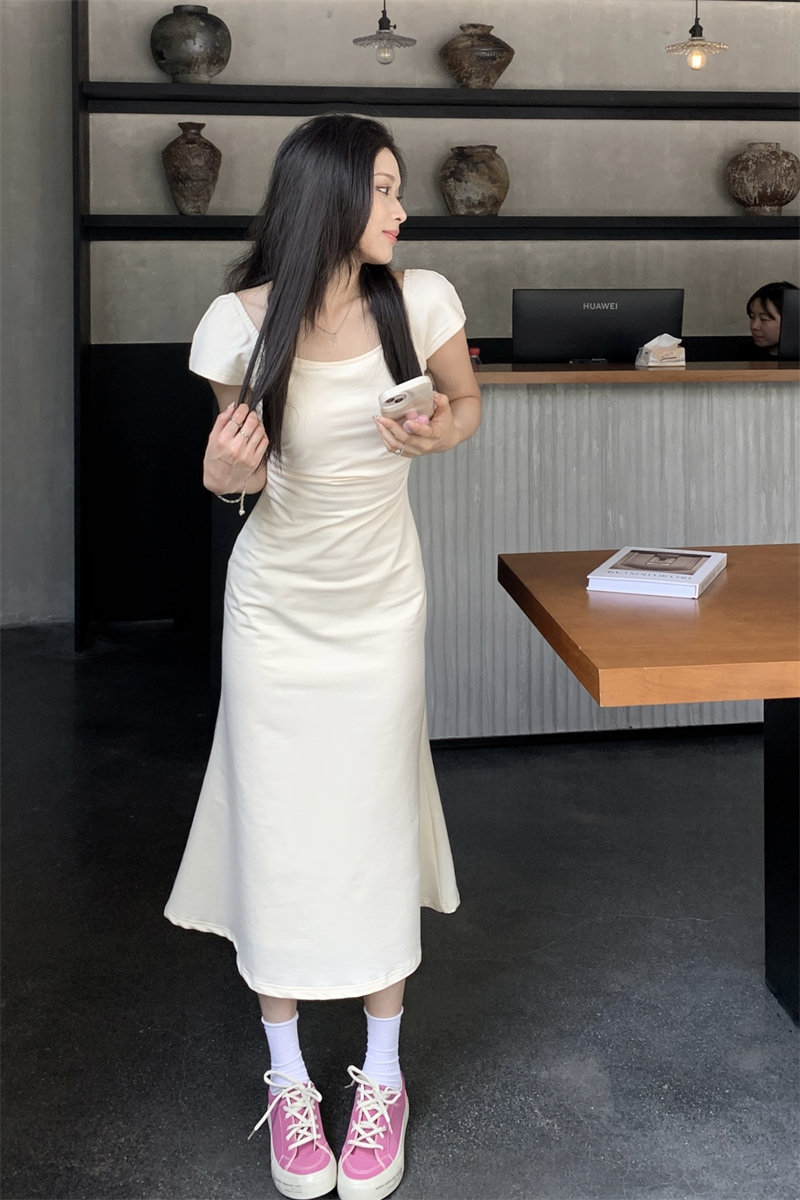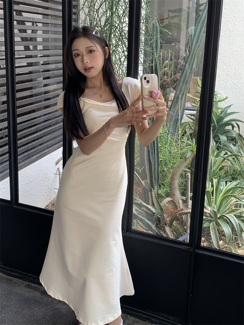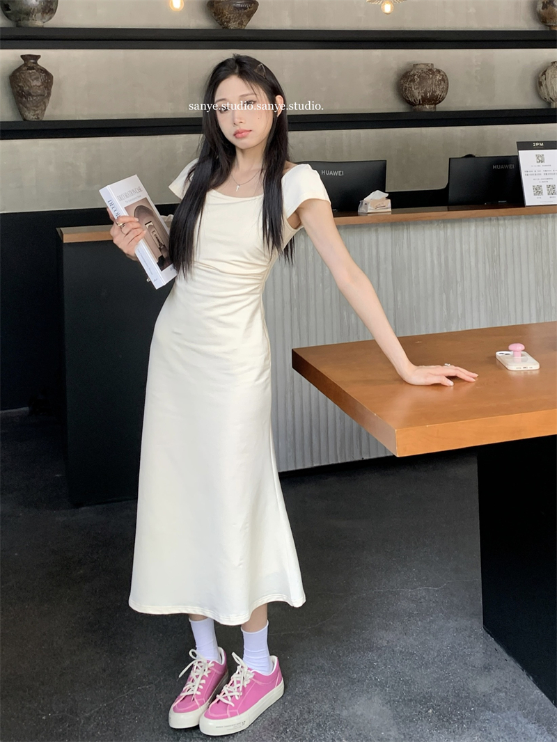 PPHOME花間白芍~溫柔風包臀裙洋裝女夏季新款收腰抽褶針織長裙