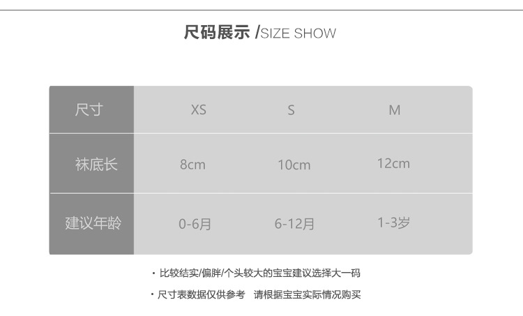 童袜尺码 XS 0-6个月,S 6-12个月,M 1-3岁