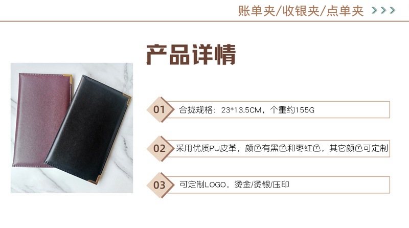 跨境货源PU皮革账单夹 酒店菜单夹点单夹 前台收银夹现货批发厂家