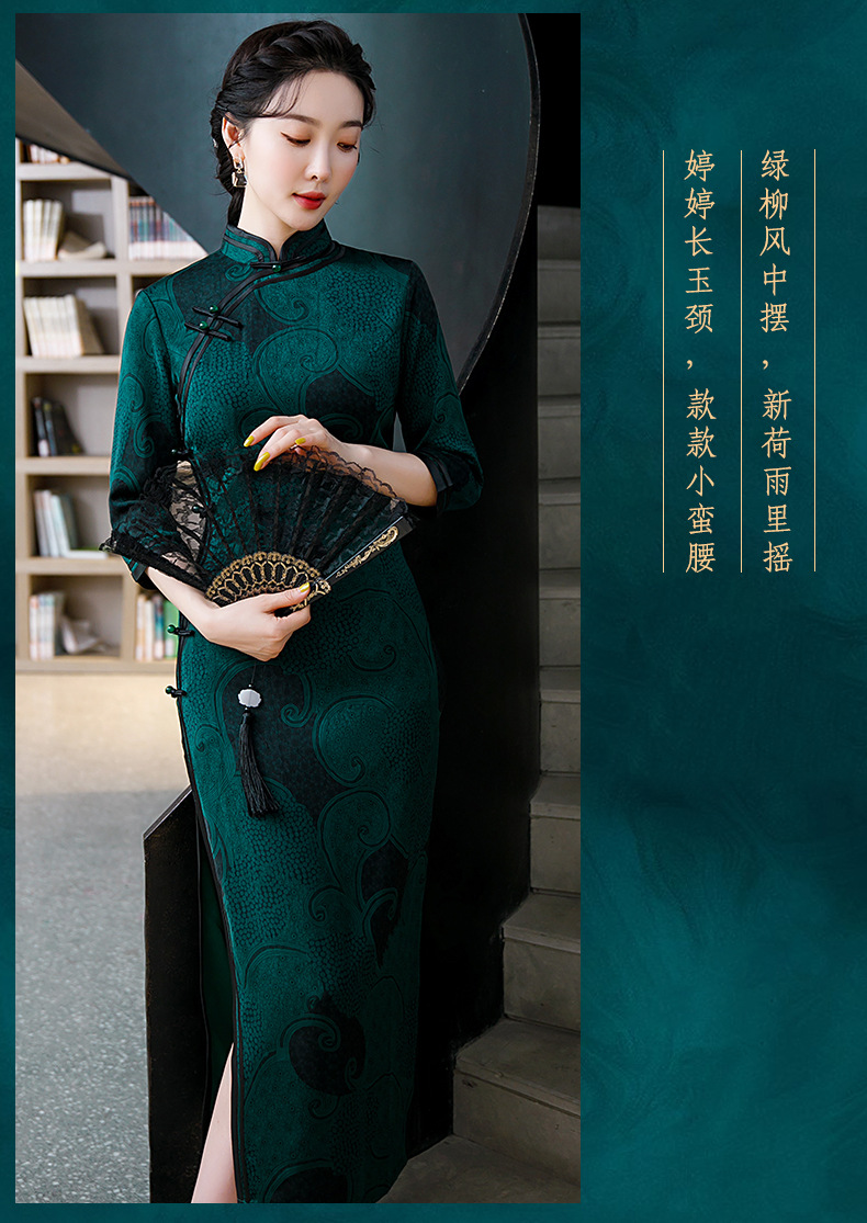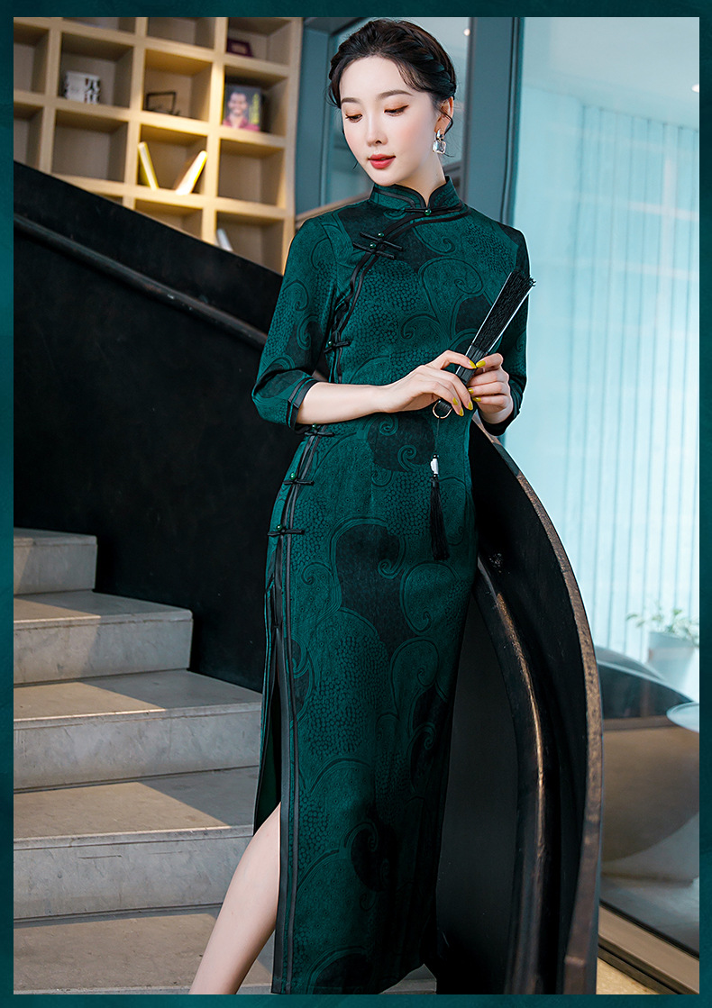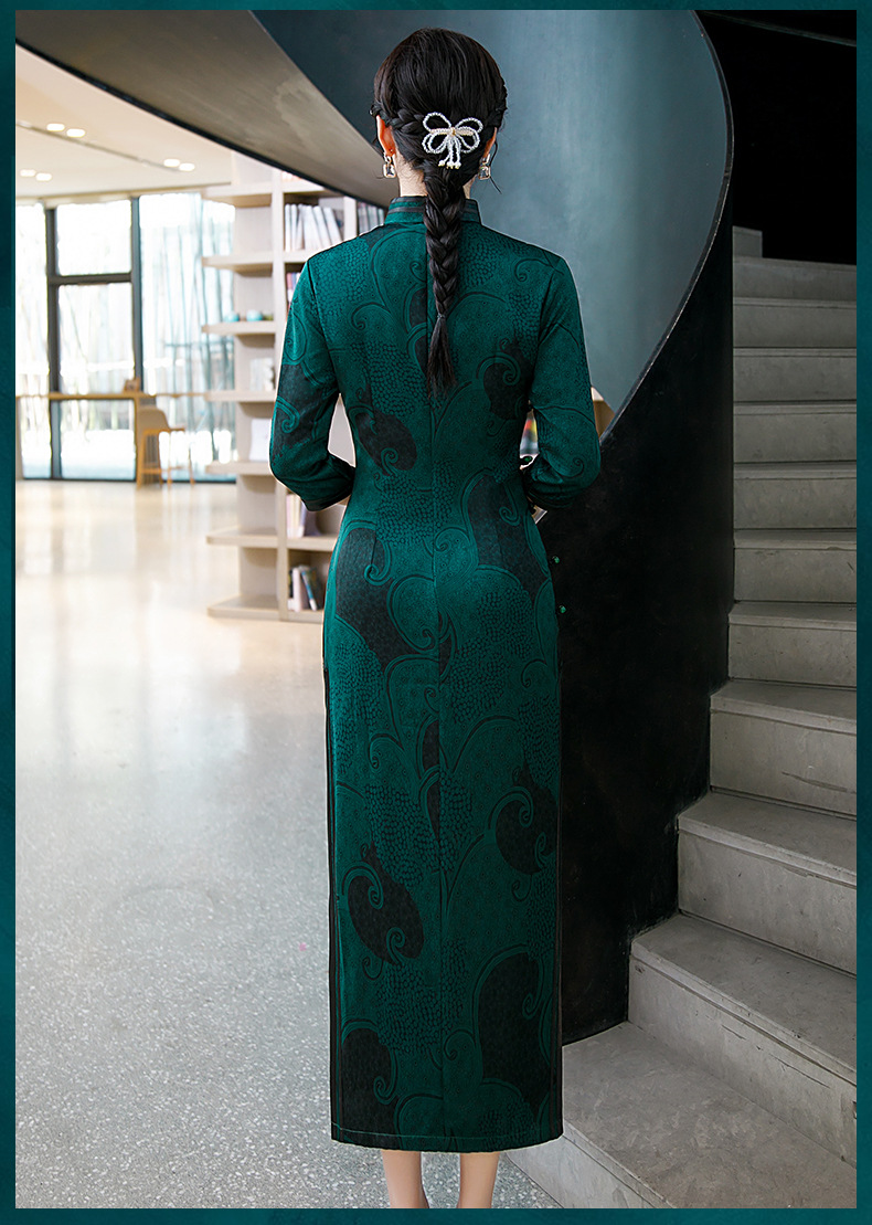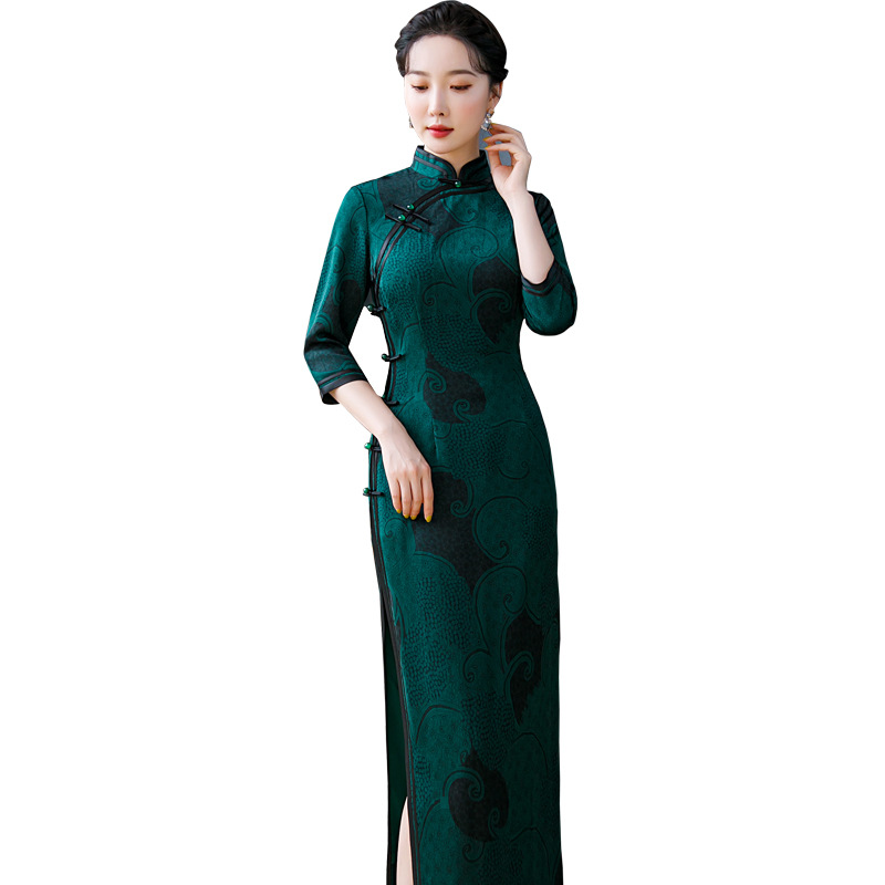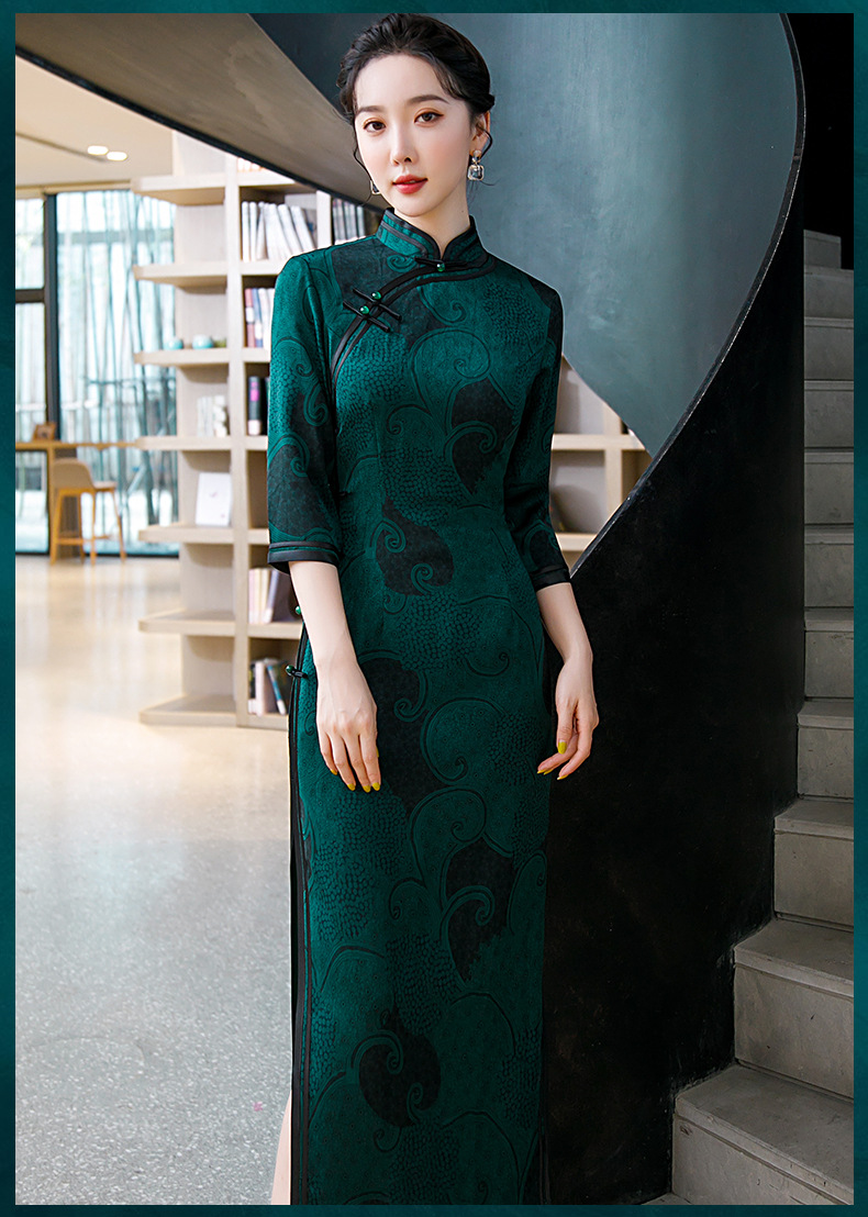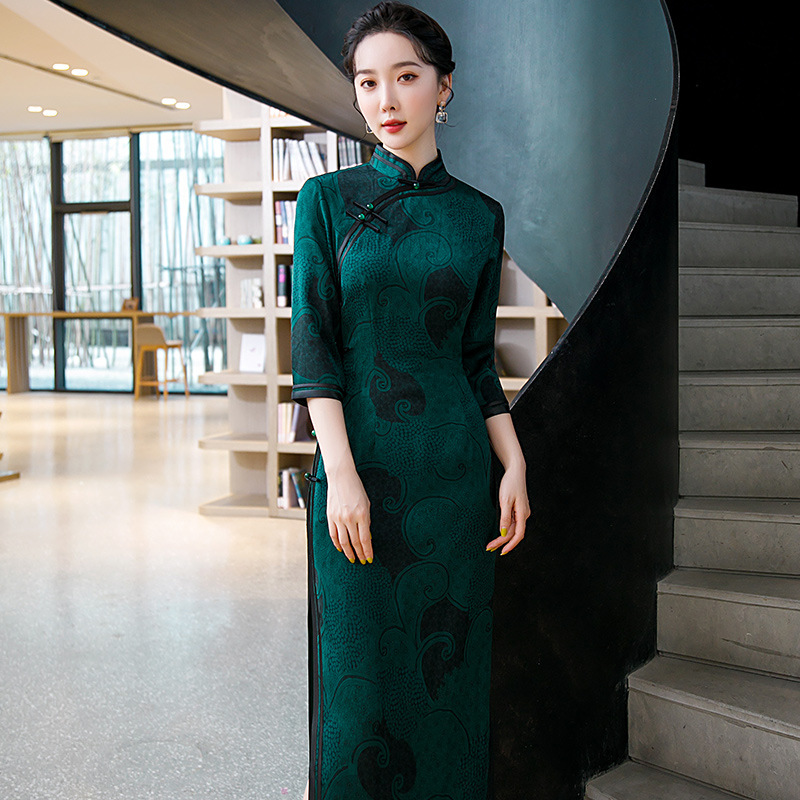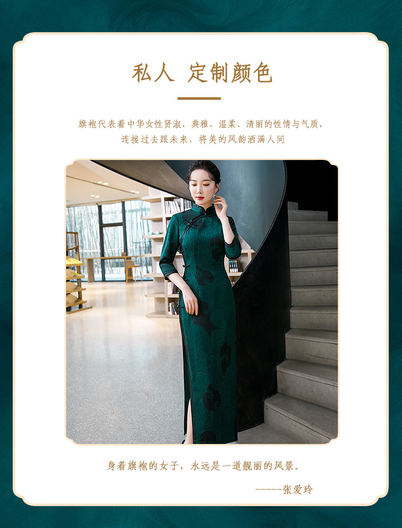 2021秋冬季新款中国风绿色女士复古立领旗袍晚宴会优雅礼服C8019