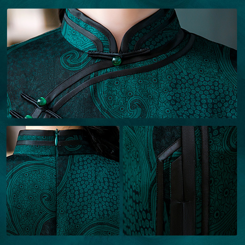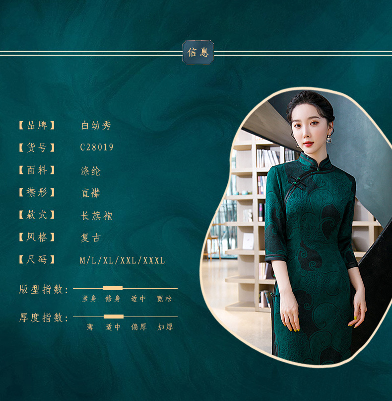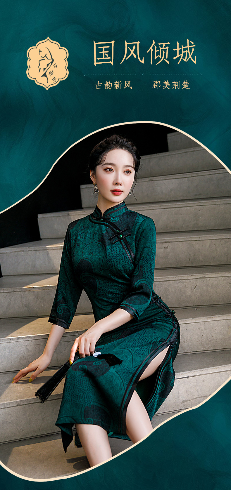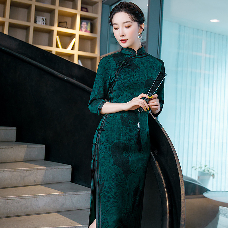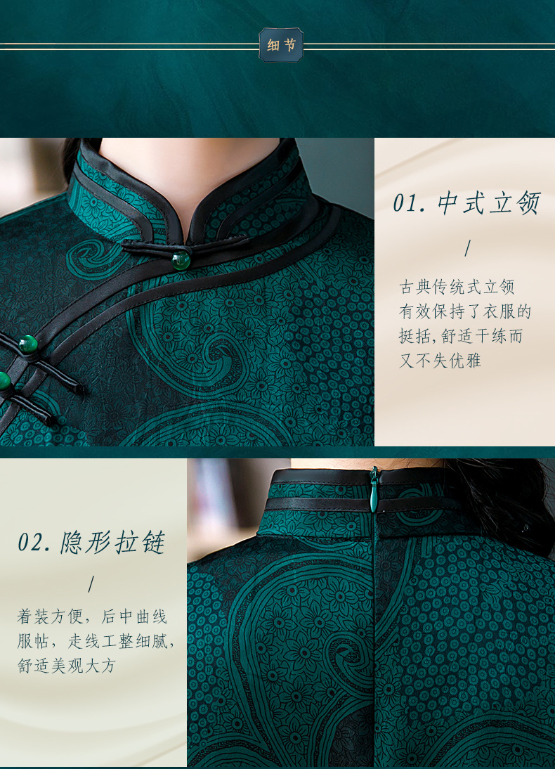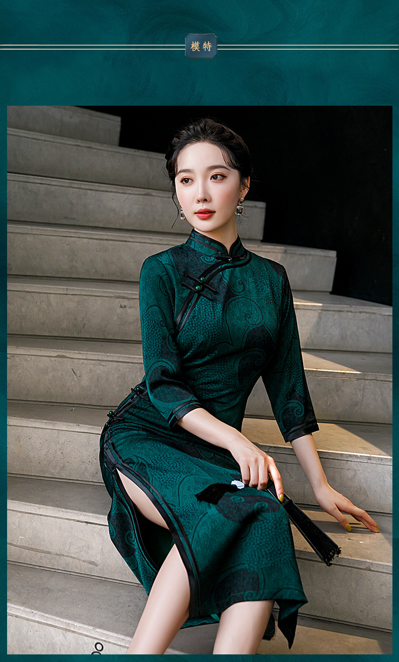 2021秋冬季新款中国风绿色女士复古立领旗袍晚宴会优雅礼服C8019