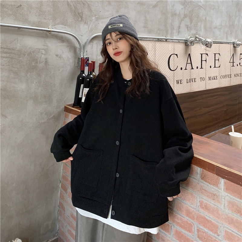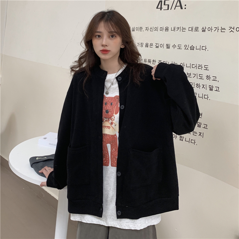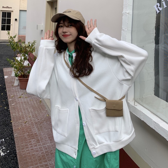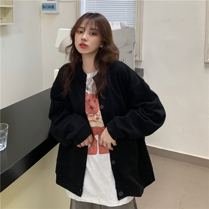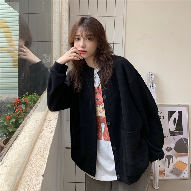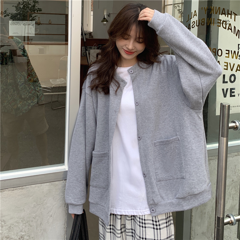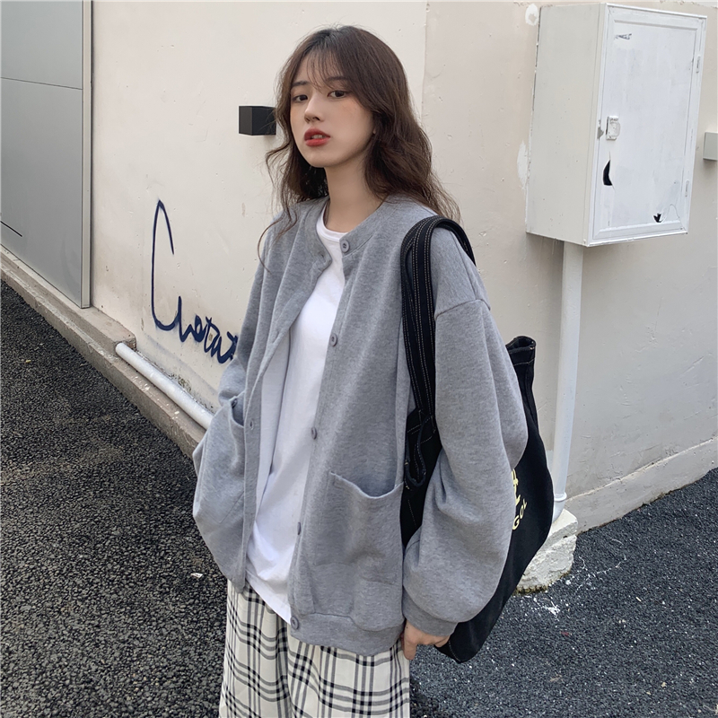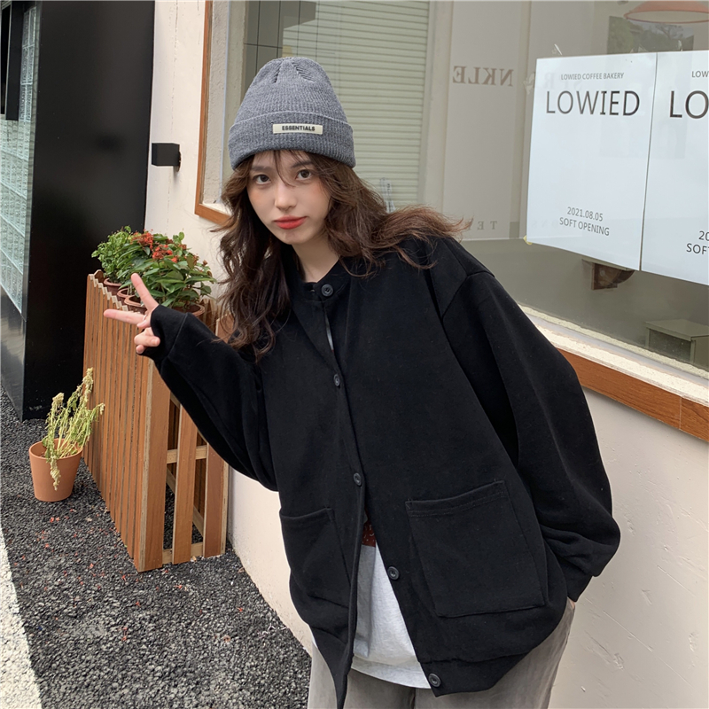 設計感削肩衛衣女秋新款排扣開衫薄款外套學生寬鬆純色藏肉上衣服