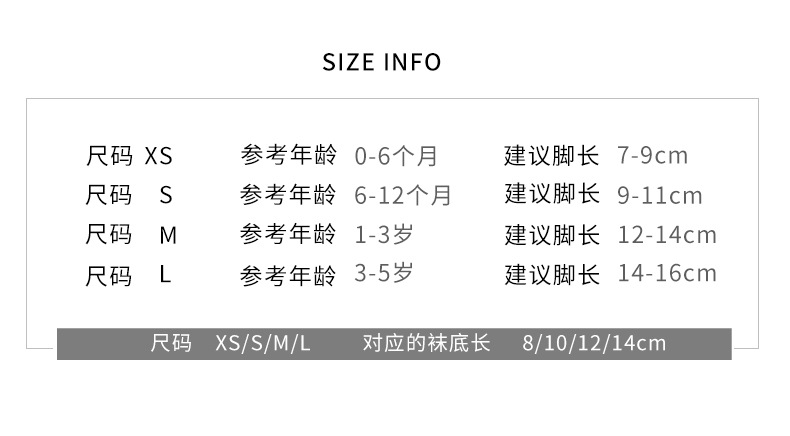 童袜尺码 XS码0-6个月,S码6-12个月,M码1-3岁,L码3-5岁