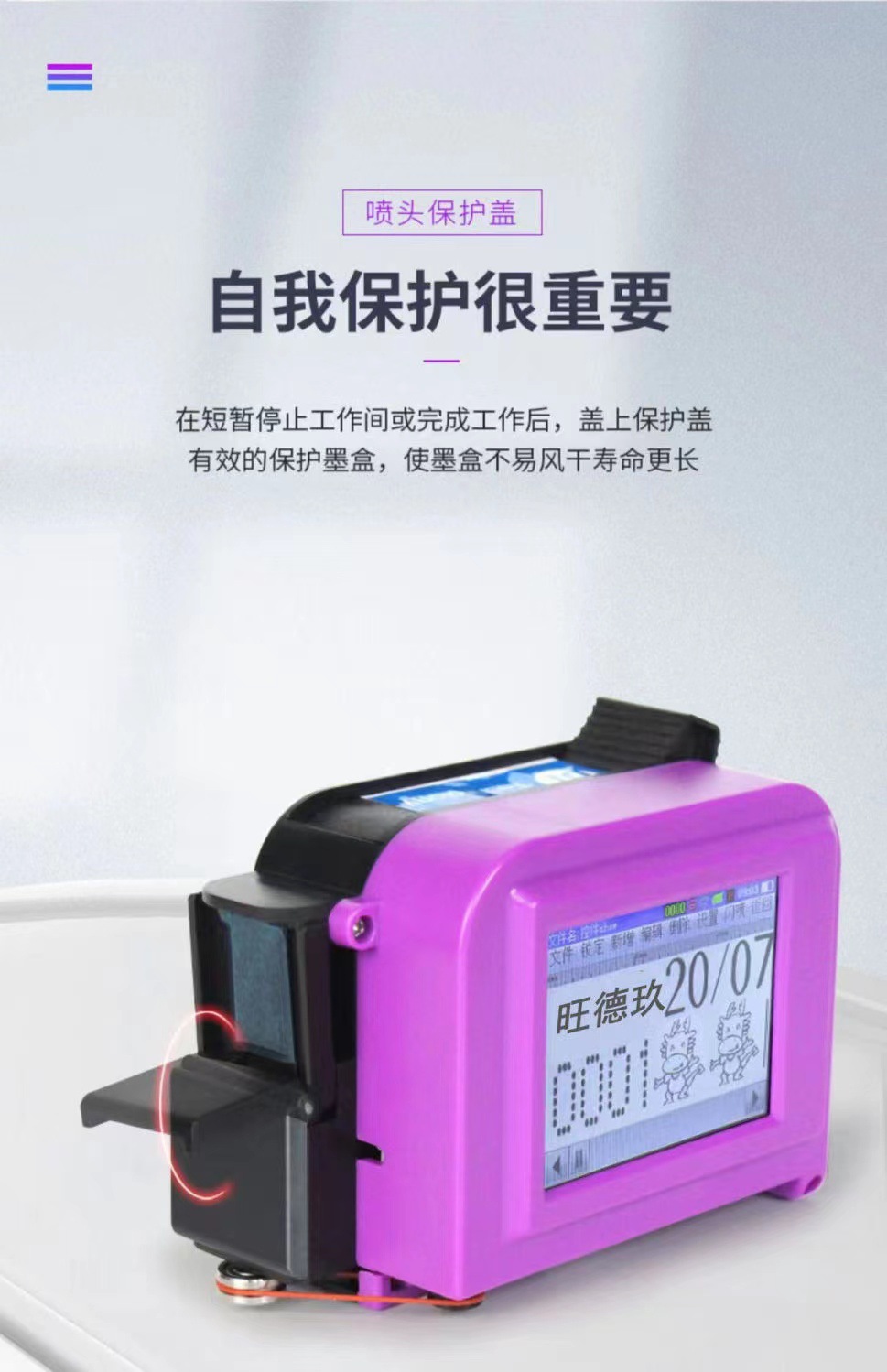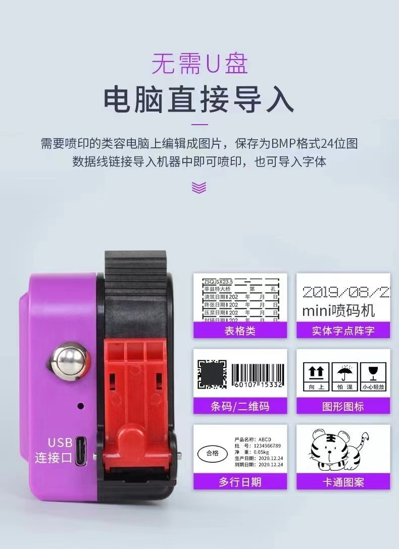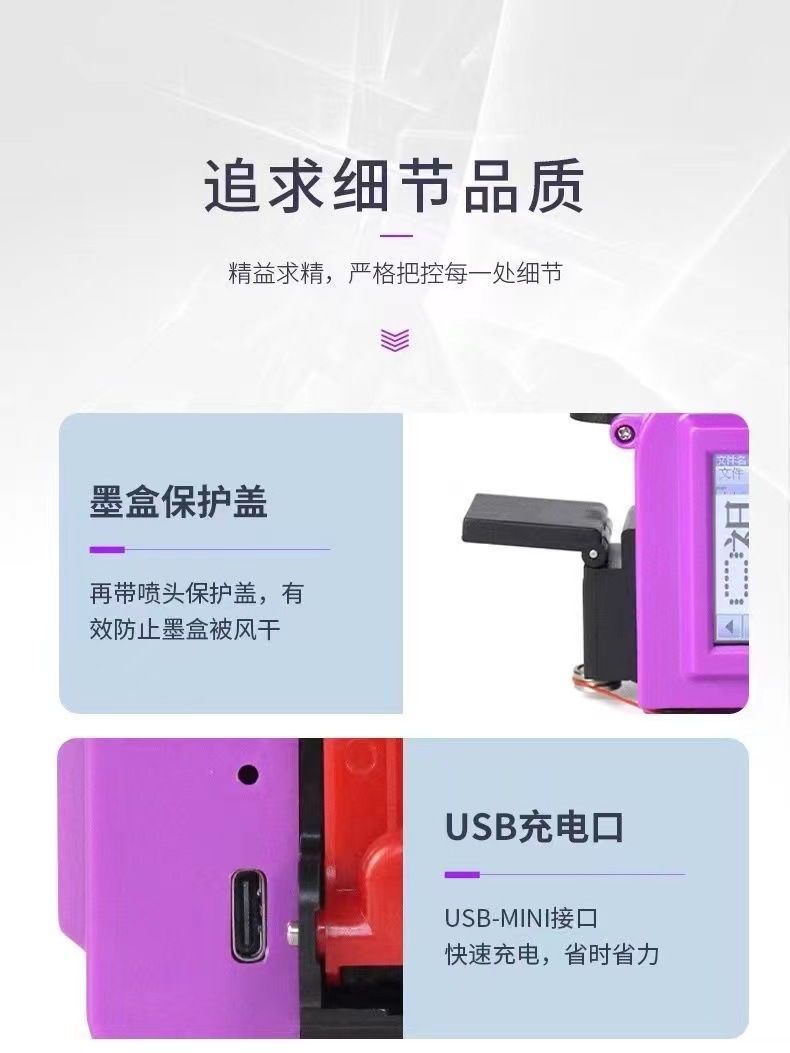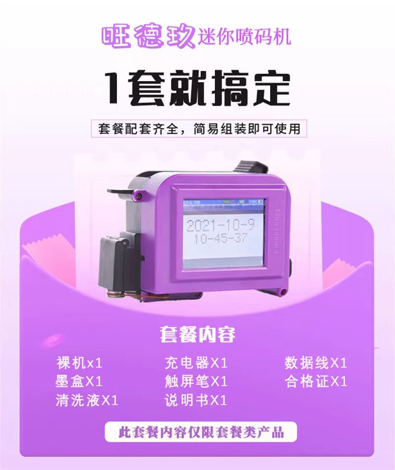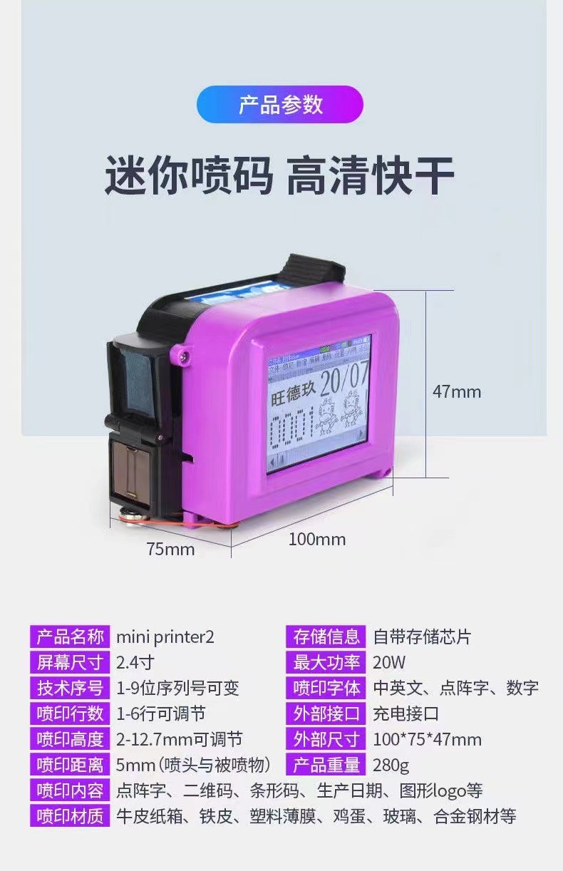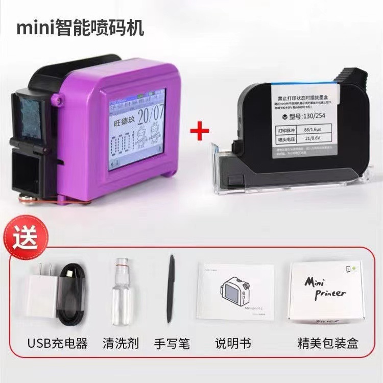 规格 大屏迷你裸机,大屏迷你喷码机+高附着墨盒,大屏迷你喷码机+高附着(可加墨)墨盒,大屏迷你喷码机+(红蓝黄绿)色墨盒选其一,大屏迷你喷码机+可加墨(红蓝黄绿)色墨盒选其一,大屏迷你喷码机+白色墨盒,25.4毫米喷码机+高附着墨盒,一个高附着墨盒