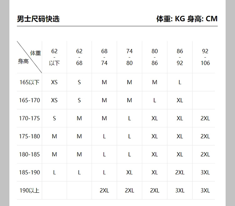 尺碼 165/88A/XS 170/92A/S 175/96A/M 180/100A/L 185/104A/XL 190/108A/XXL 195/112A/XXXL