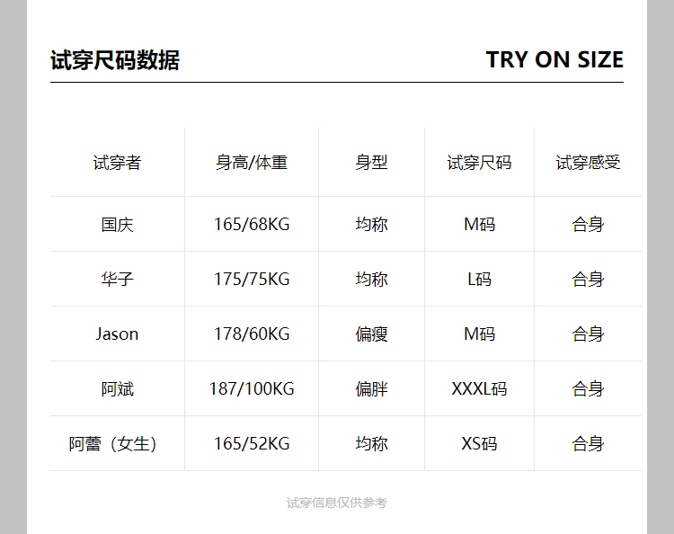 身高/净腰围/尺码 版型注释 肩宽 胸围 衣长 袖长