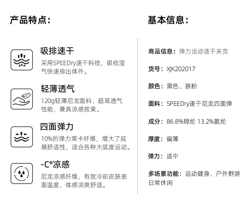 顏色分類 尺碼推薦(點擊左上圖片,查看大圖) 全球95國暢銷+3大國際認證+專業戶外20年 收藏加購,贈運費險+30天無理由退換 --------以下爲春夏款------ 黑色(彈力夾克) 膚粉色(透氣薄款外套) --------以下爲秋冬厚款------ 單殼黑色(軟殼衝鋒衣) --------以下爲三合一款式------ 三合一黑色(抓絨衣內膽)
