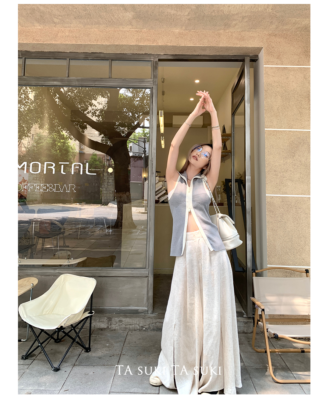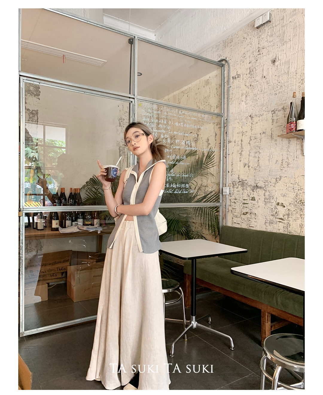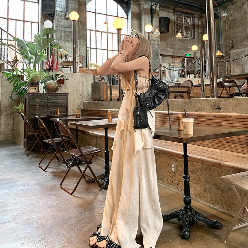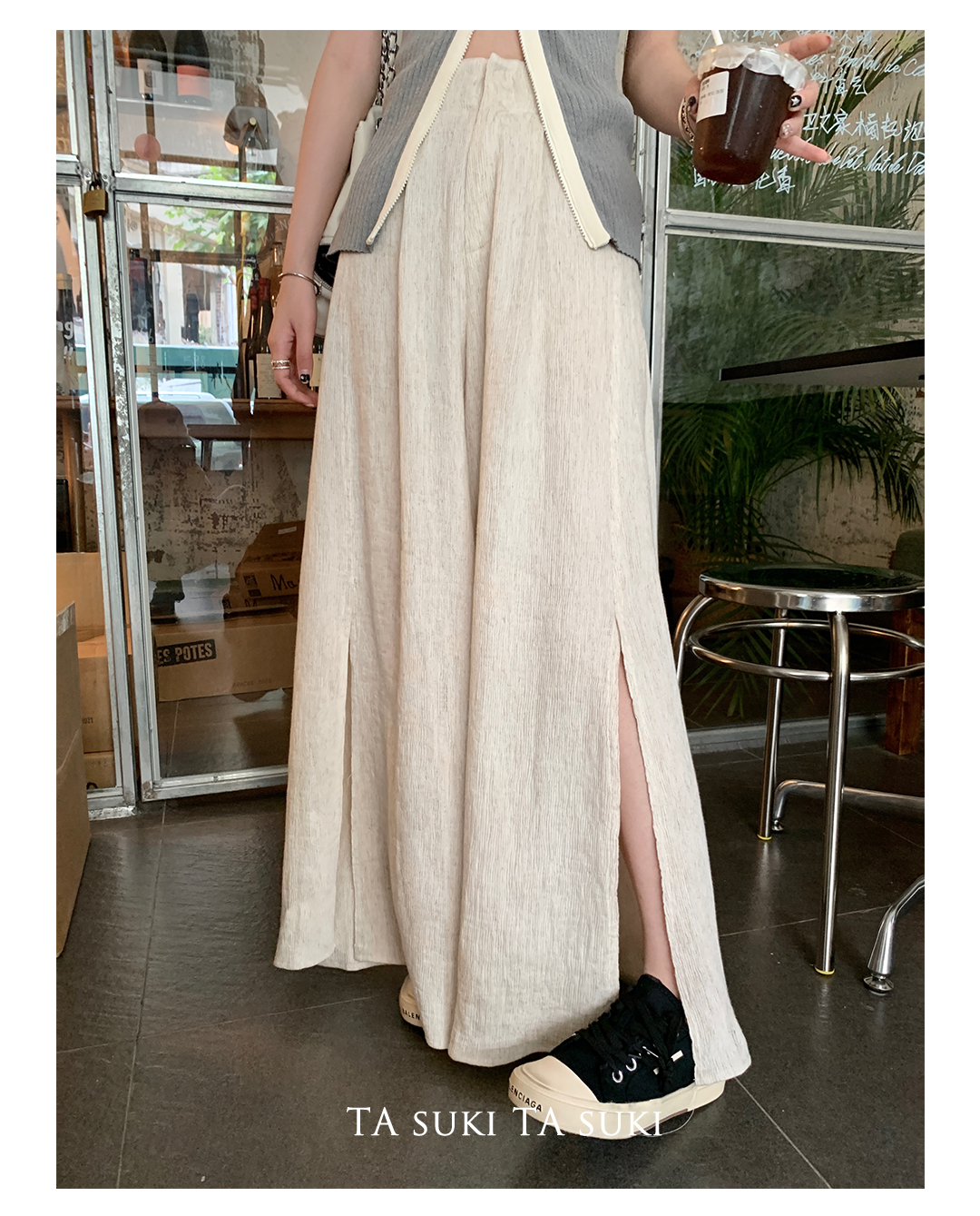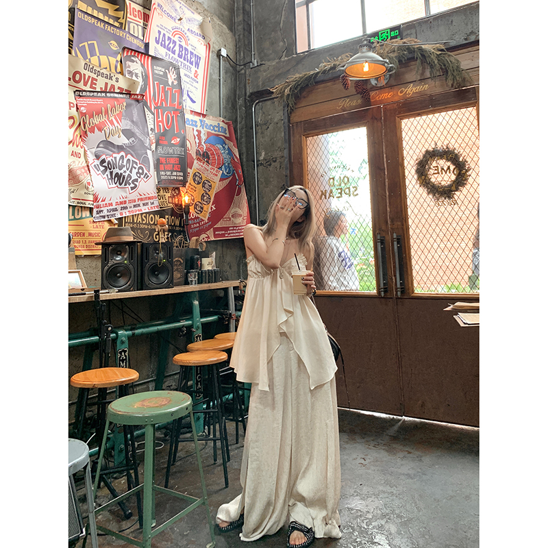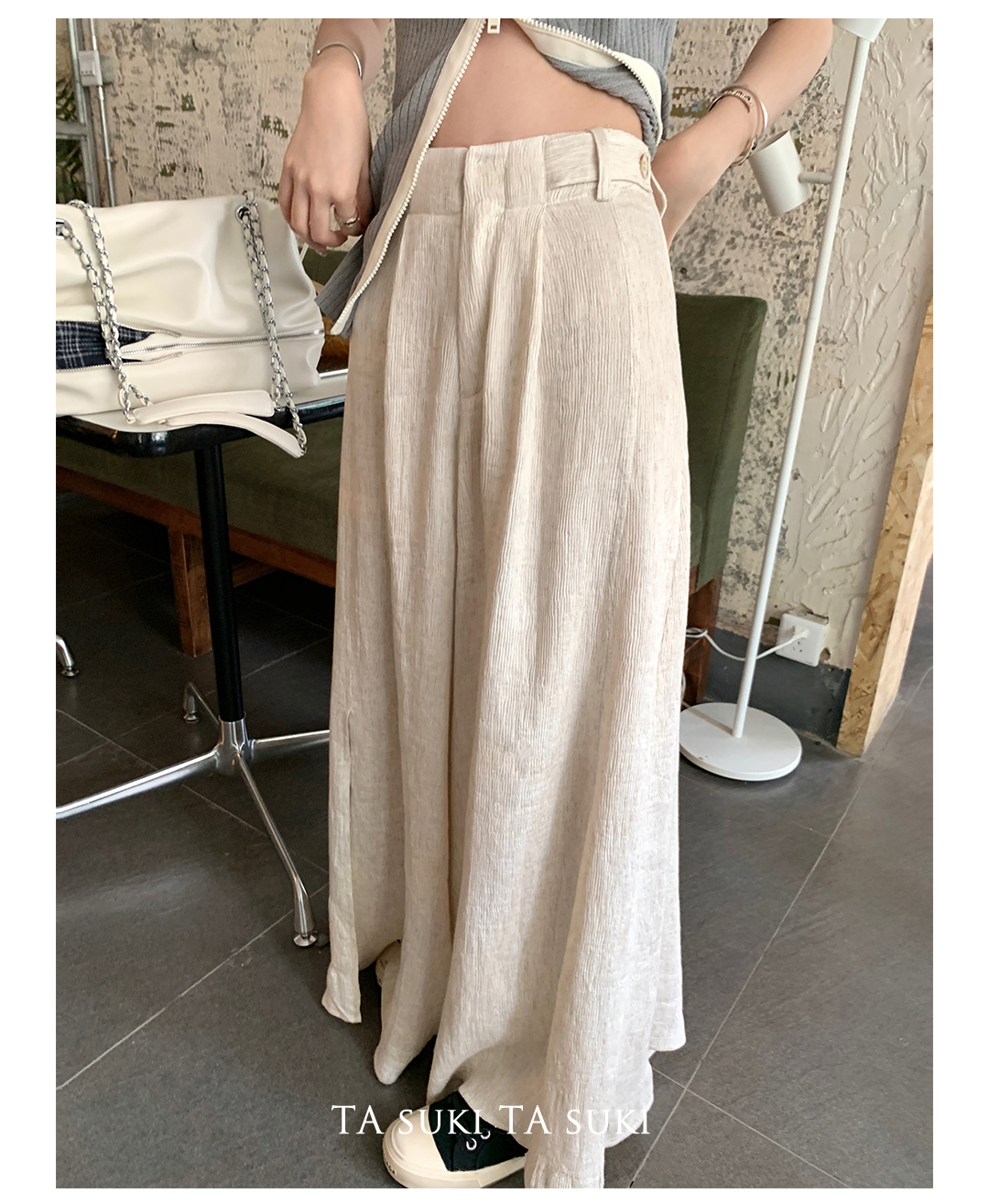 TA suki 夏季杏色 亞麻感闊腿褲高腰顯瘦休閒慵懶風設計感拖地褲