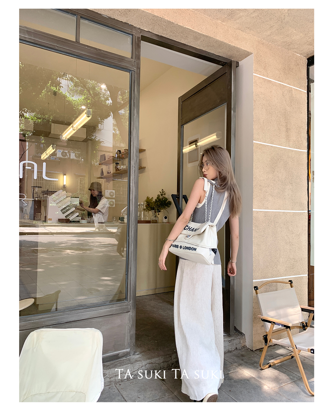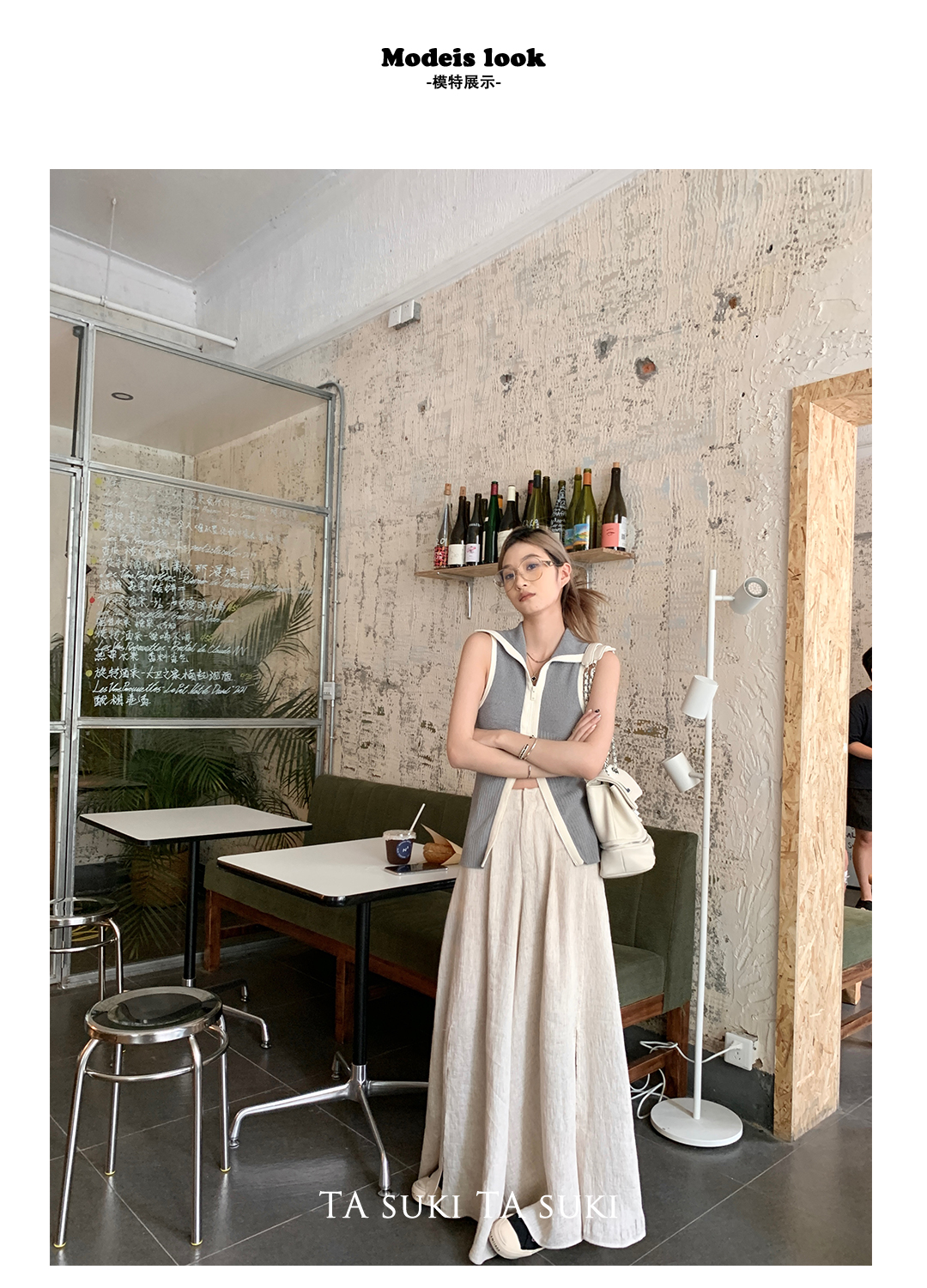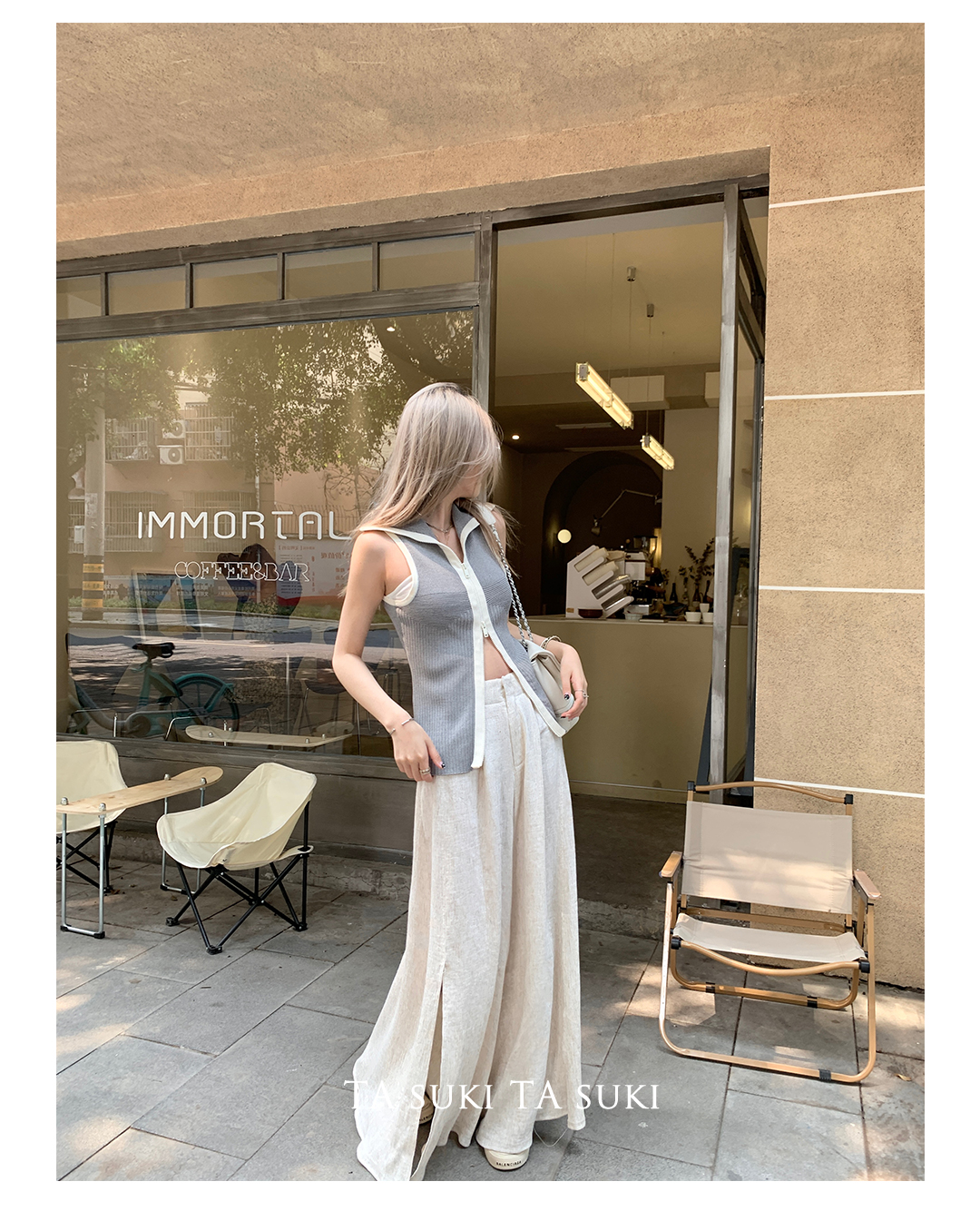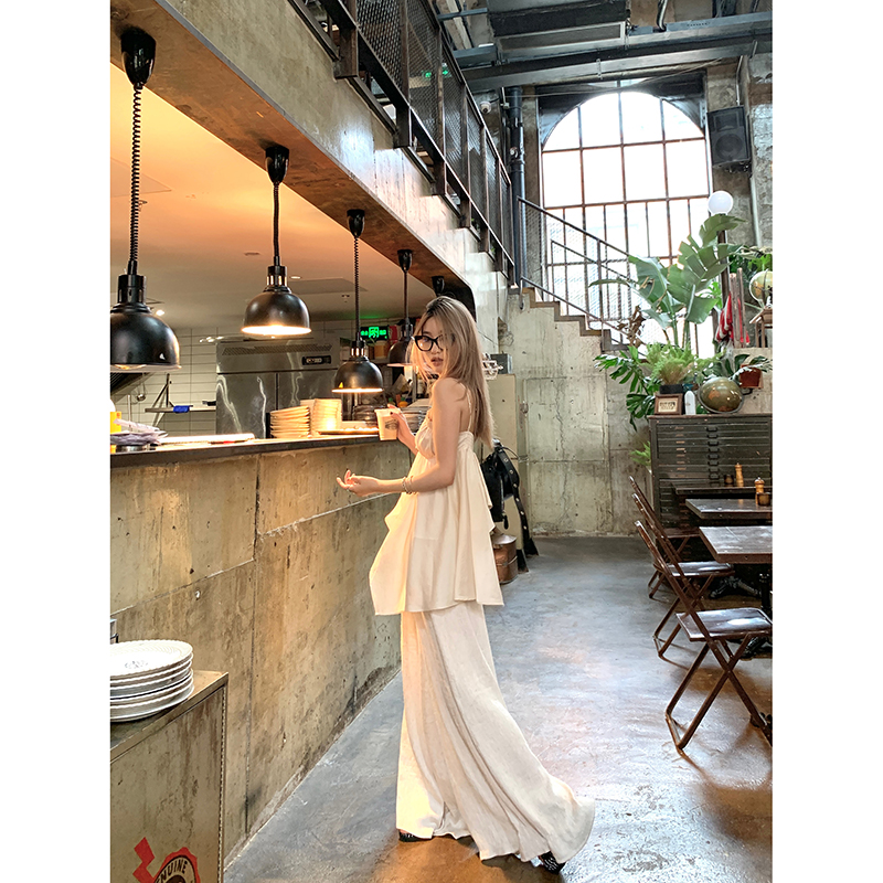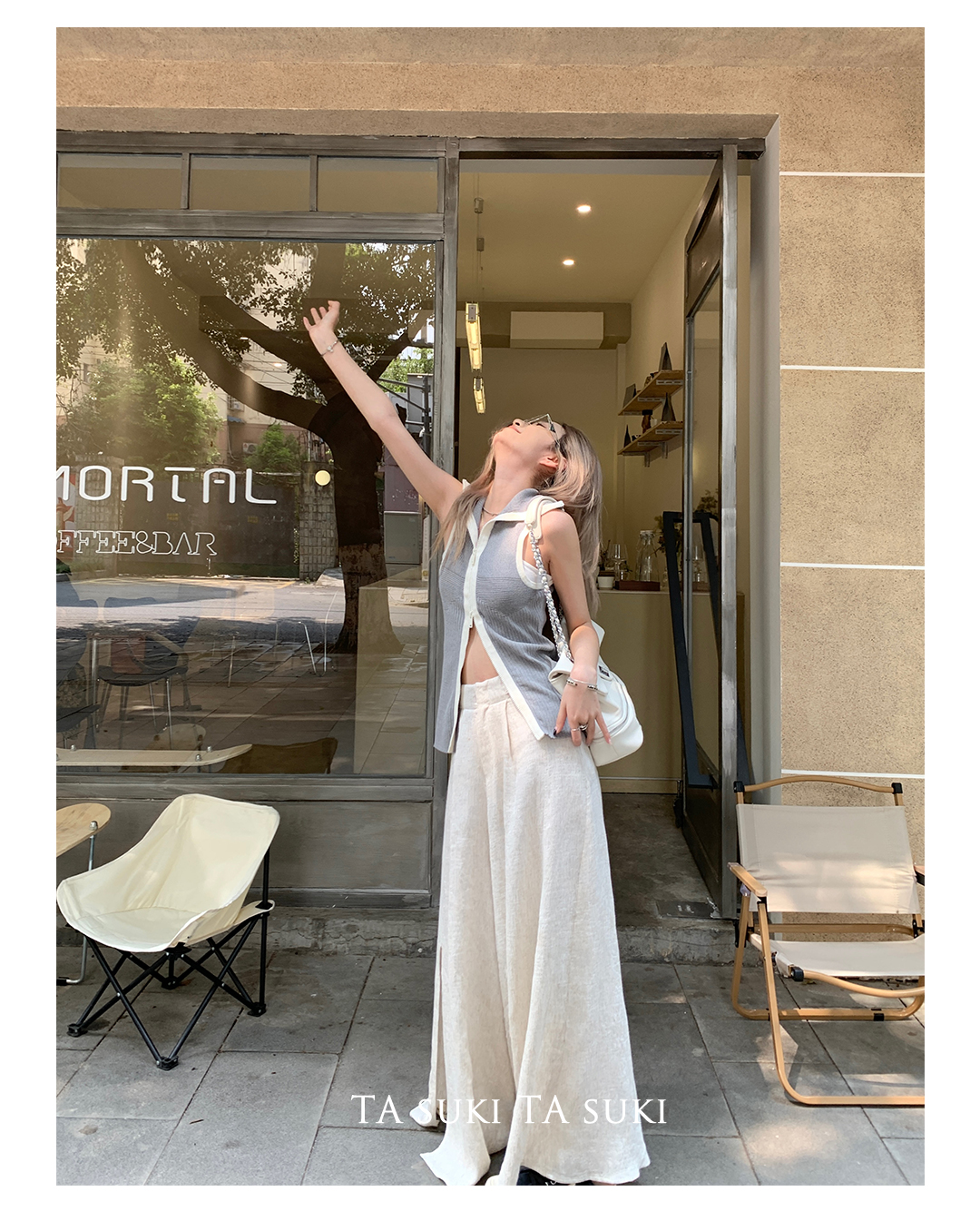 TA suki 夏季杏色 亞麻感闊腿褲高腰顯瘦休閒慵懶風設計感拖地褲