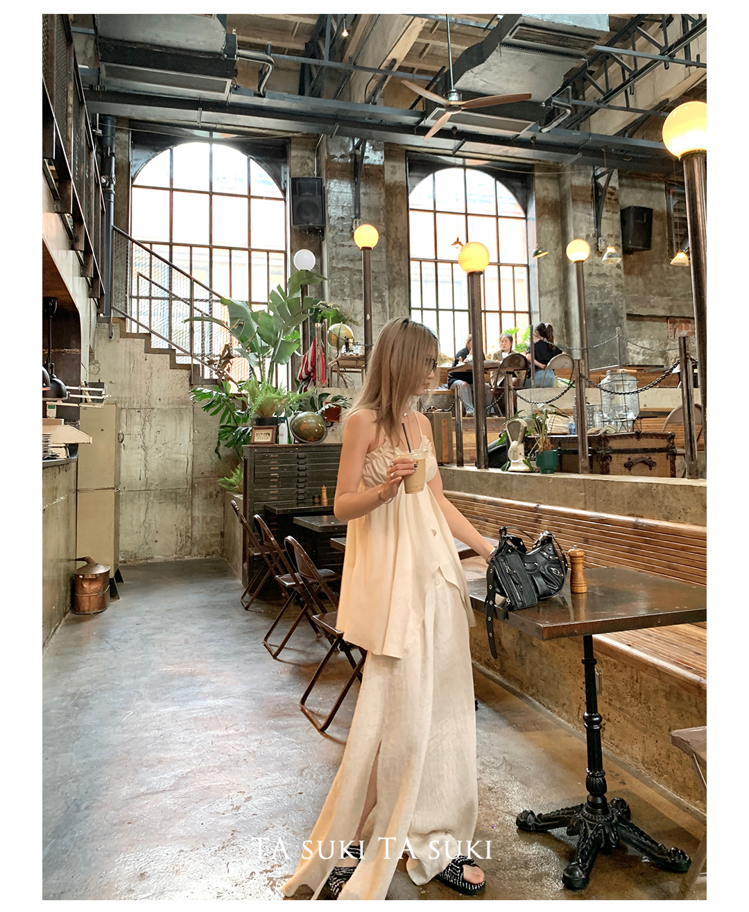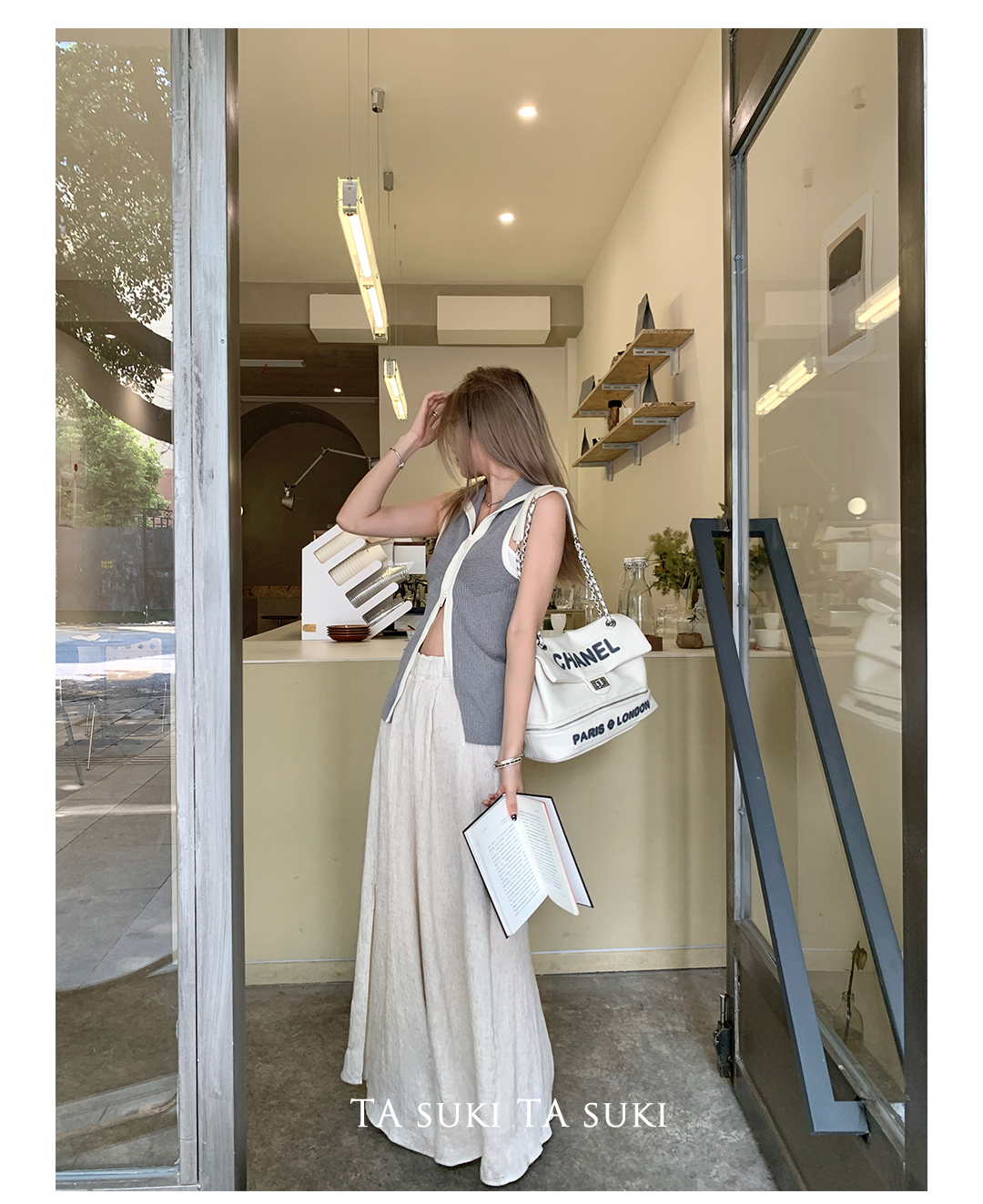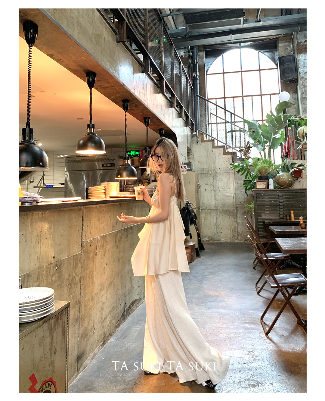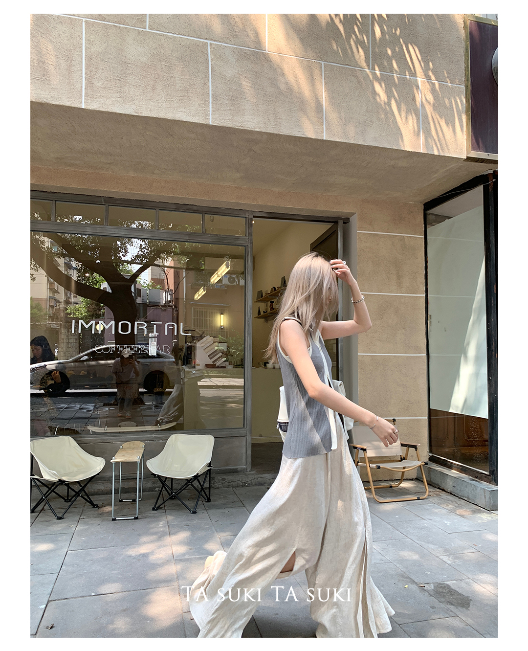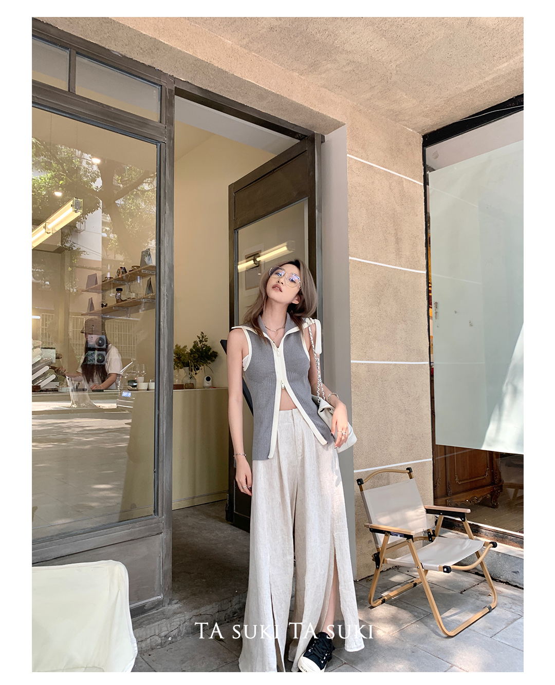 TA suki 夏季杏色 亞麻感闊腿褲高腰顯瘦休閒慵懶風設計感拖地褲