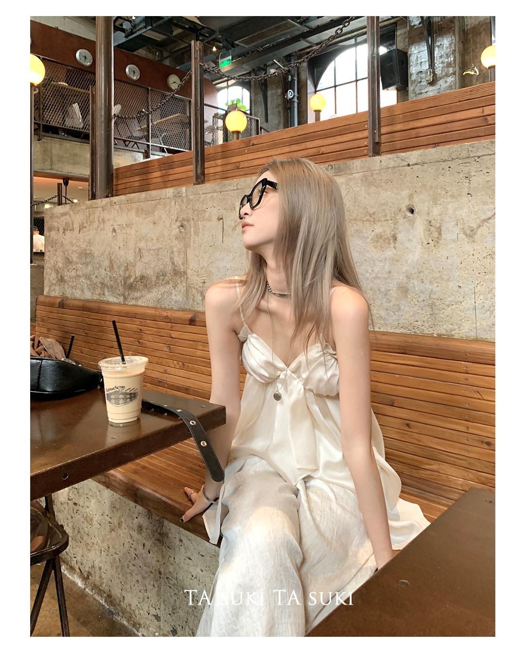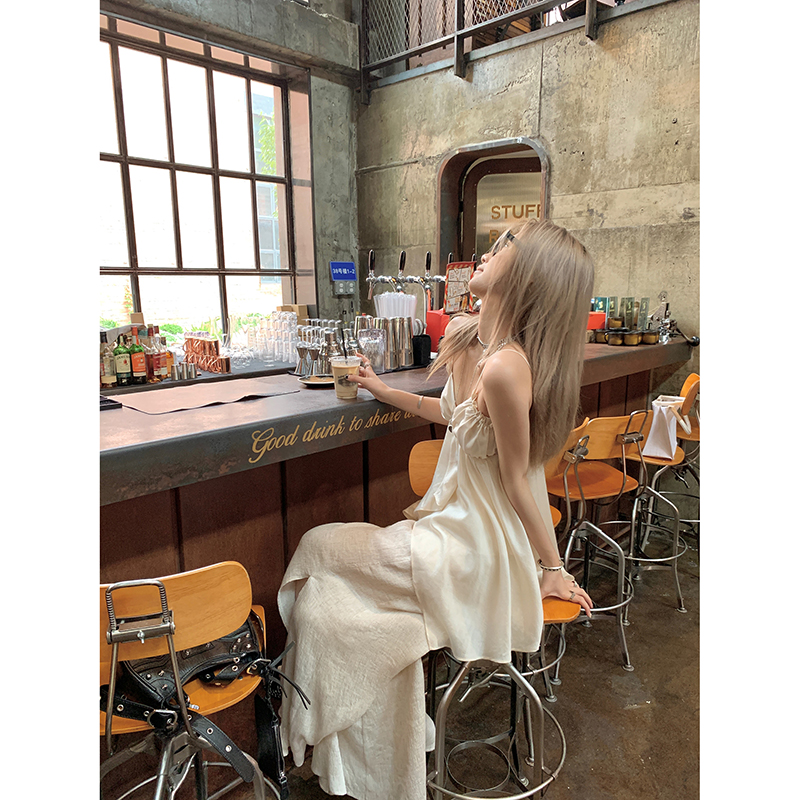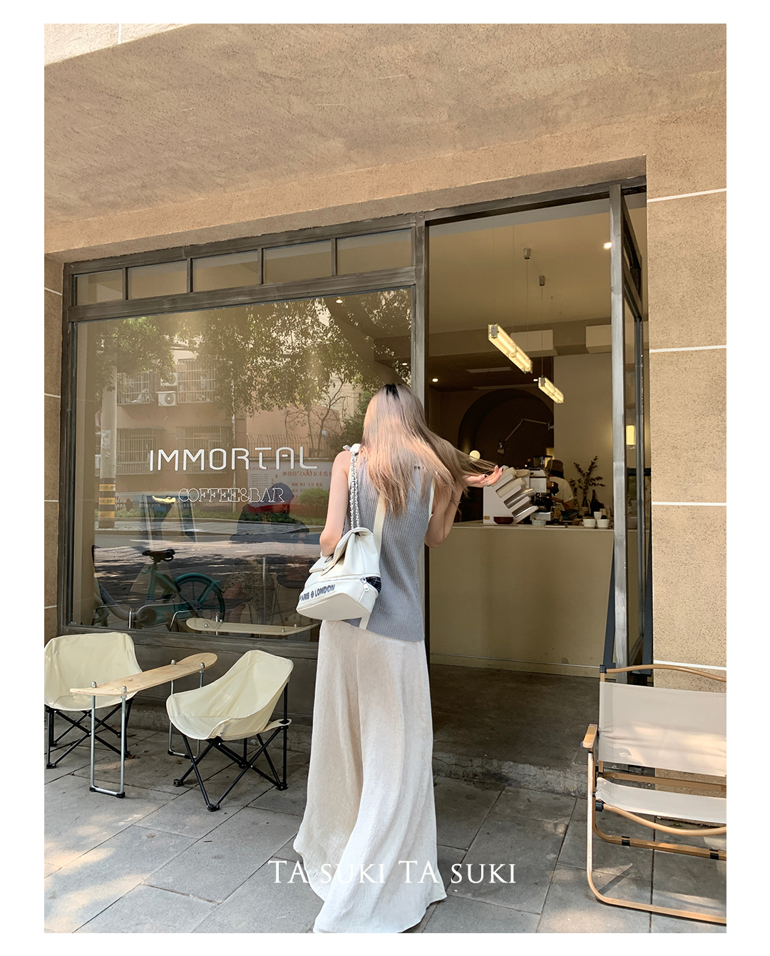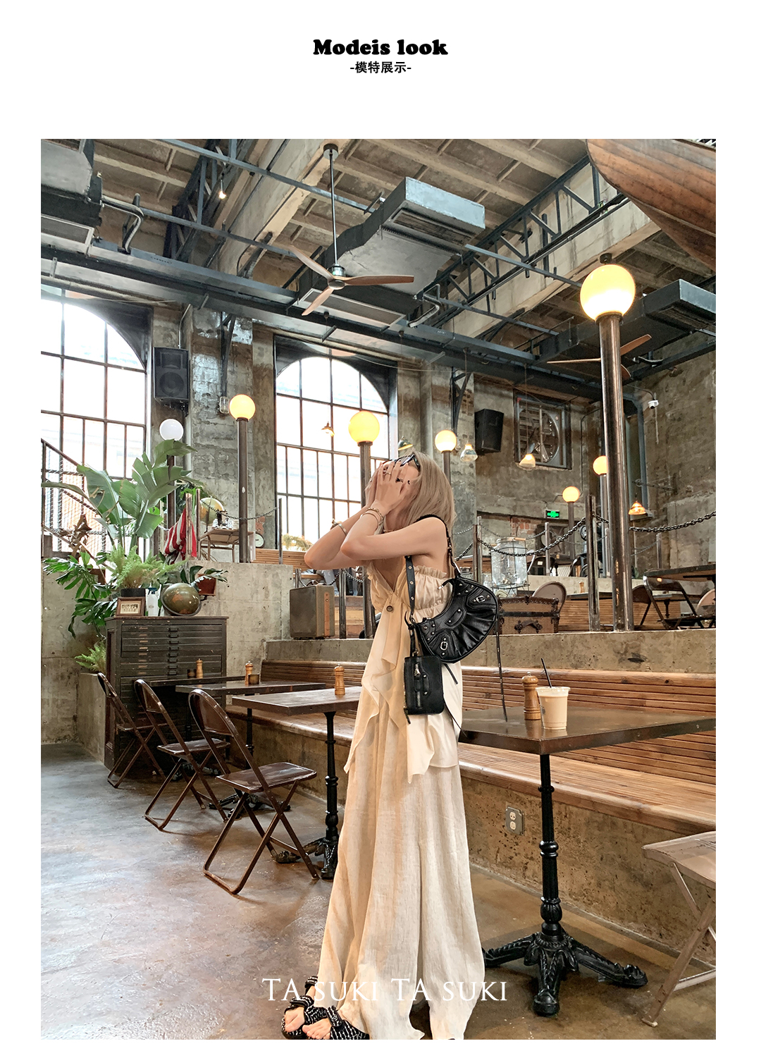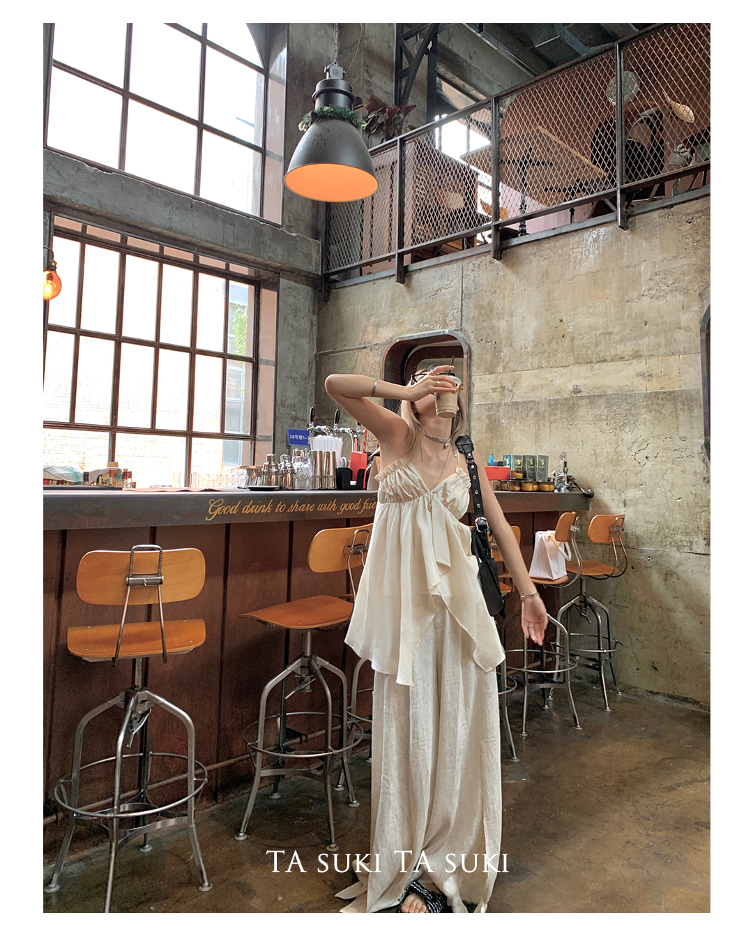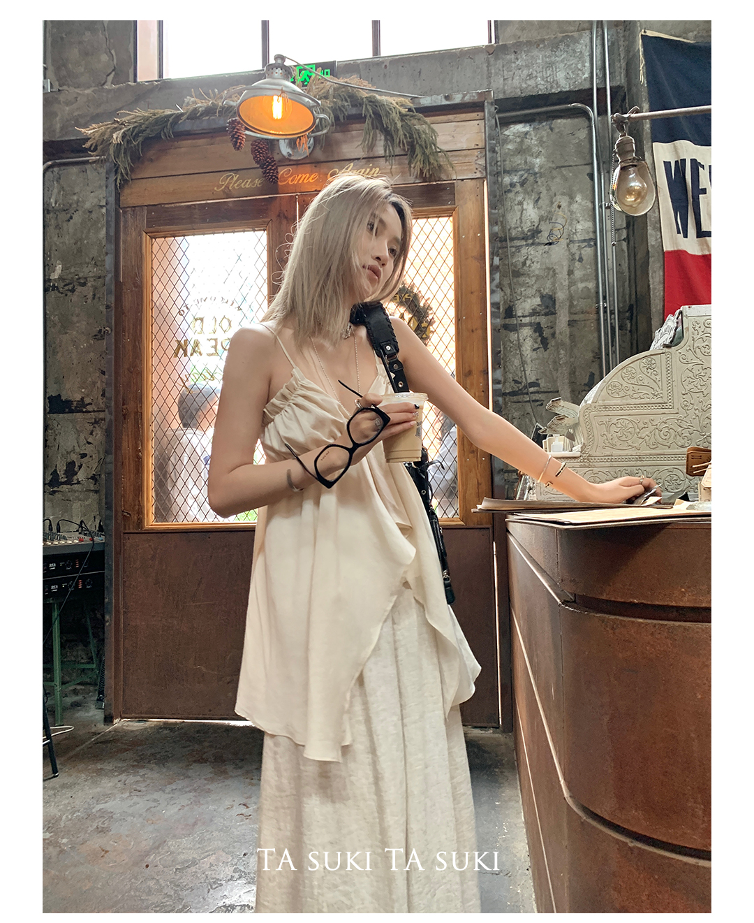 TA suki 夏季杏色 亞麻感闊腿褲高腰顯瘦休閒慵懶風設計感拖地褲