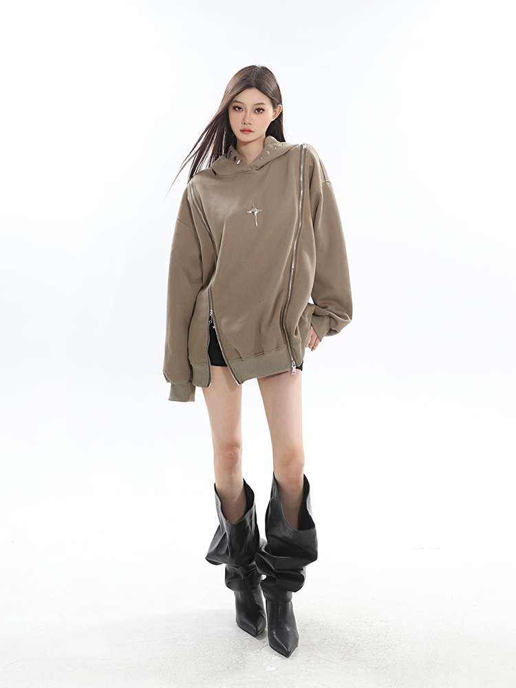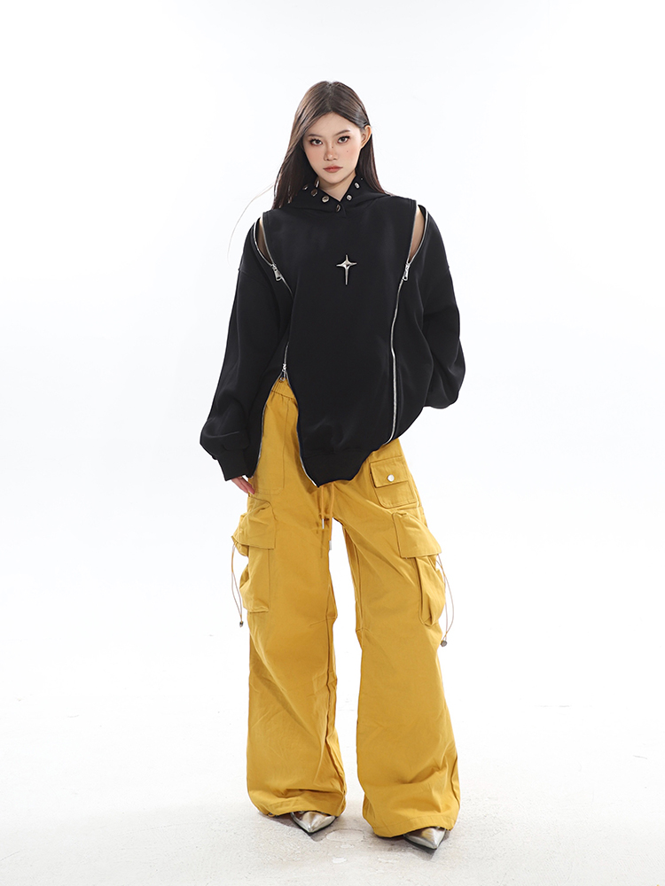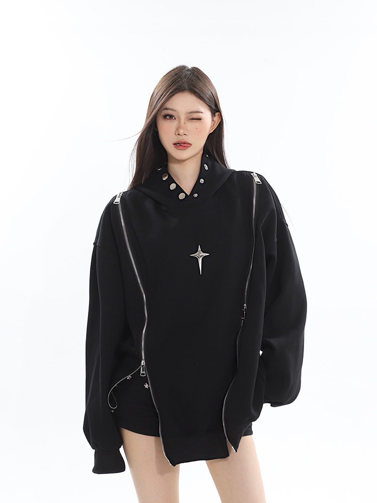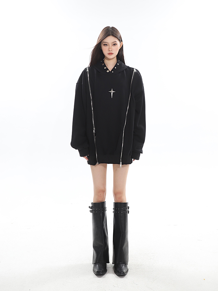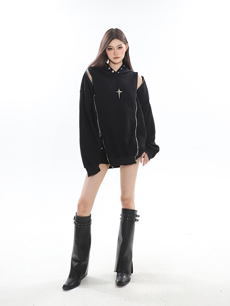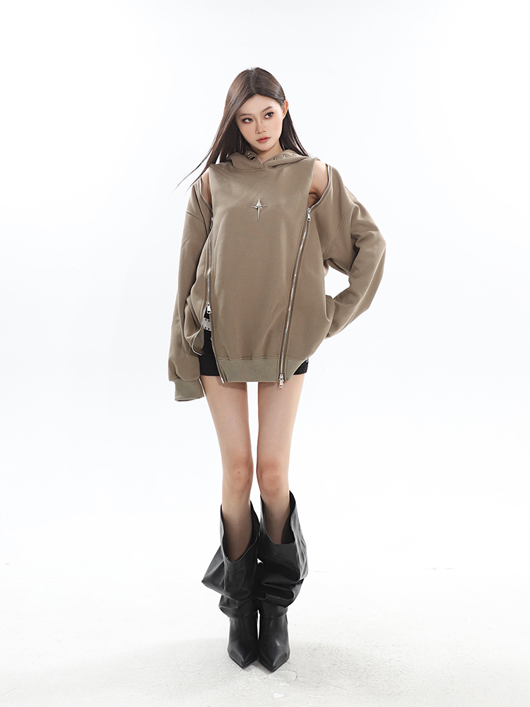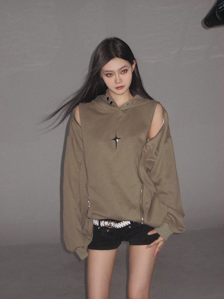 CCUP SAPCE 早秋新款小眾外套雙拉鍊鏤空帽衫設計感露肩連帽運動衫