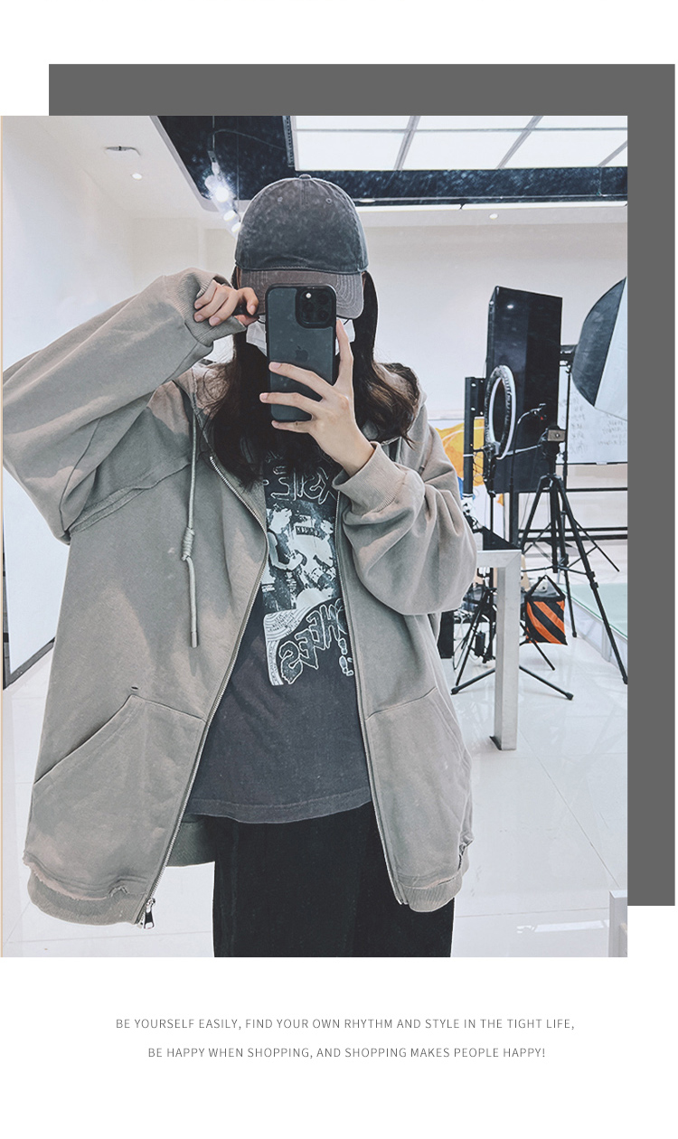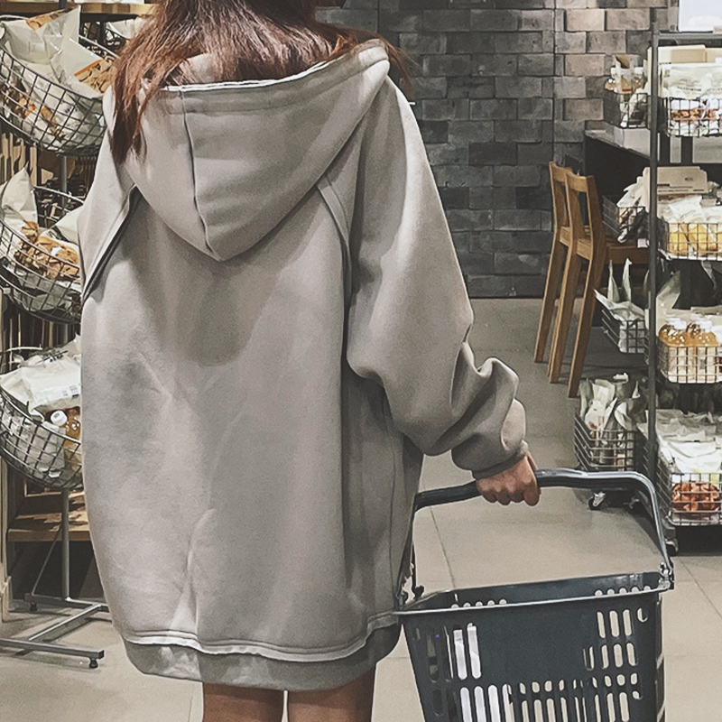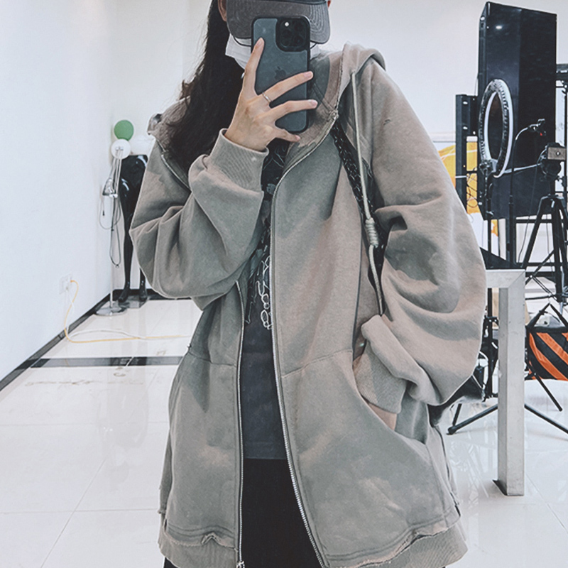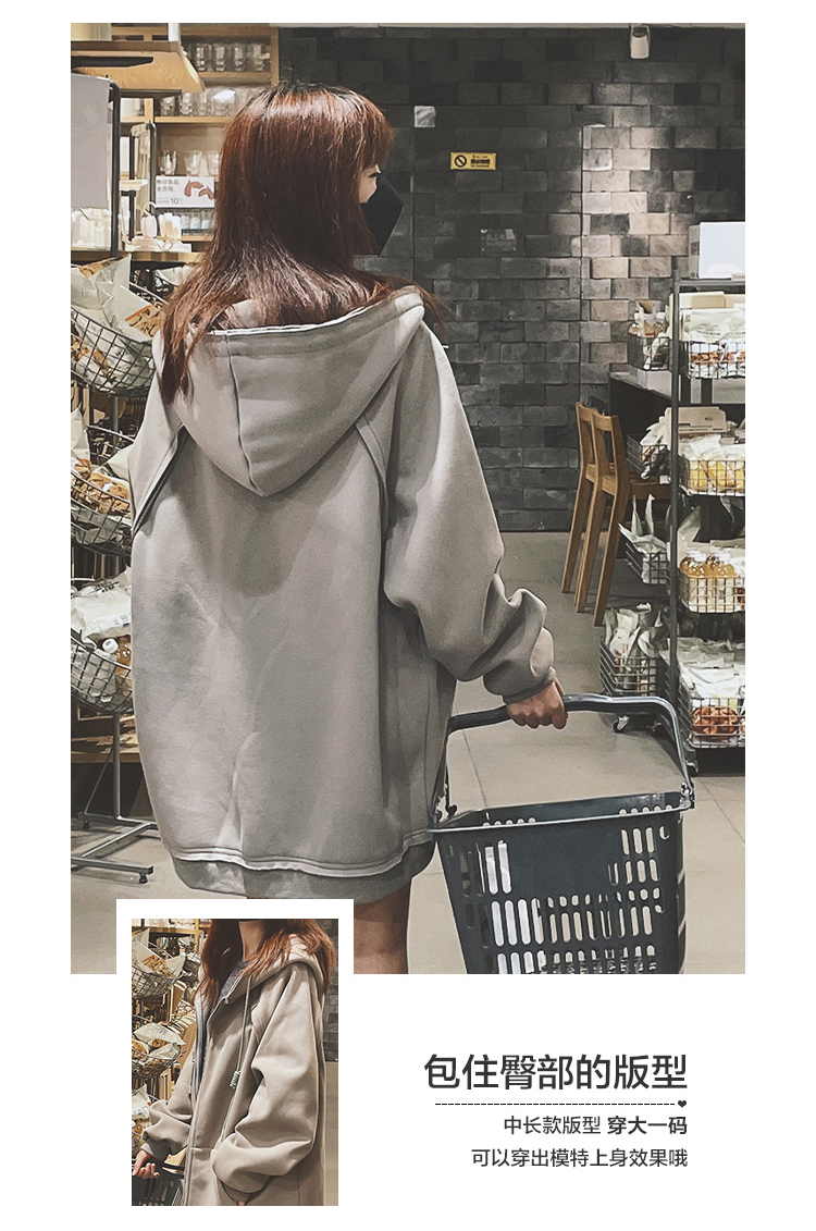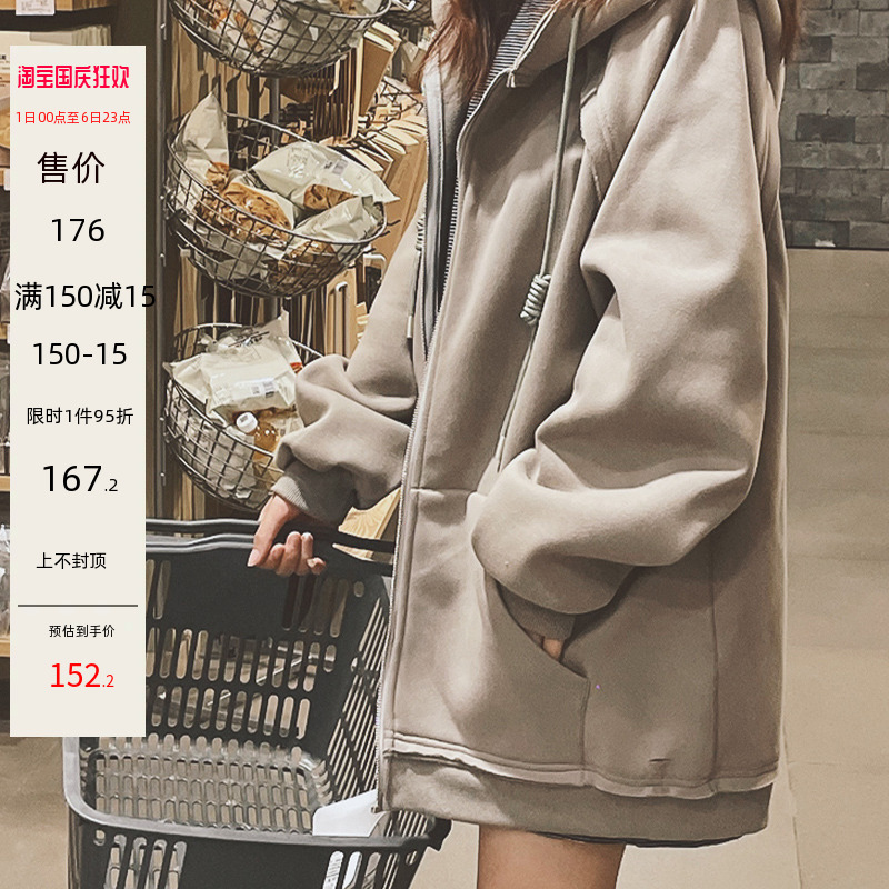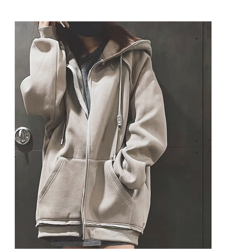 JOYOFAN連帽開衫拉鍊外套衛衣女2023秋季新加絨加厚寬鬆泥土灰色