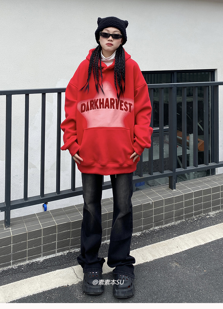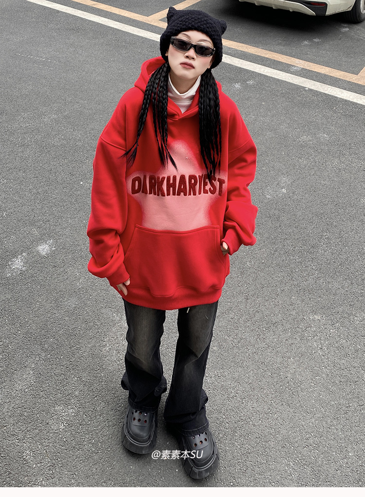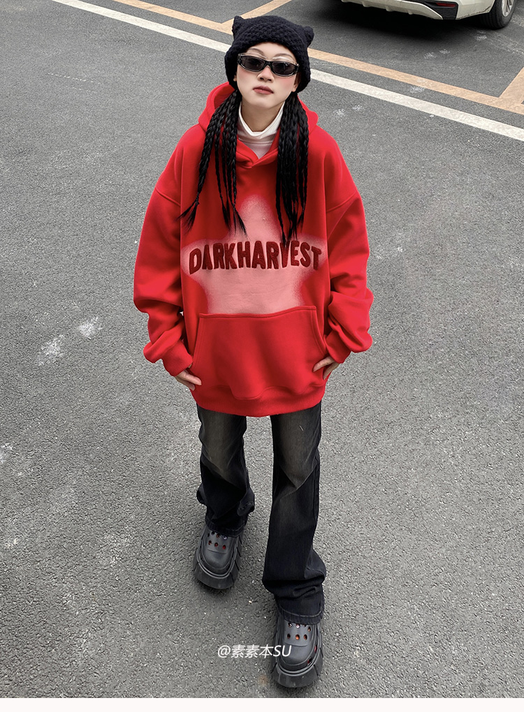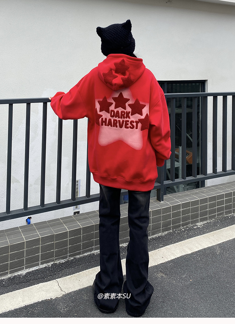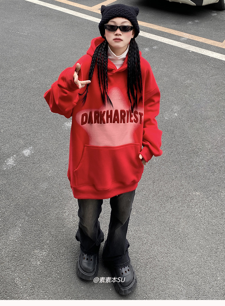 素素本SU美式紅色厚棉T女春秋復古高街oversize設計感國潮連帽上衣