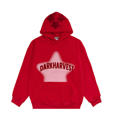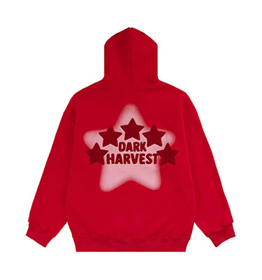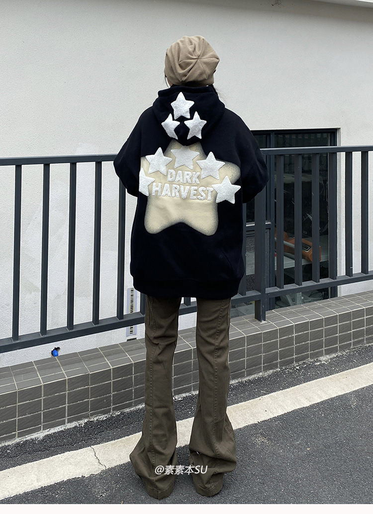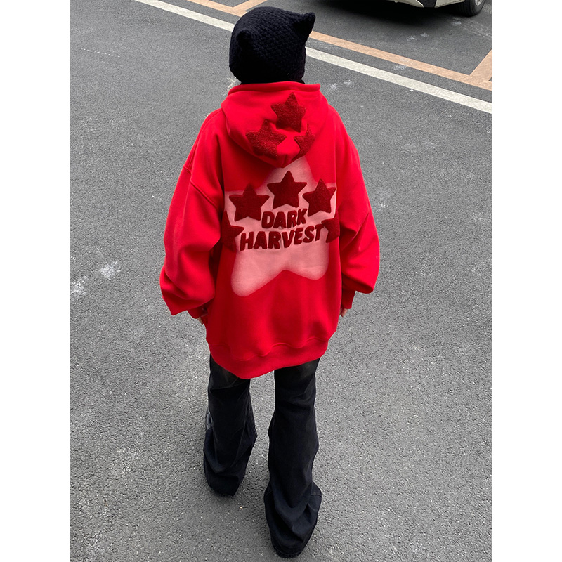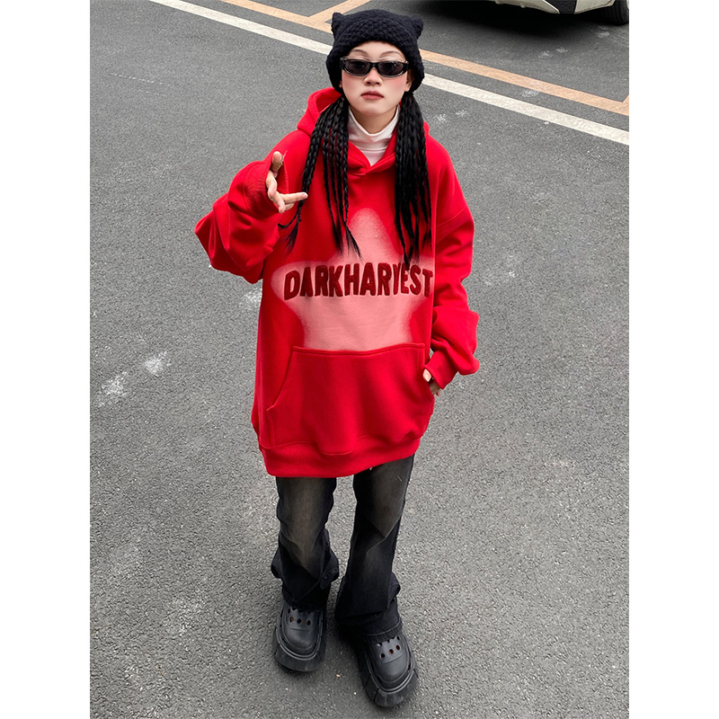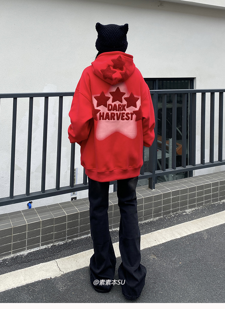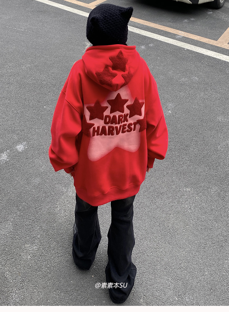 素素本SU美式紅色厚棉T女春秋復古高街oversize設計感國潮連帽上衣