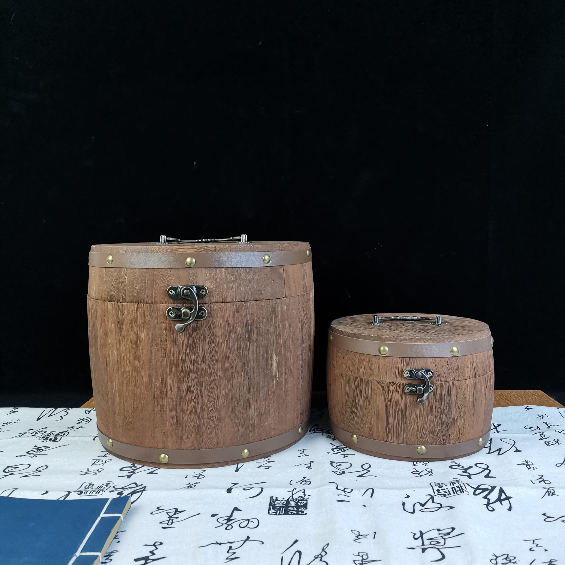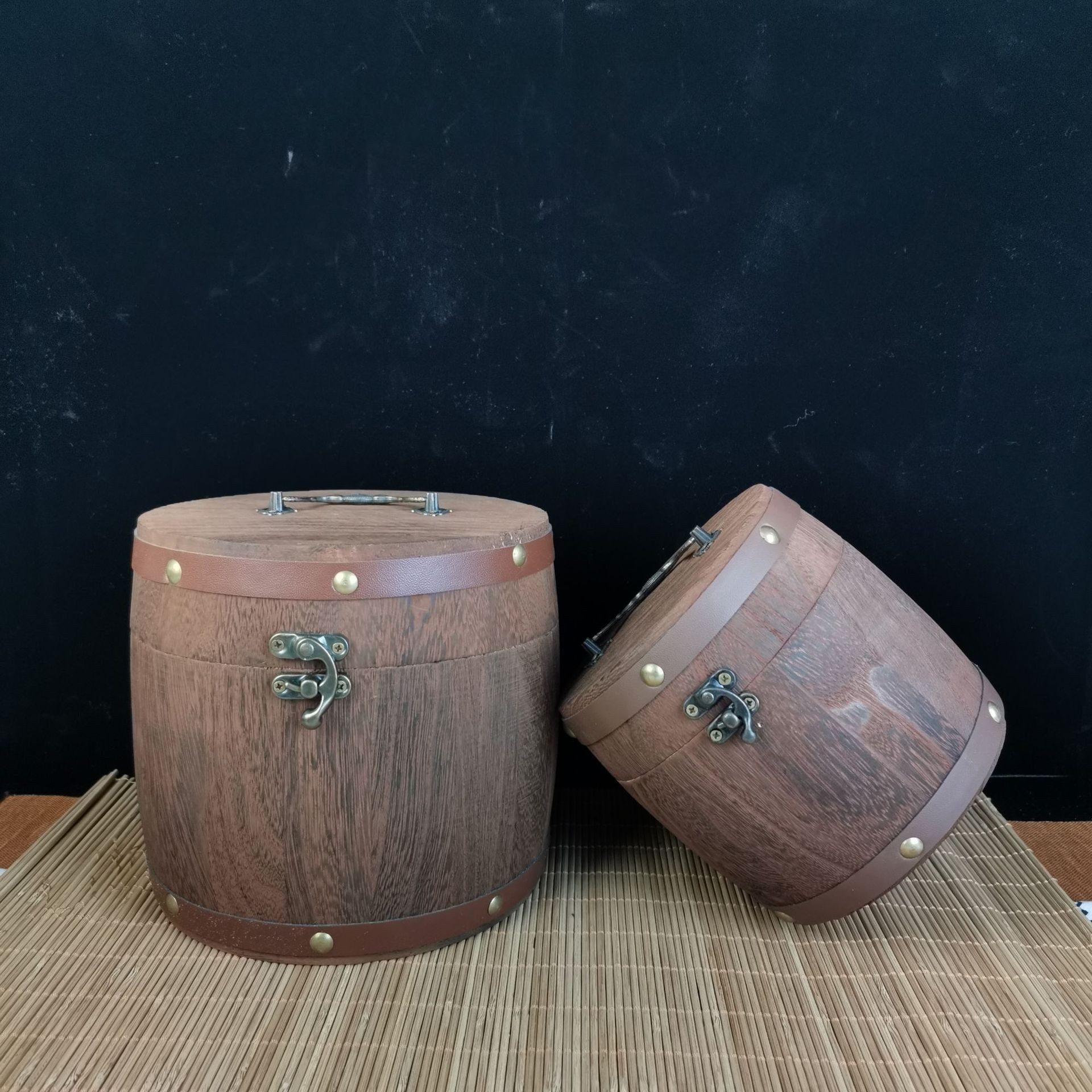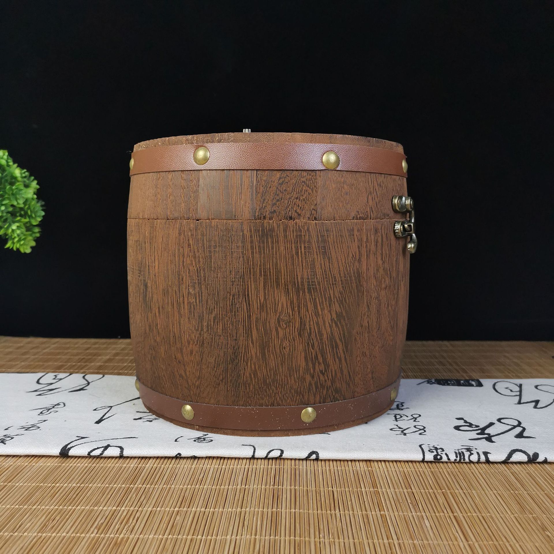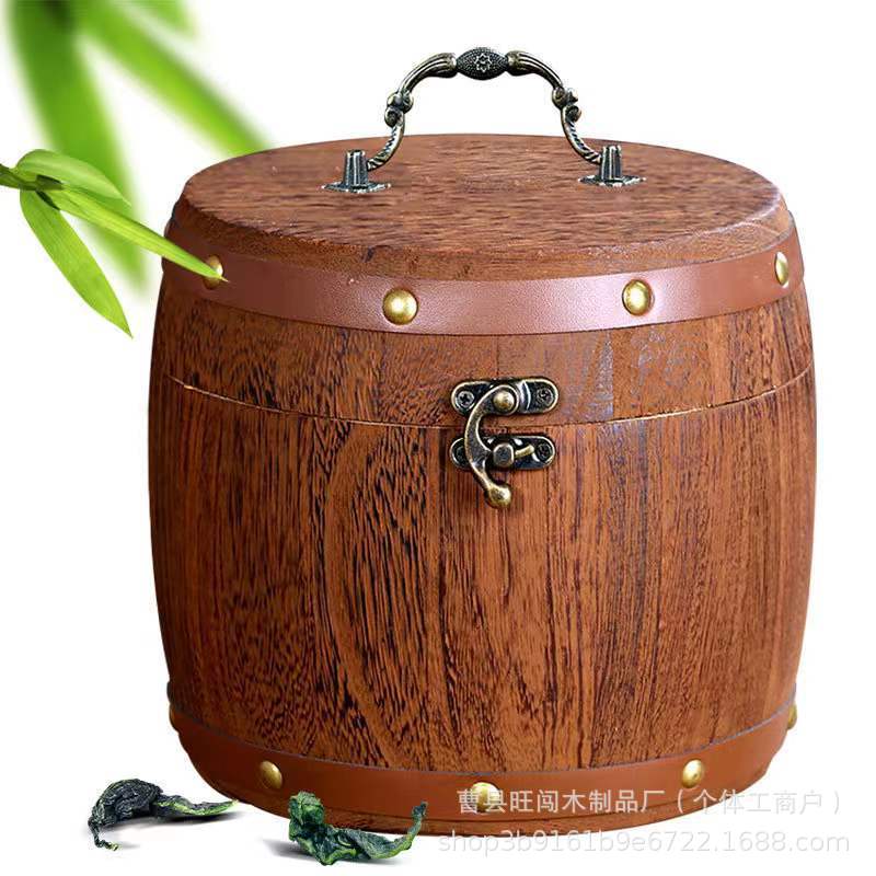 复古带锁炭烧木质茶叶桶家用圆形茶叶木桶可手提木制散茶叶储存桶