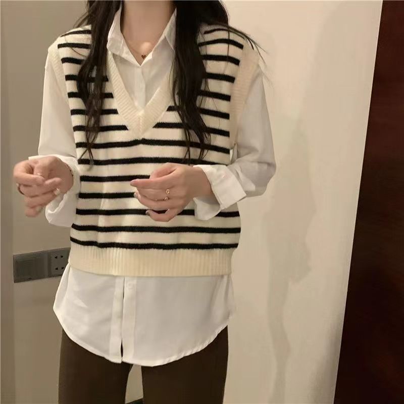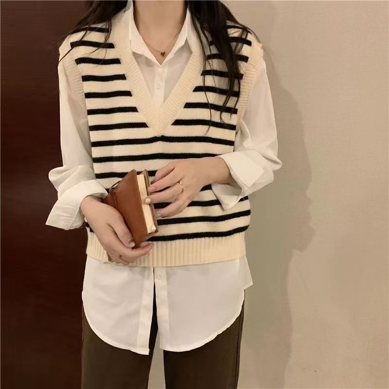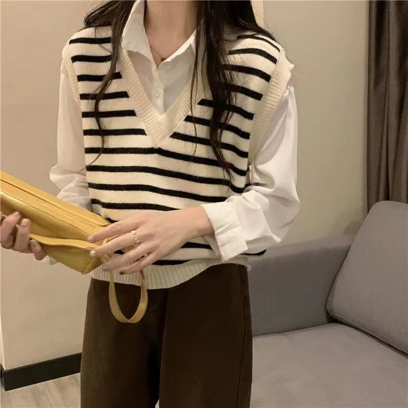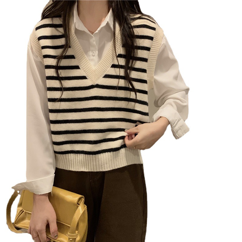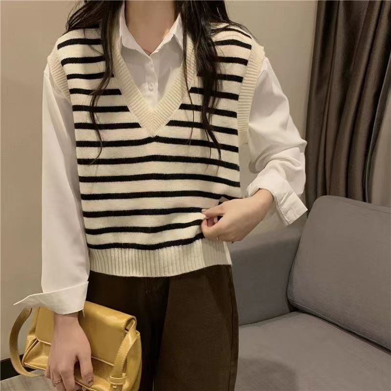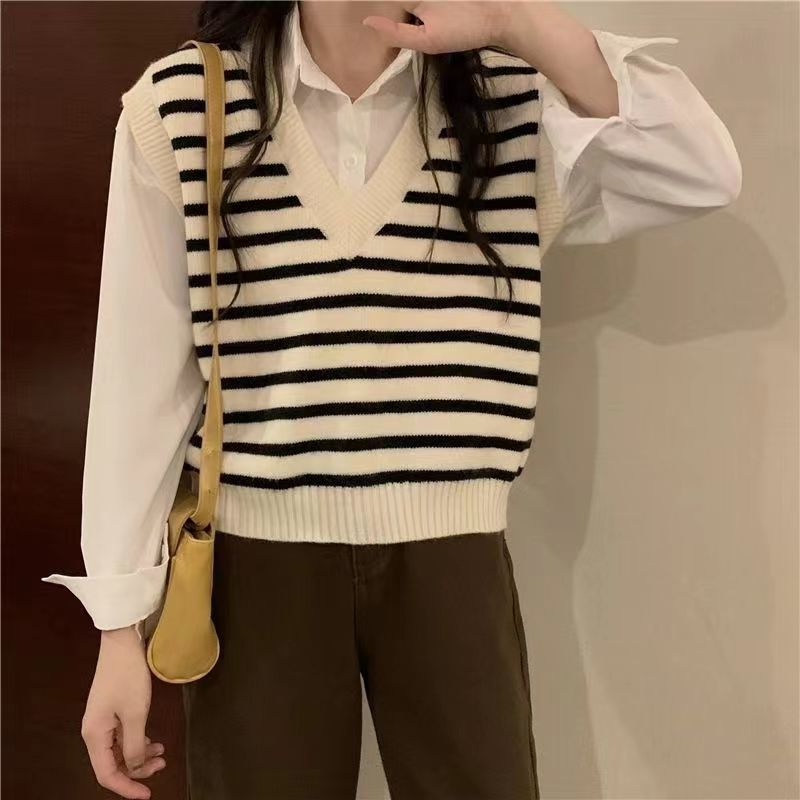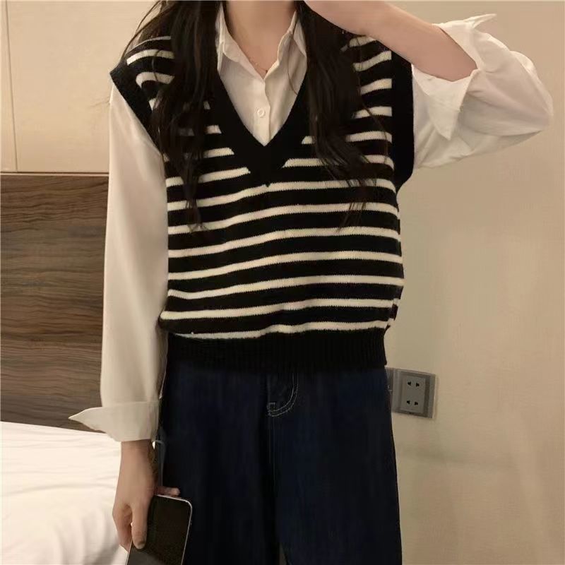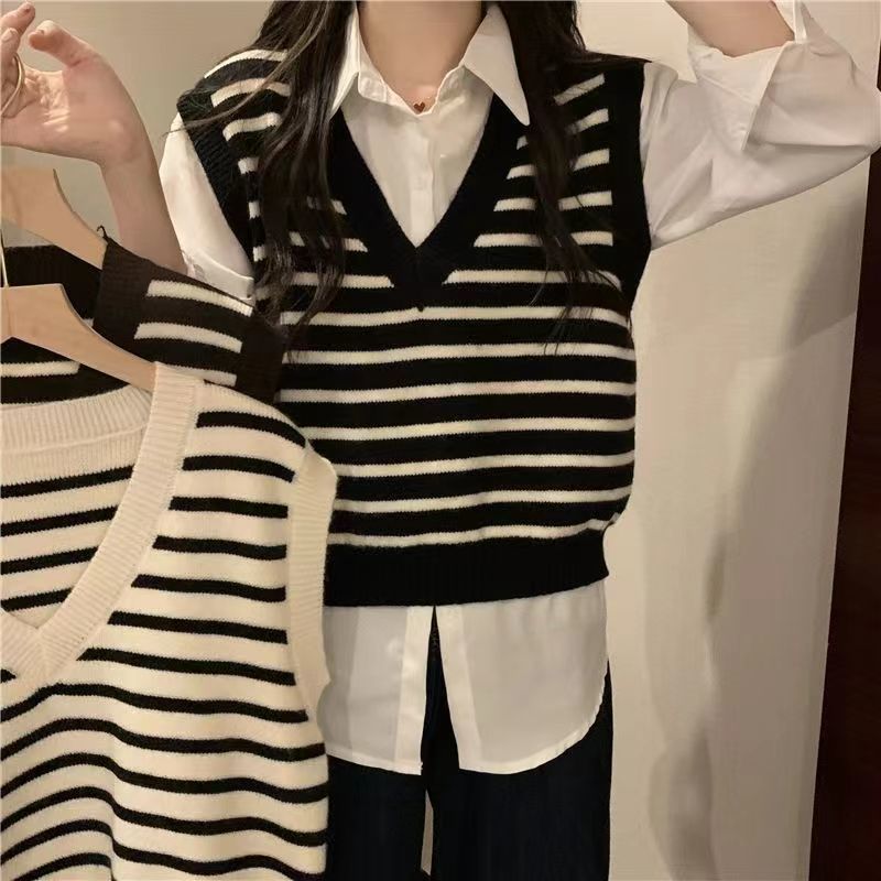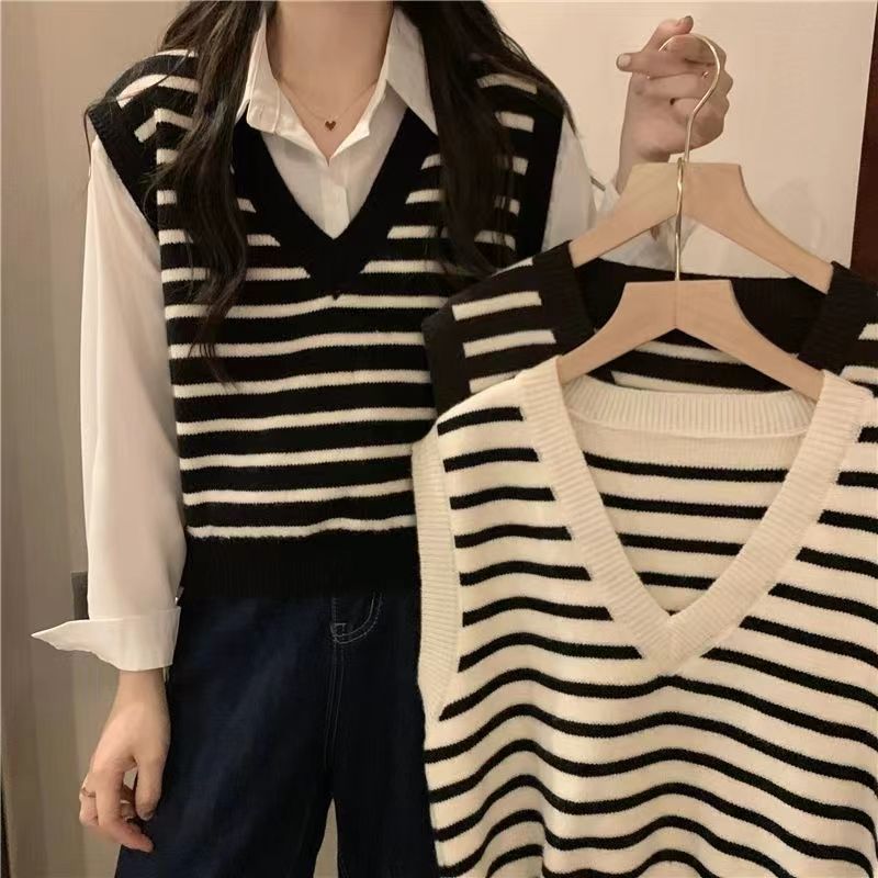 学院风黑白条纹V领休闲马甲背心针织衫女2022秋宽松坎肩毛衣ins潮