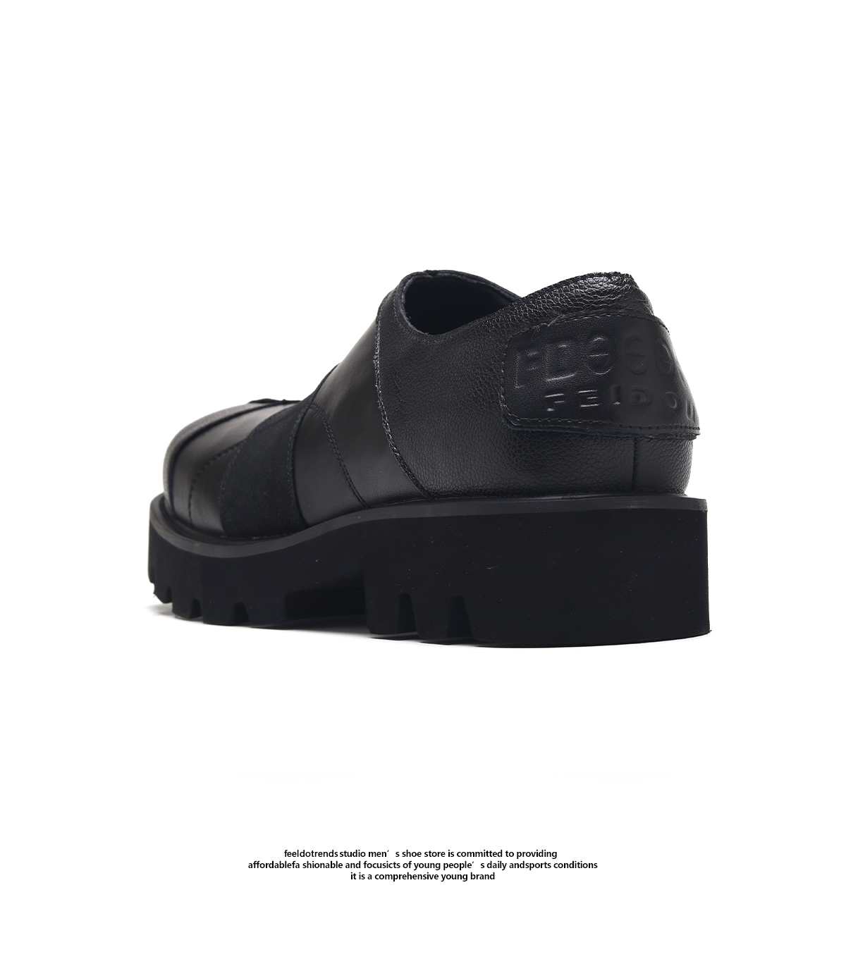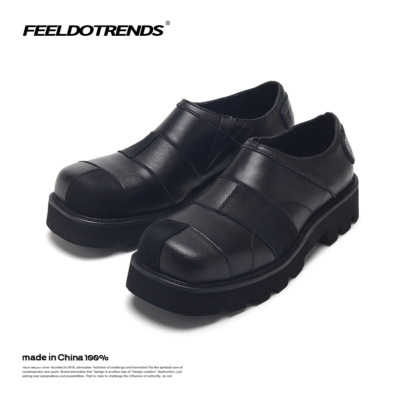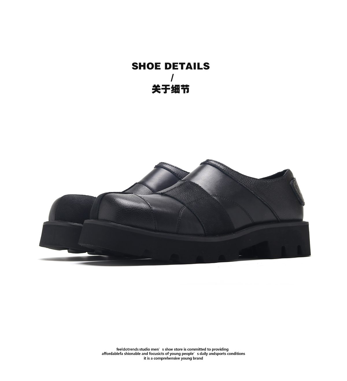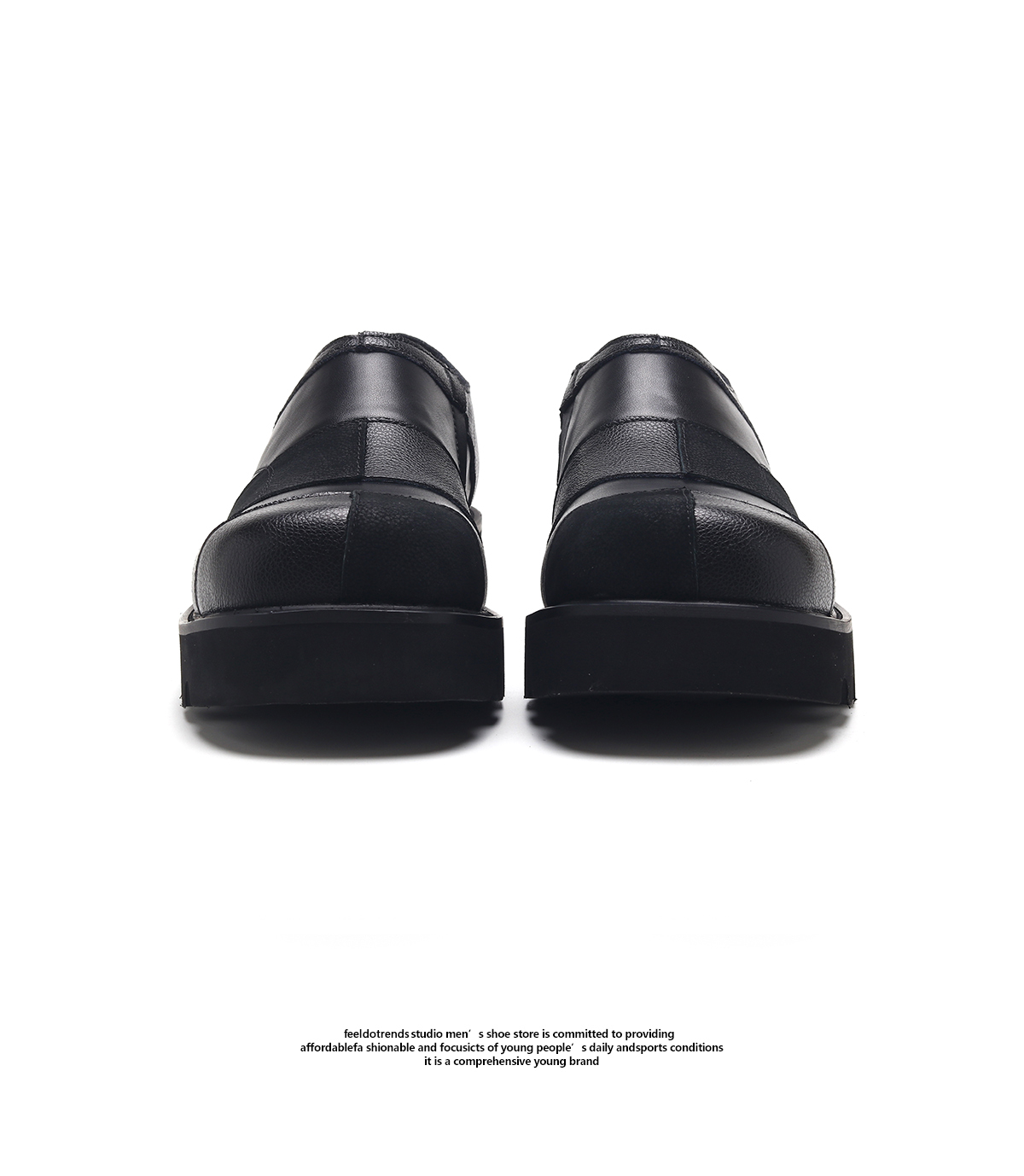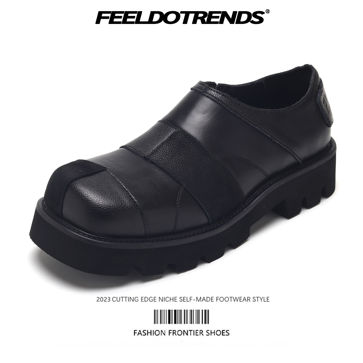 廢都潮品 厚底方頭德比皮鞋男小眾拼接縫製設計復古一腳蹬樂福鞋