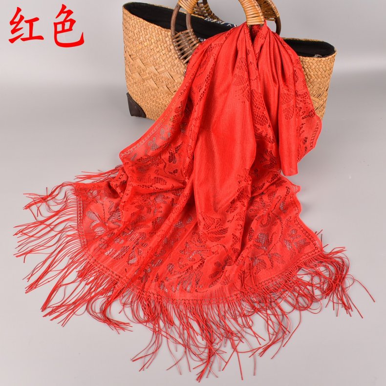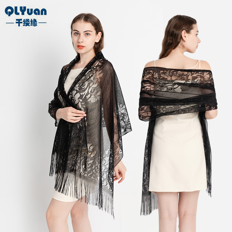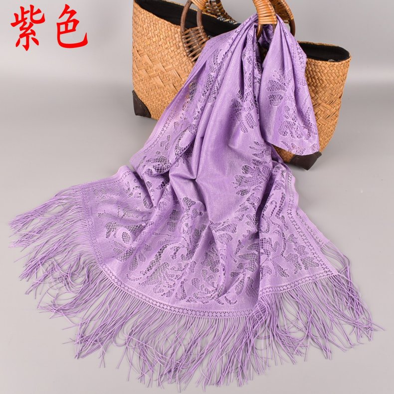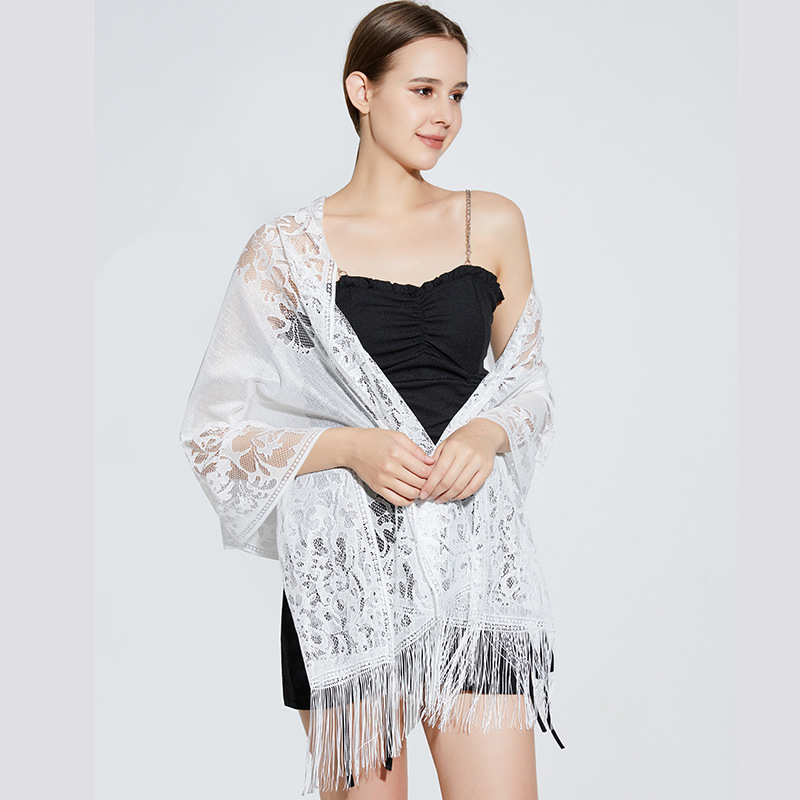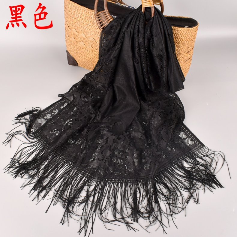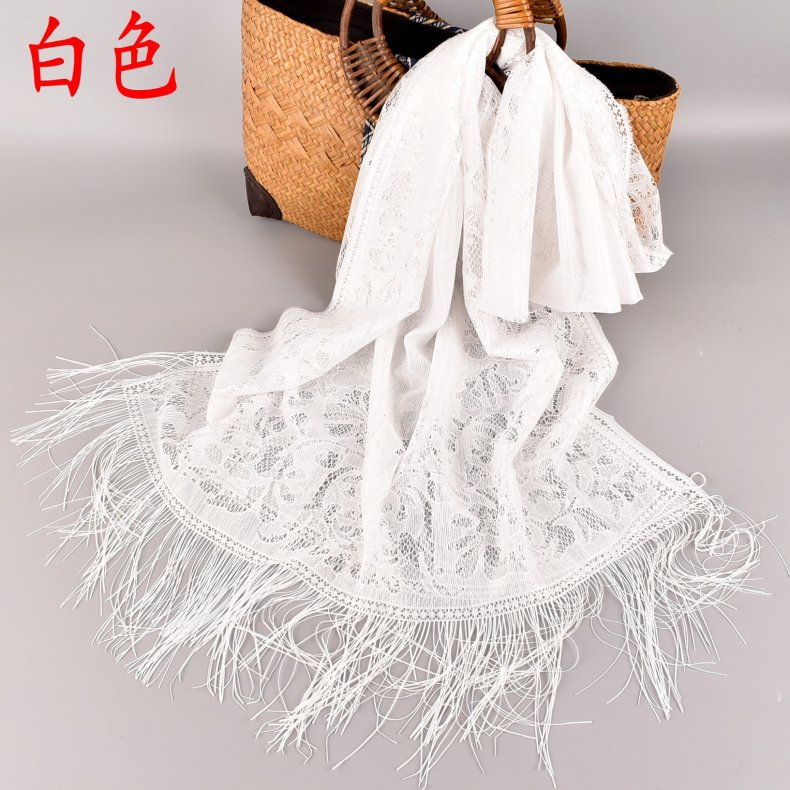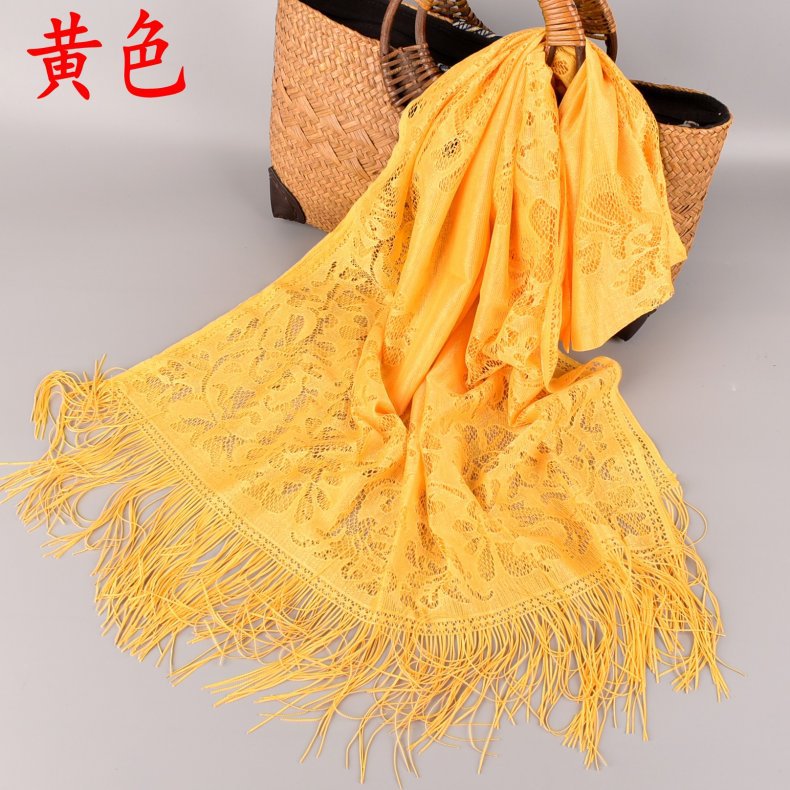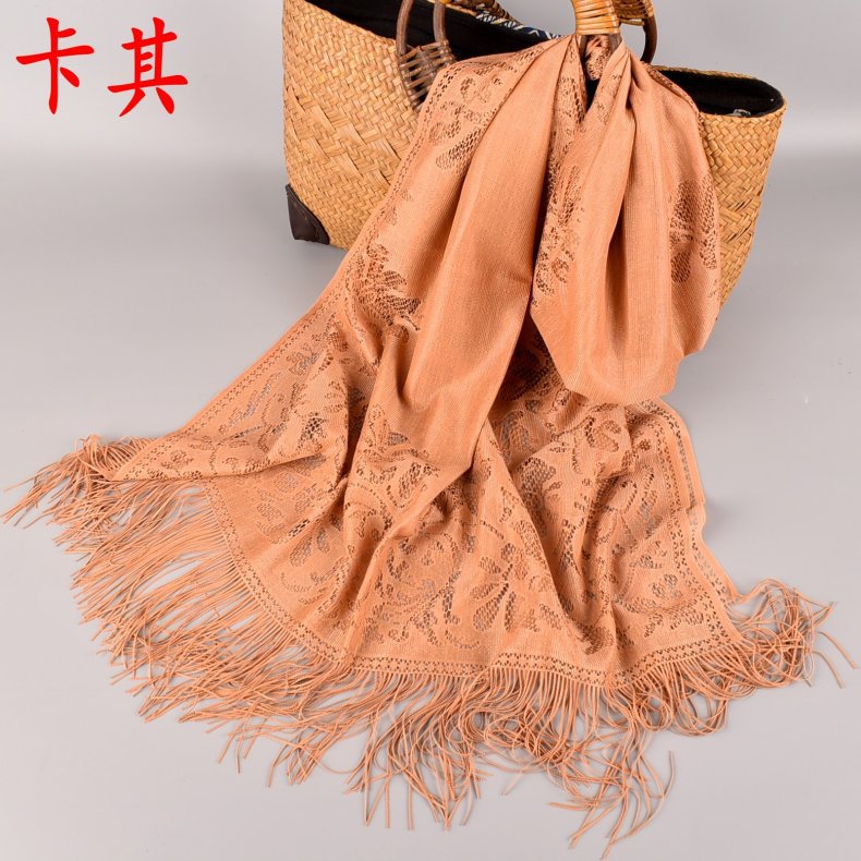 新款仿真丝纯色蕾丝长须披肩批发 时尚优雅百搭礼服围巾