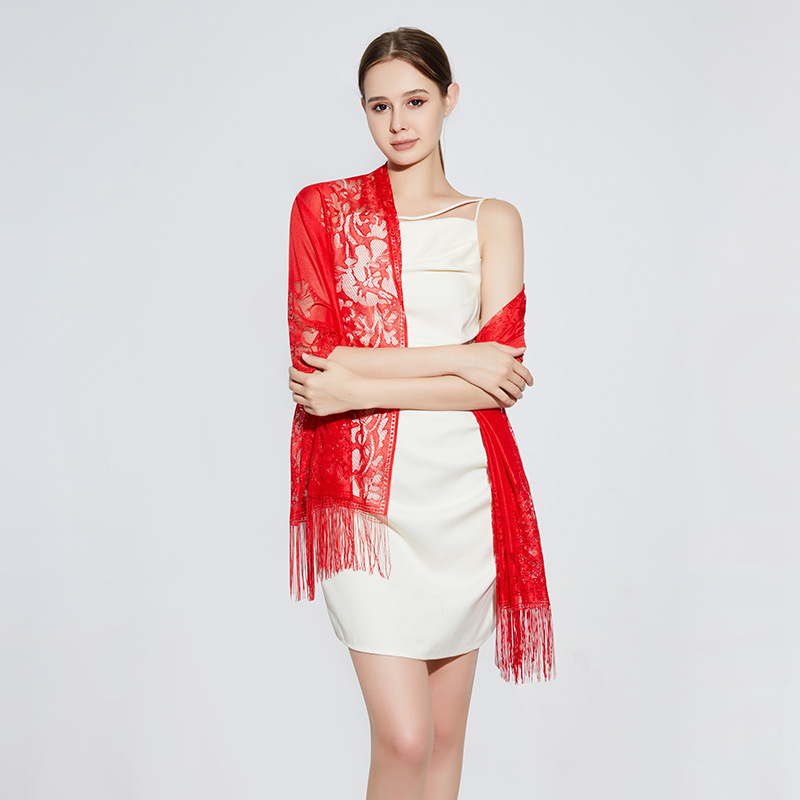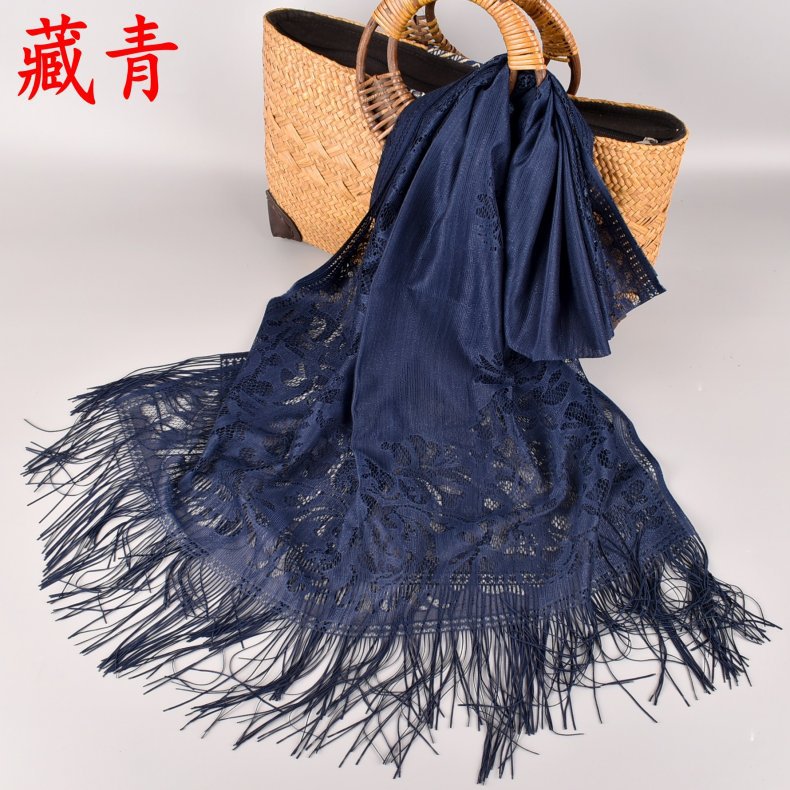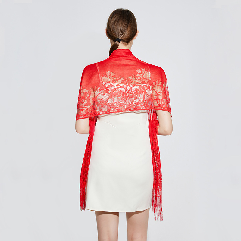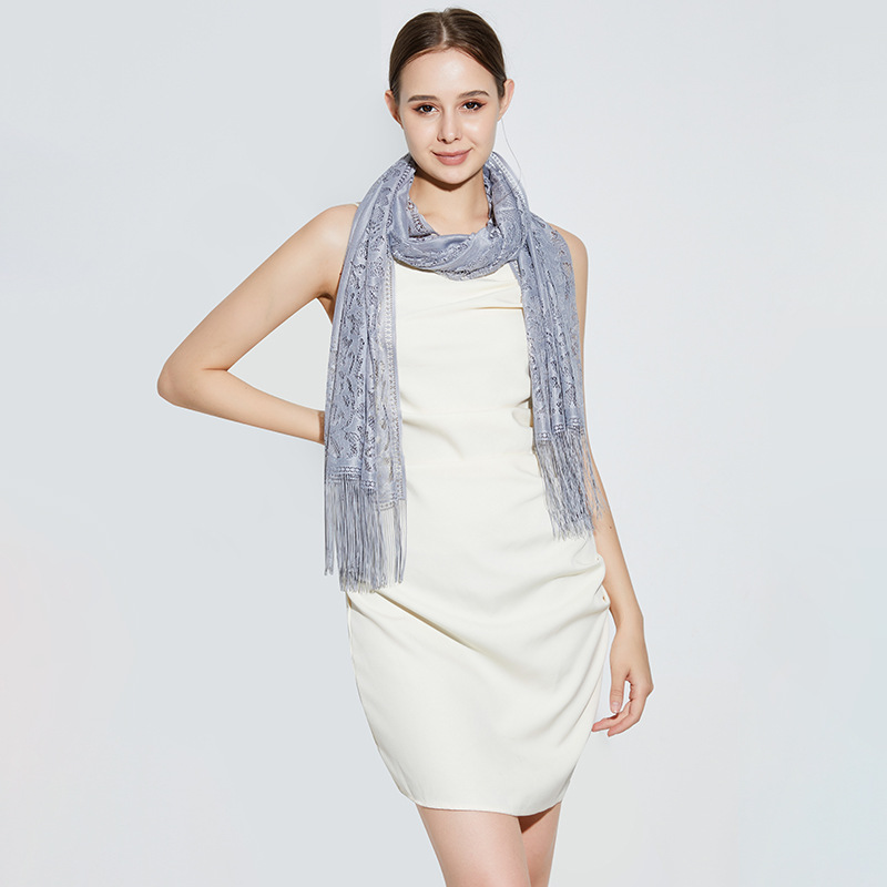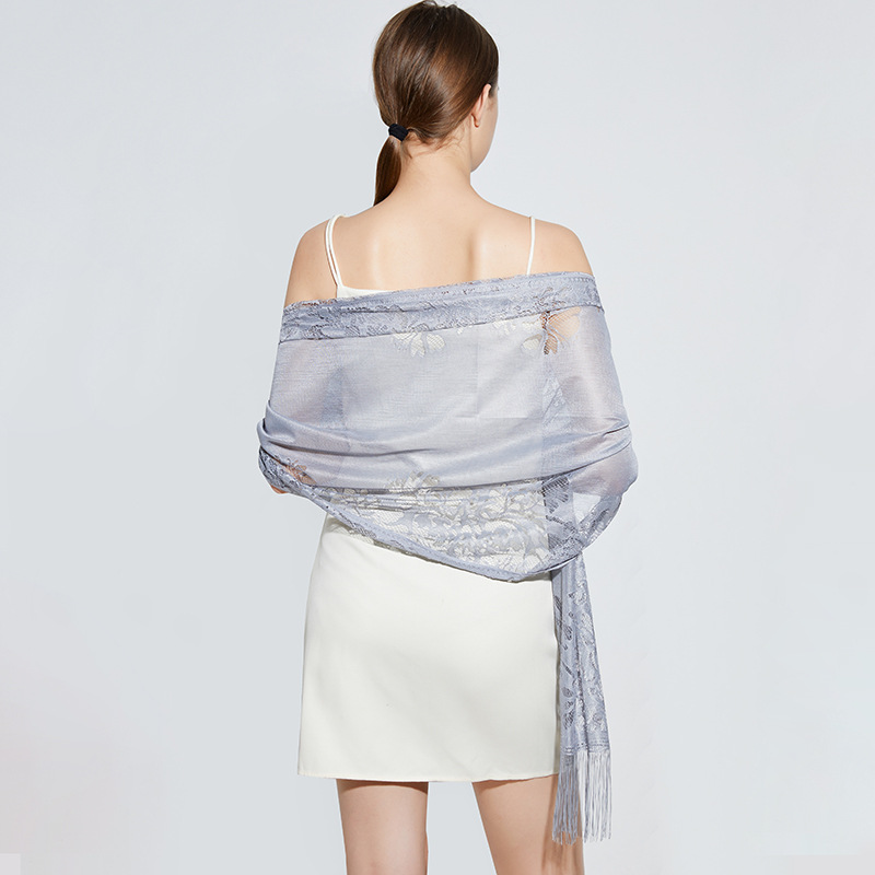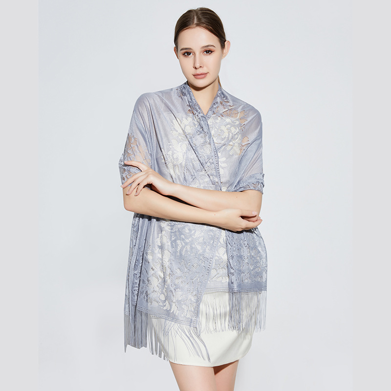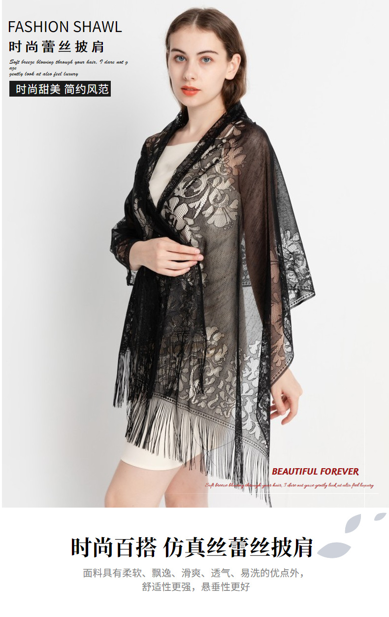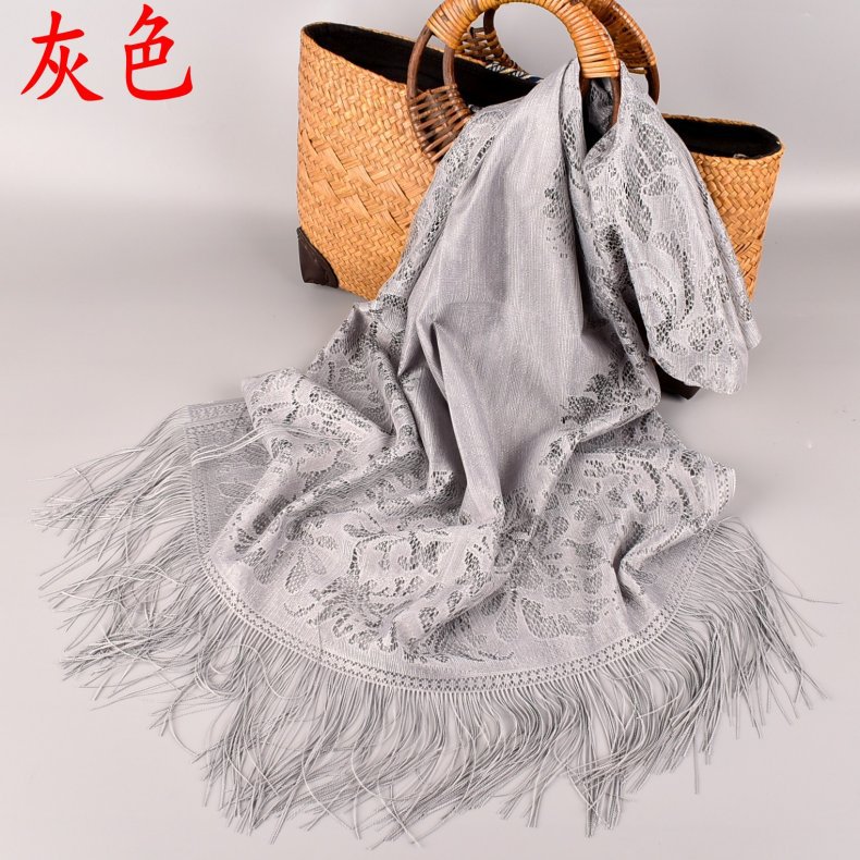 新款仿真丝纯色蕾丝长须披肩批发 时尚优雅百搭礼服围巾