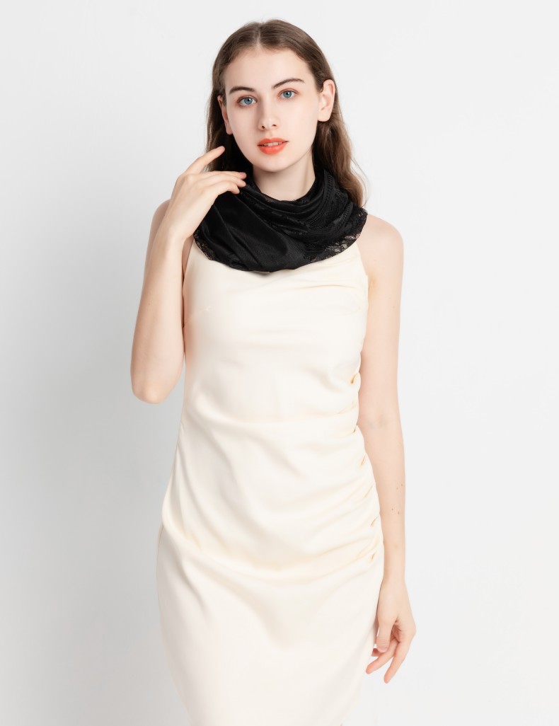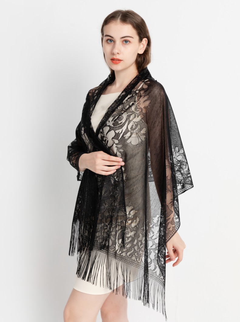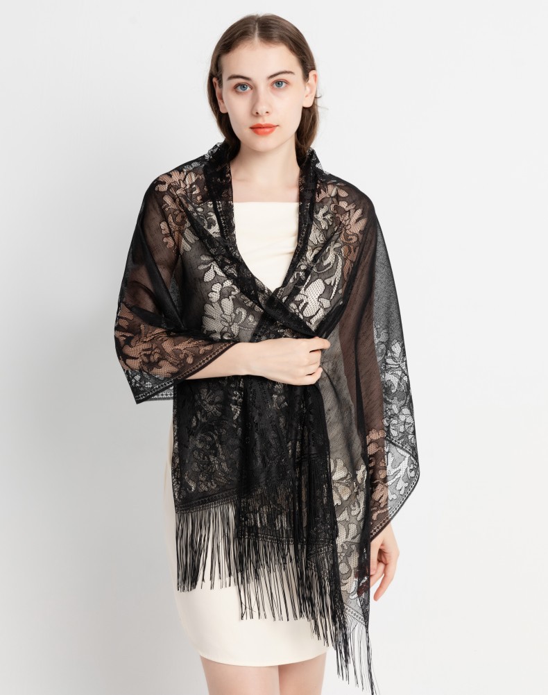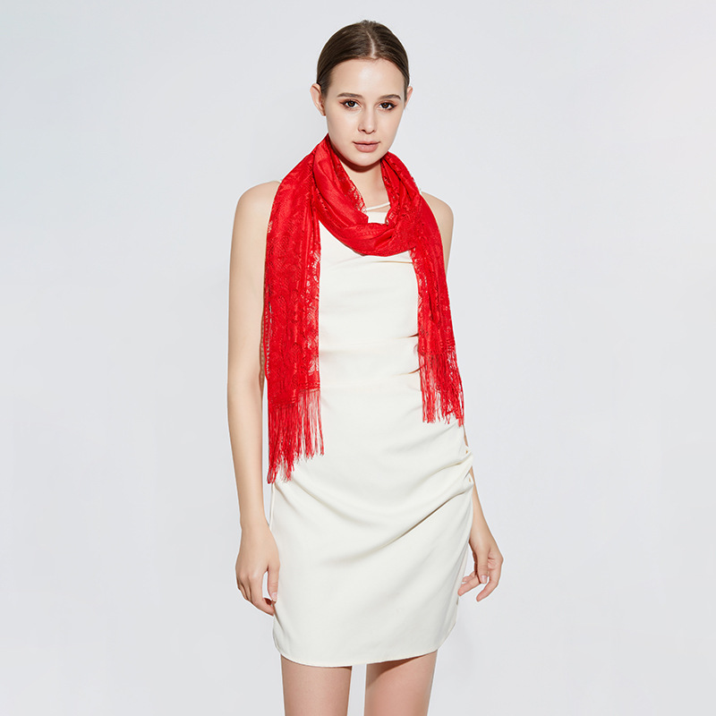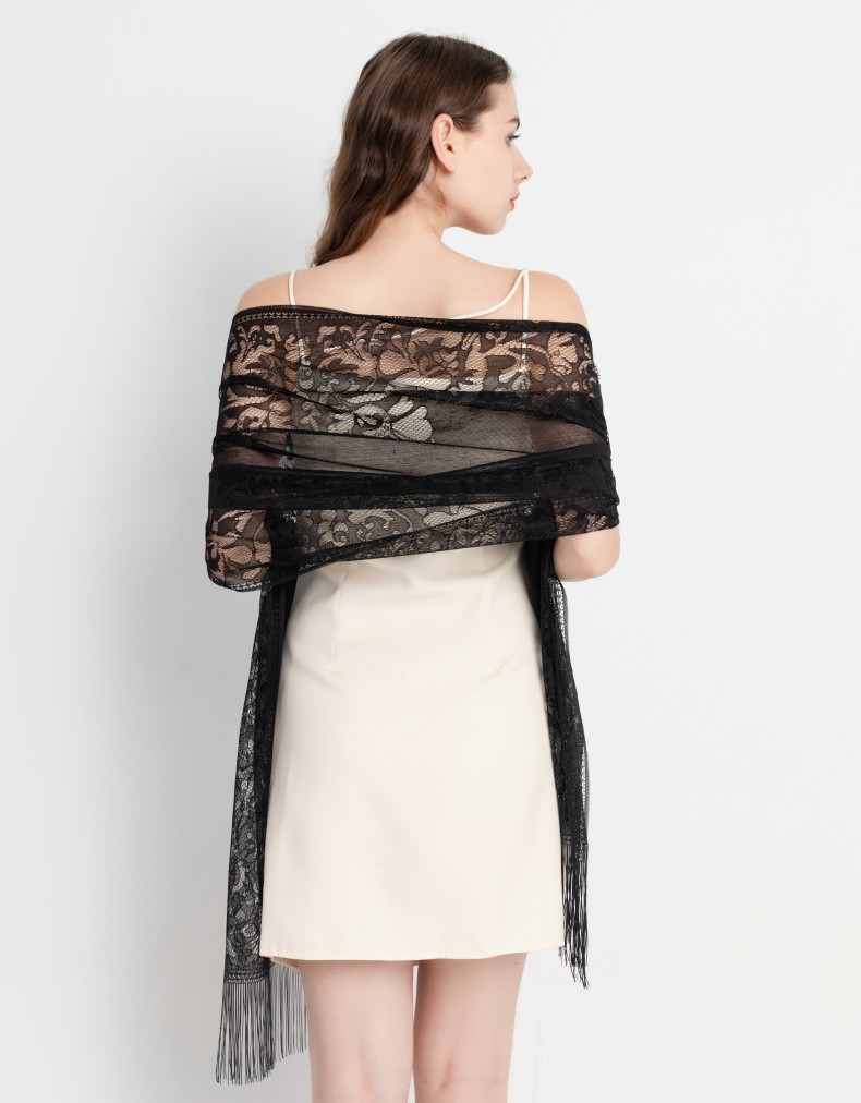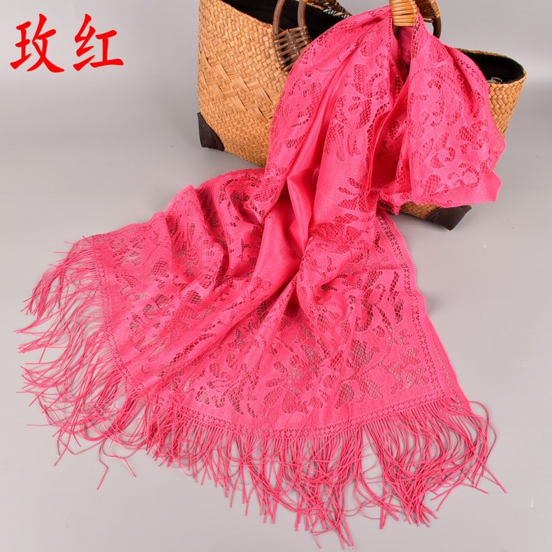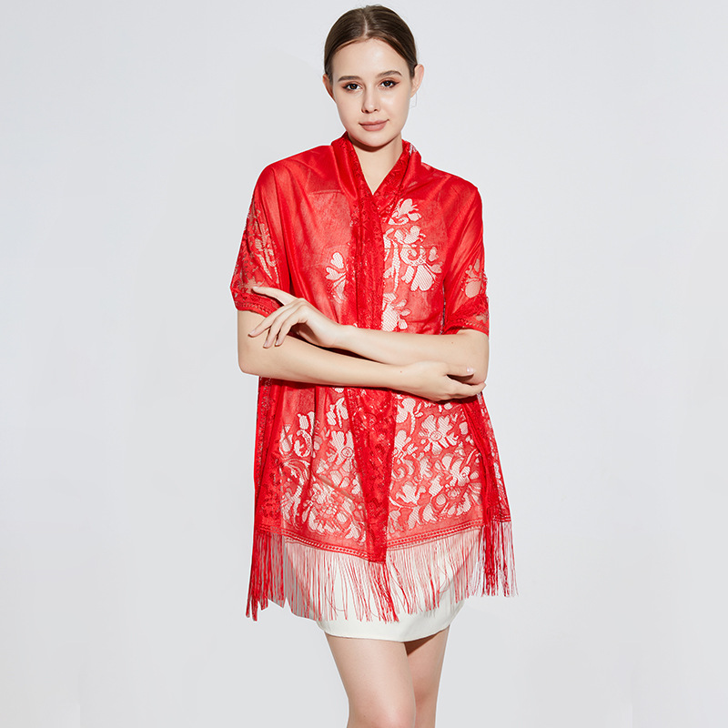 新款仿真丝纯色蕾丝长须披肩批发 时尚优雅百搭礼服围巾