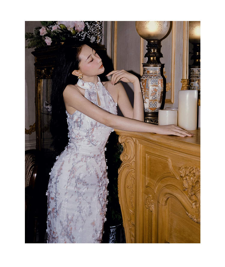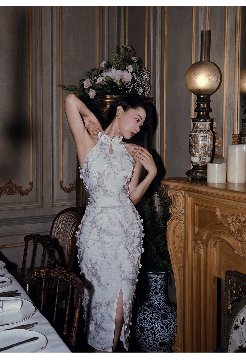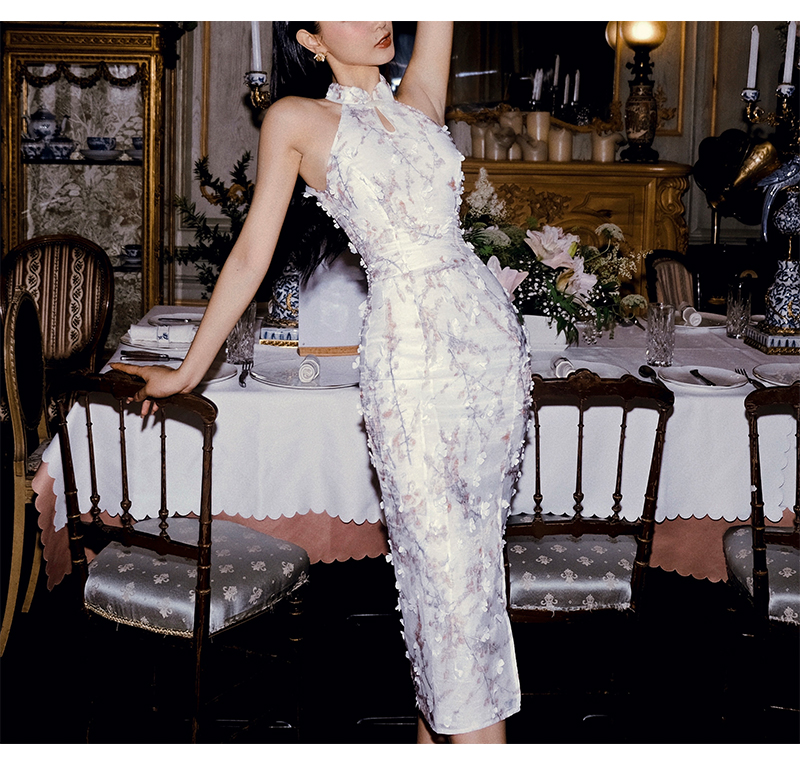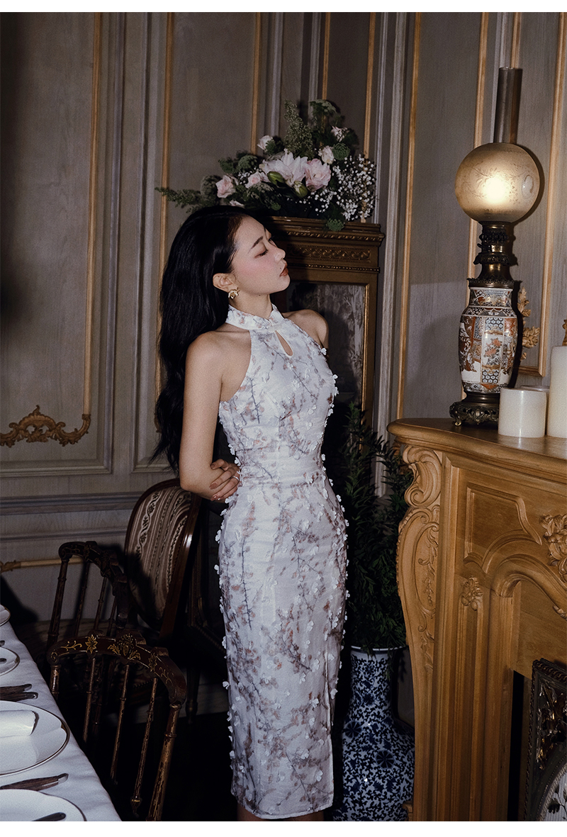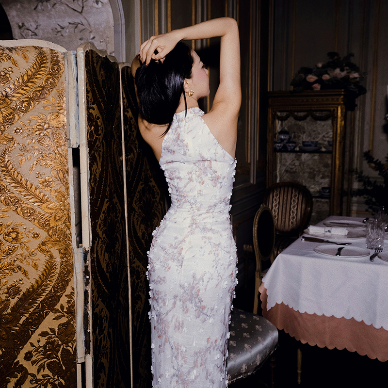 小麗XIAOLI踏雪尋梅春夏新中式旗袍秋款掛頸碎花雪紡包臀連衣長裙