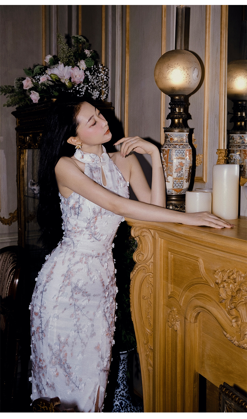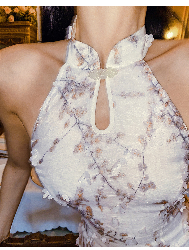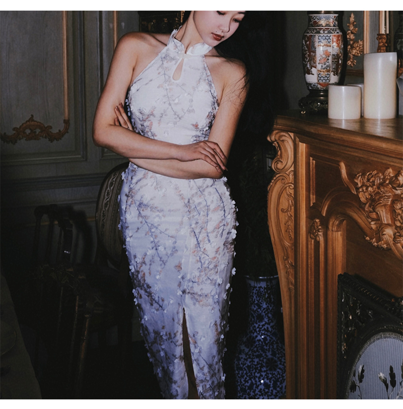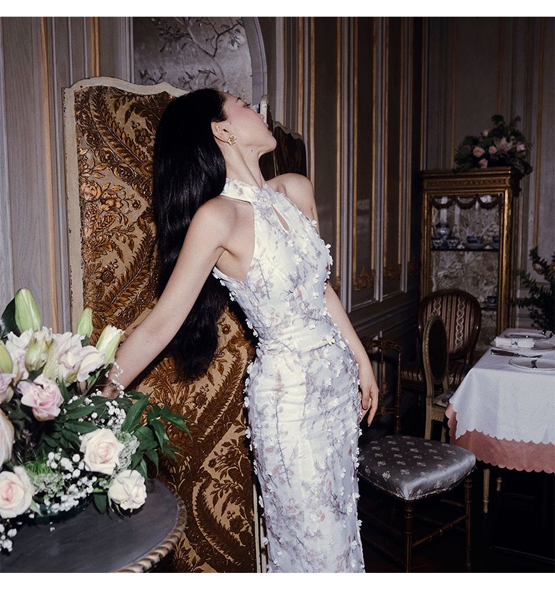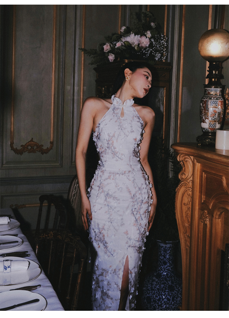 小麗XIAOLI踏雪尋梅春夏新中式旗袍秋款掛頸碎花雪紡包臀連衣長裙