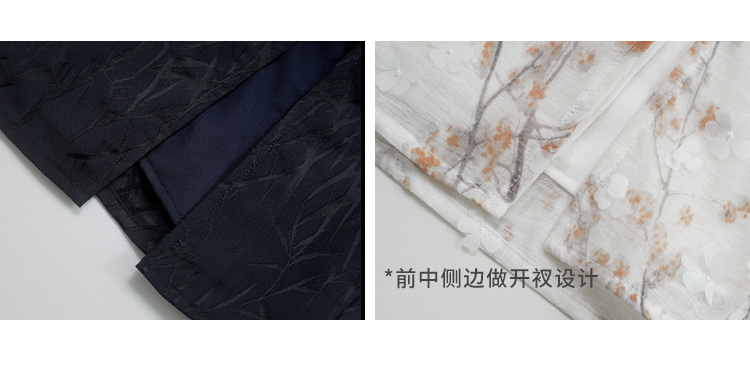 裙摆是铅笔裙型的,前中侧边做开衩设计