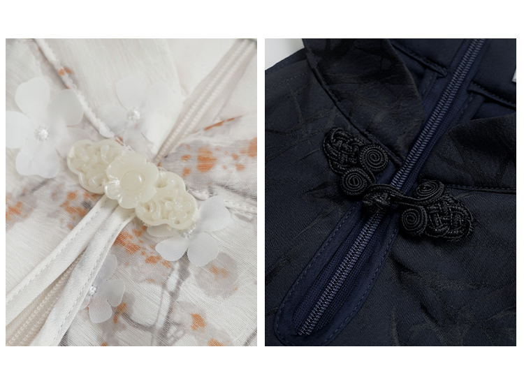 领口处装精致复古盘扣,根据款式的不同,挑选了不同的颜色和材质