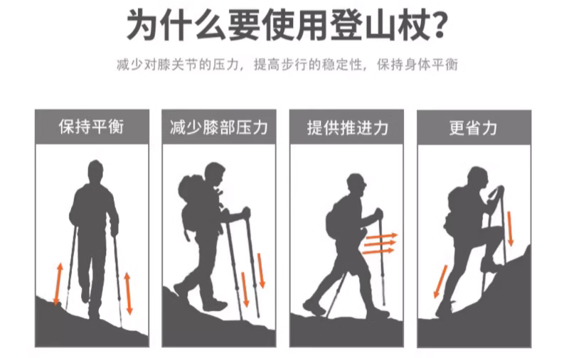 山杖,顾名思义,就是指从事登山运动时使用的辅助器械。登山杖可以让户外登山穿越活动带来很多的好处,如提高步行的稳定性,减轻腿部的负担。根据研究,行走时使用成对登山杖可以减轻至少22%施予腿部和膝盖等肌肉关节的力量,让腿部比较轻松,能够提供较好的平衡性。更别忘了找不到树干,它还可以做用防水布搭建雨棚的支杆。