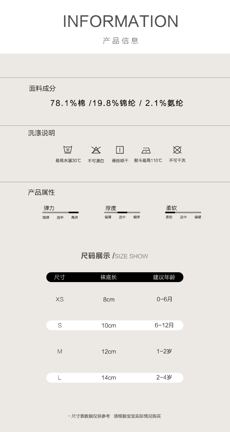 童袜尺码 XS码0-6个月,S码6-12个月,M码1-2岁,L码2-4岁