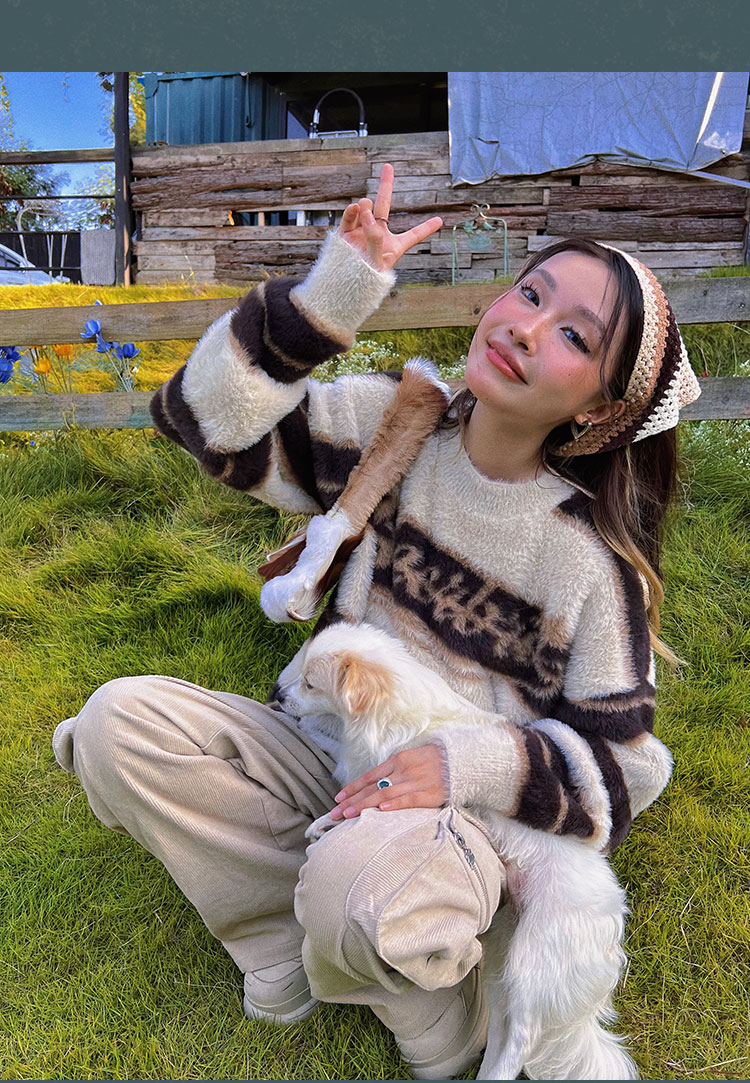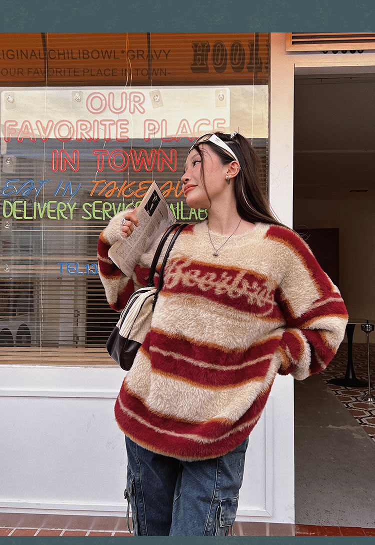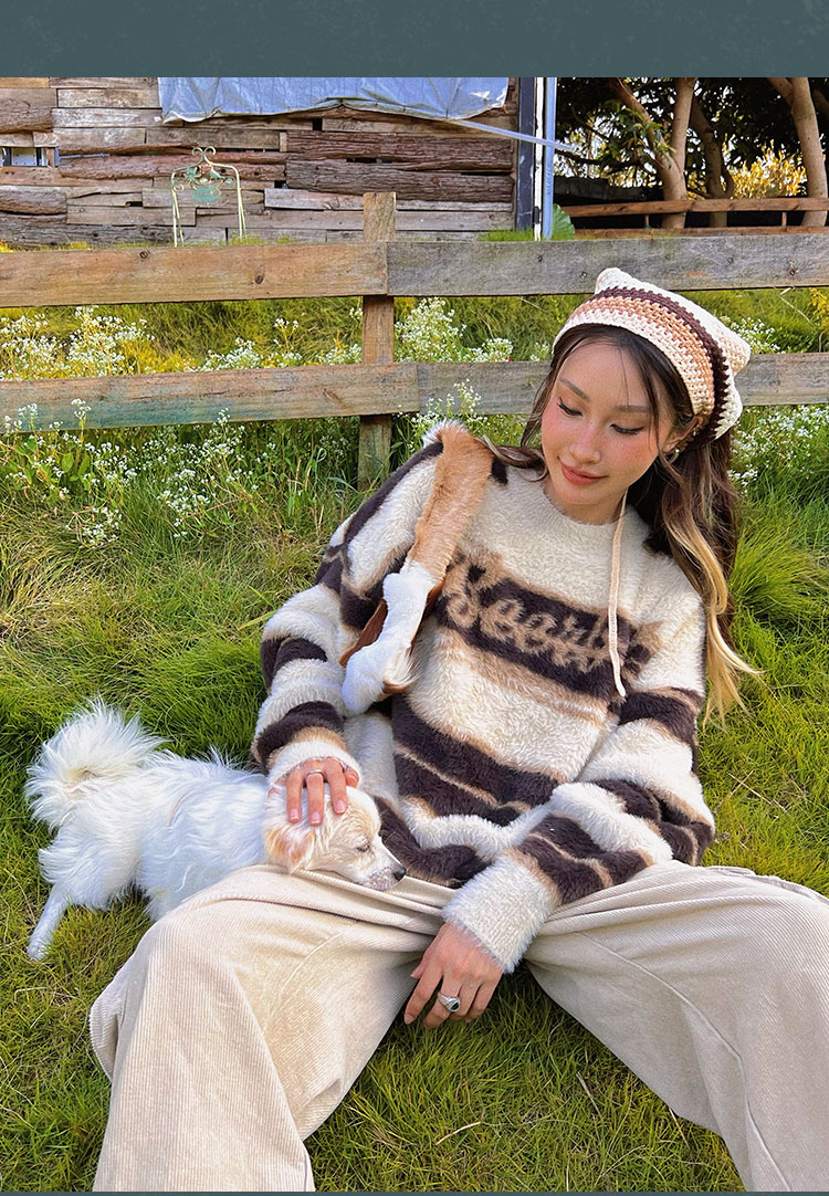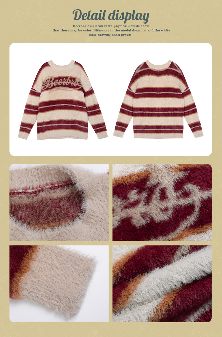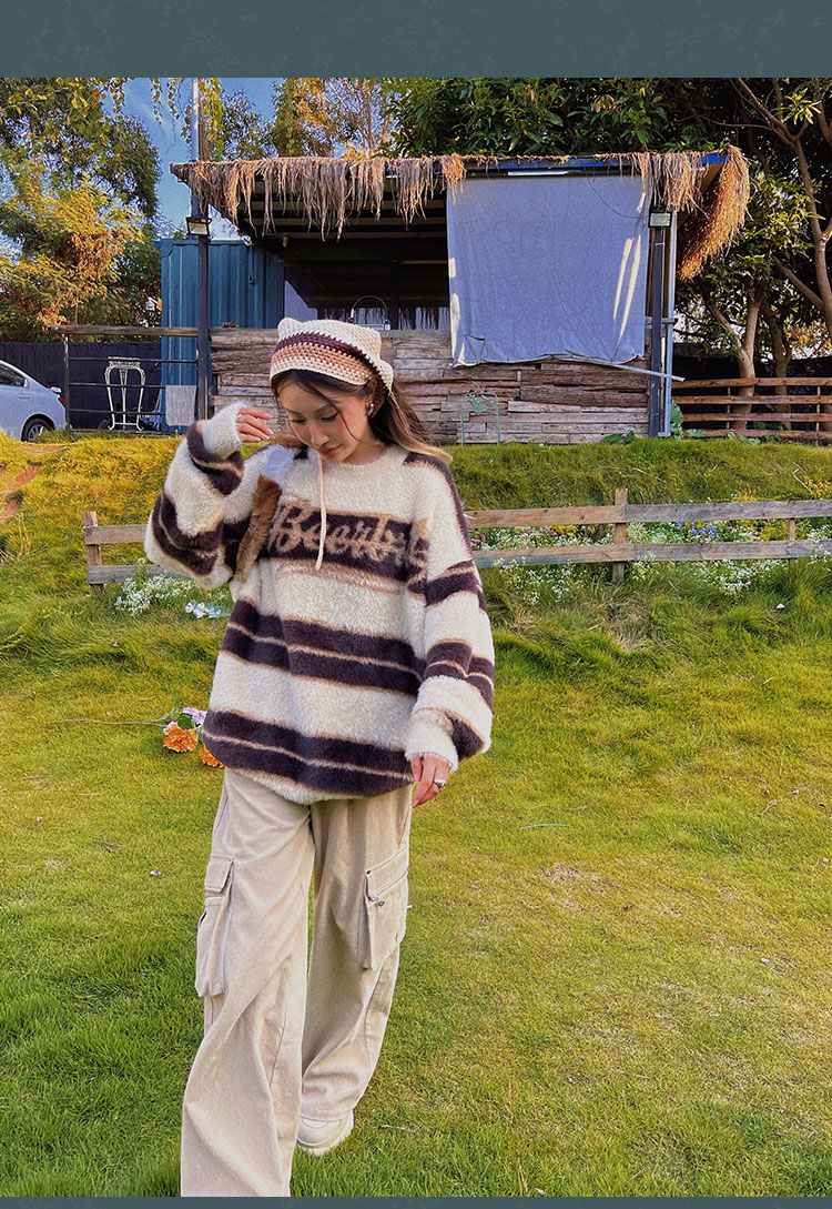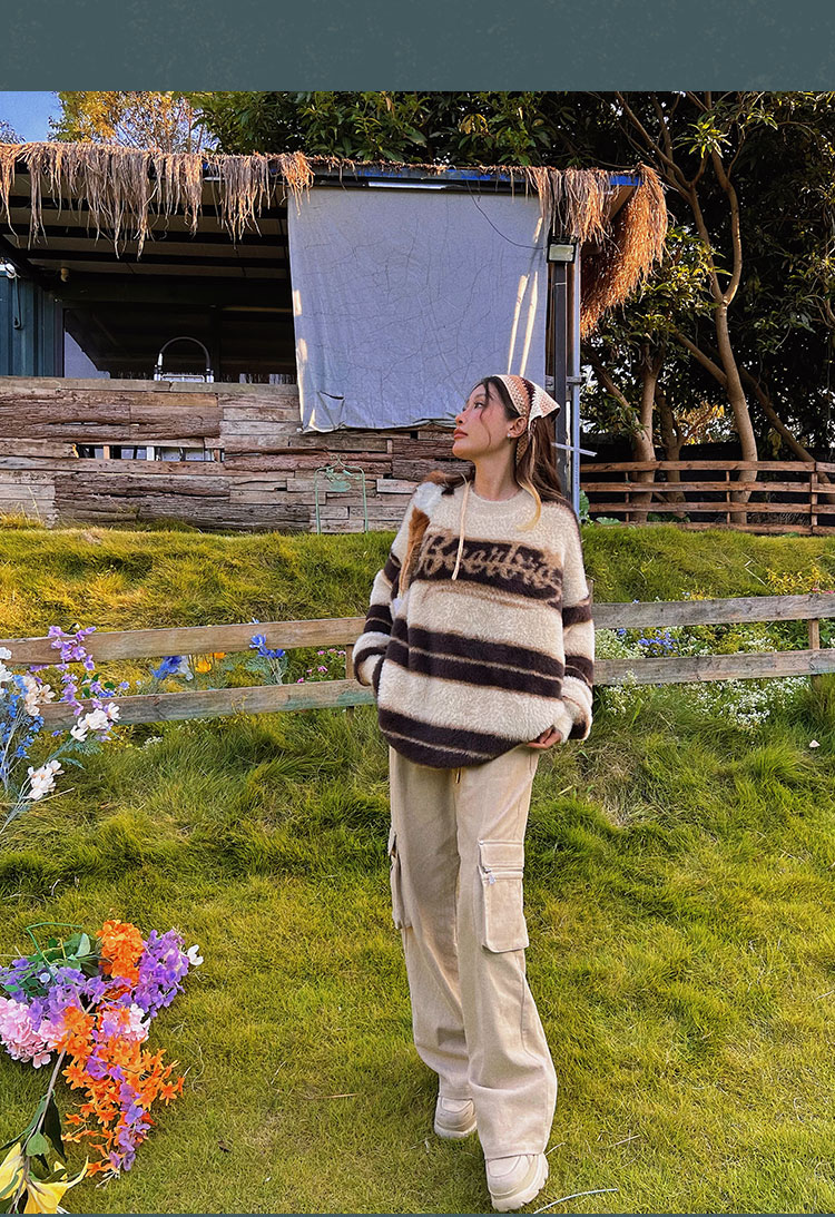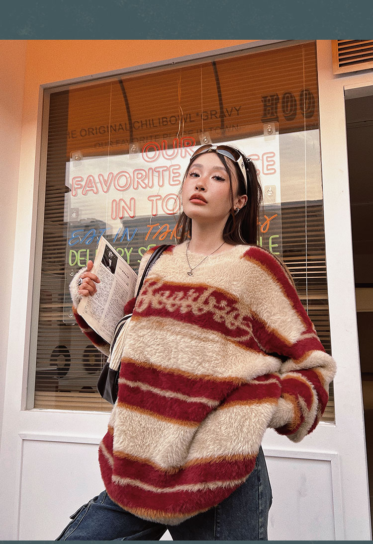 BeerBro 仿貂毛刷條紋毛衣女秋冬新款寬鬆顯瘦慵懶風毛針織衫外套潮
