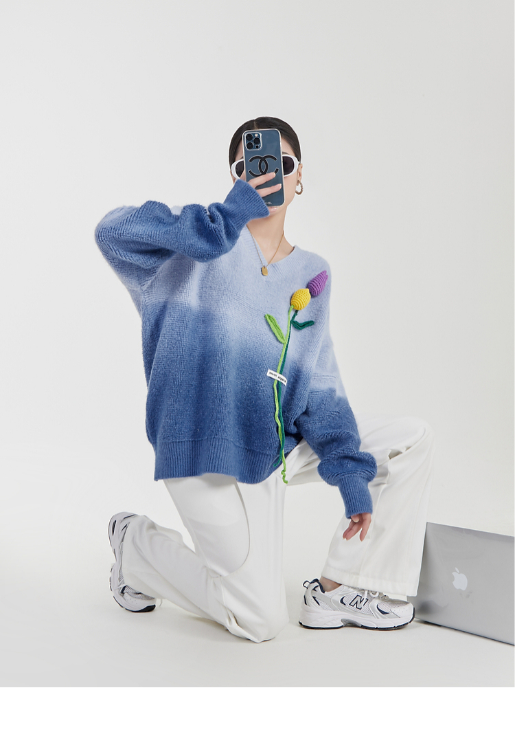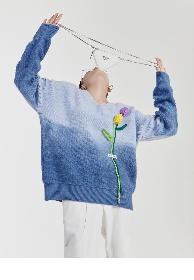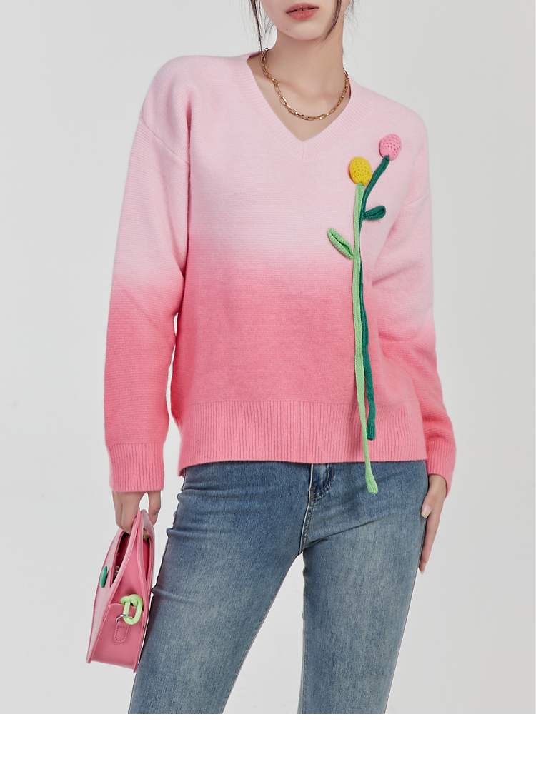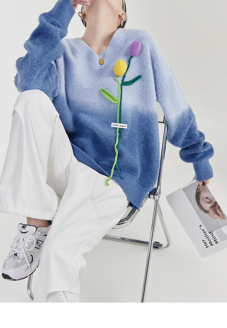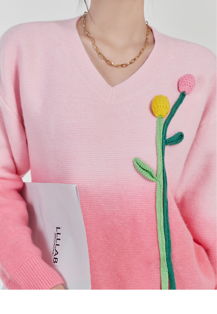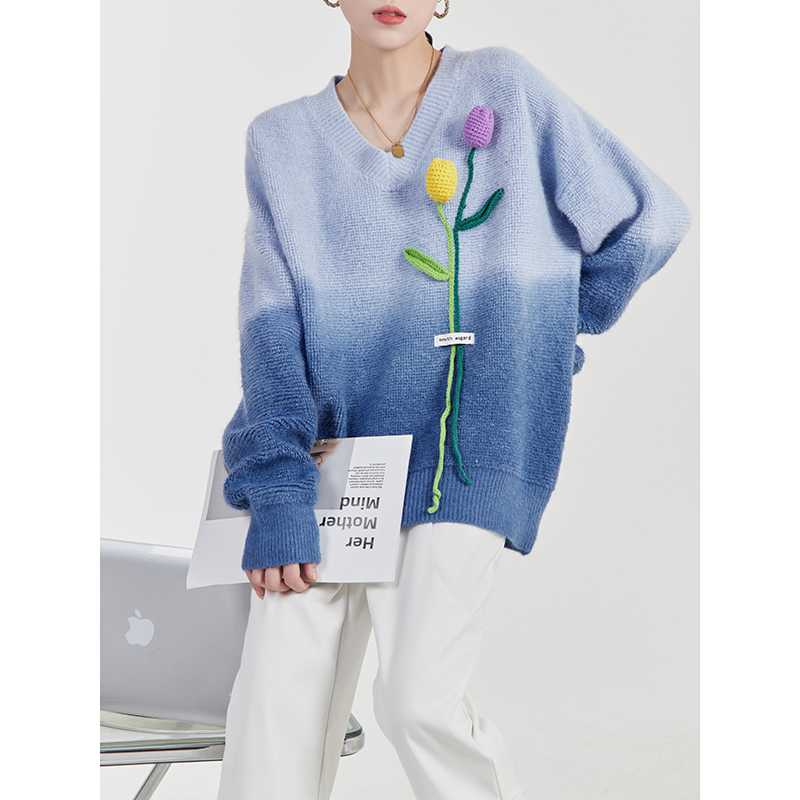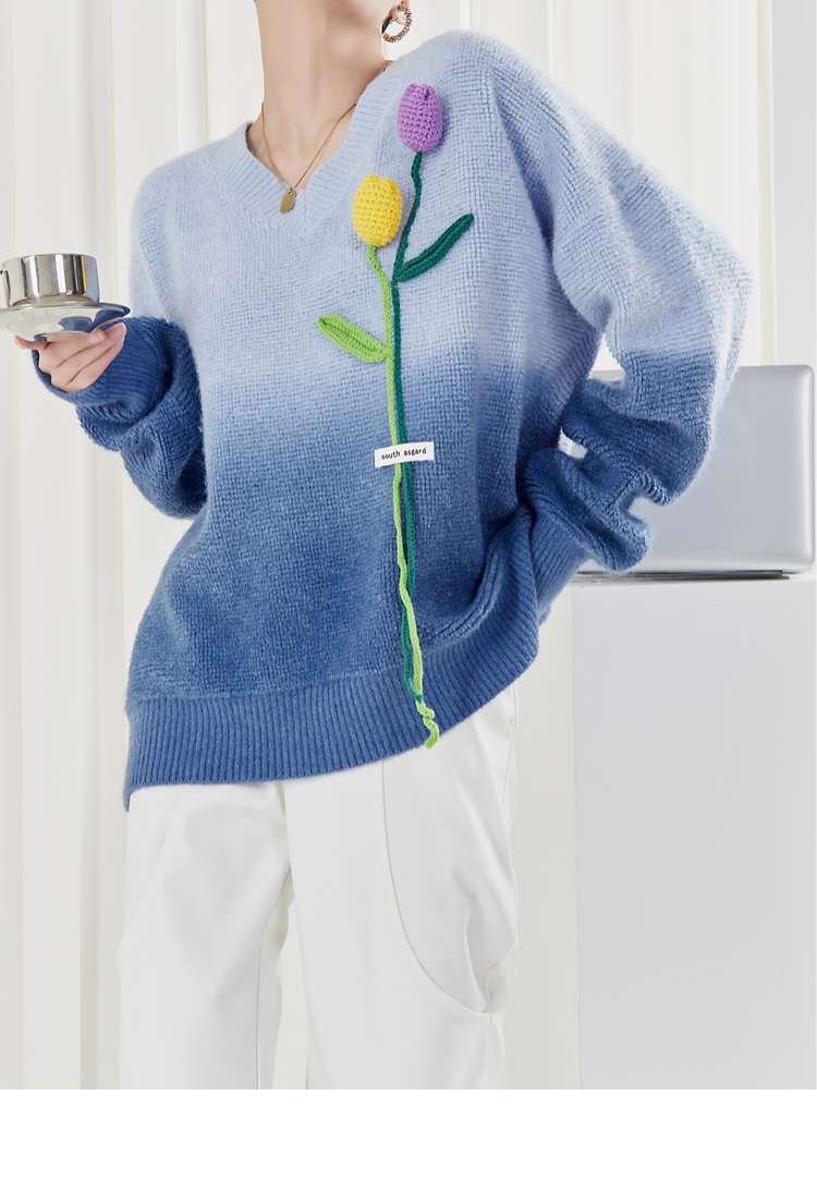【現貨】高級感超好看毛衣法式鬱金香花朵漸層色寬鬆慵懶針織衫女