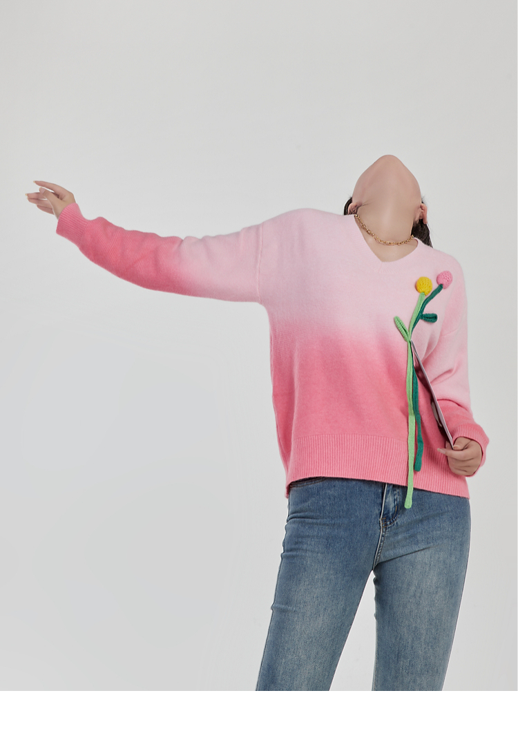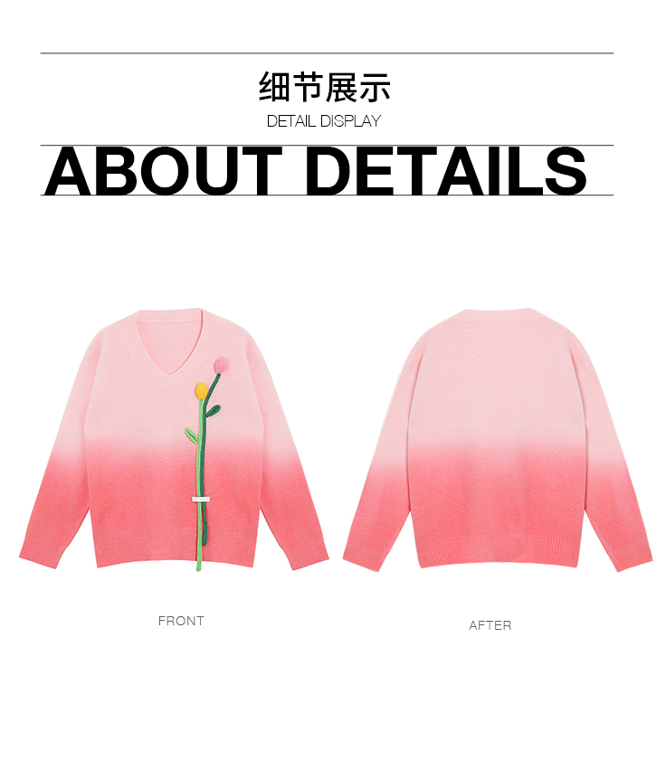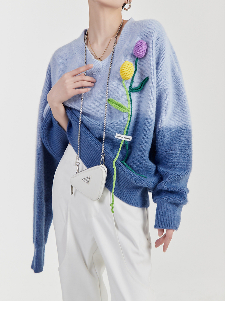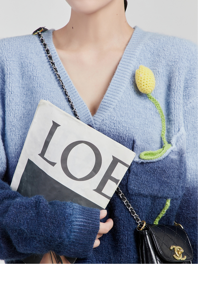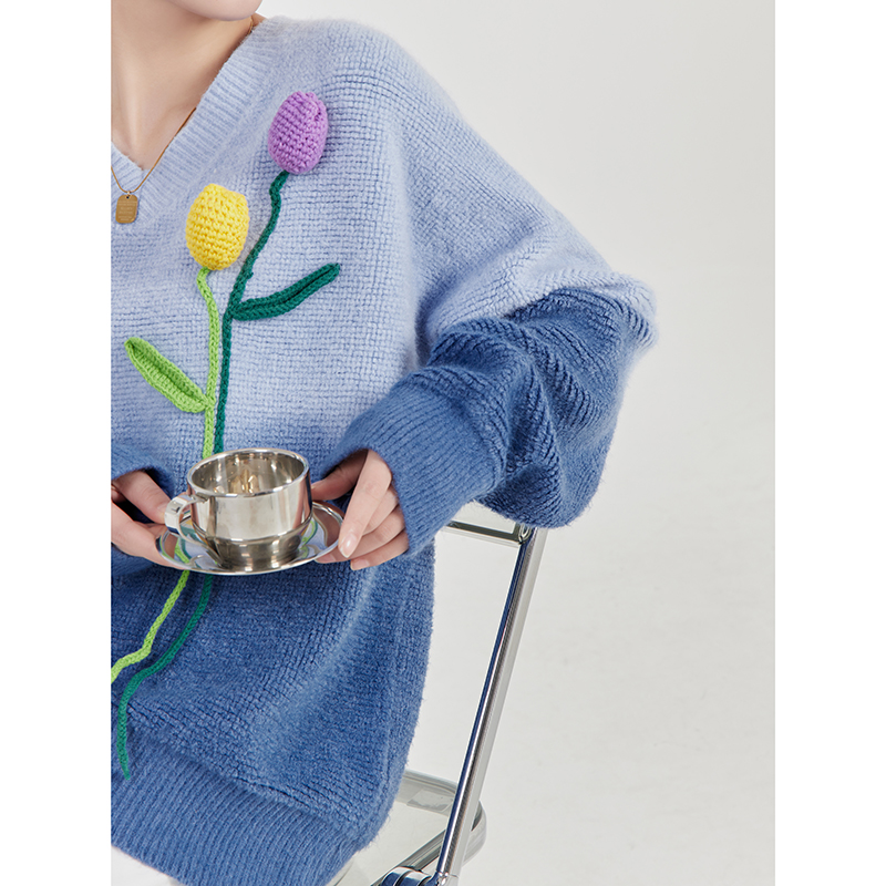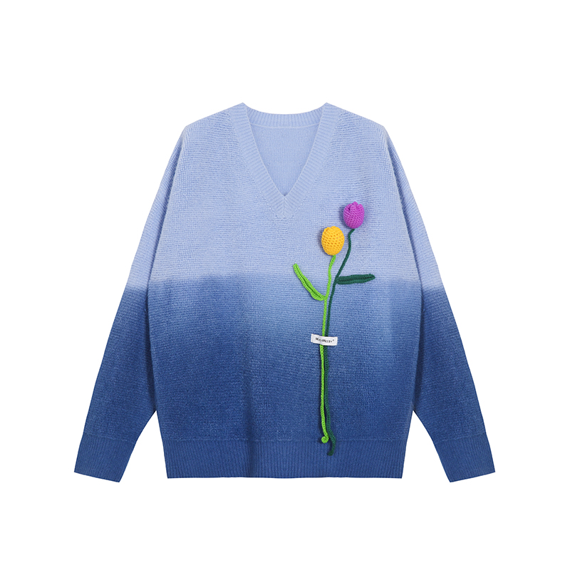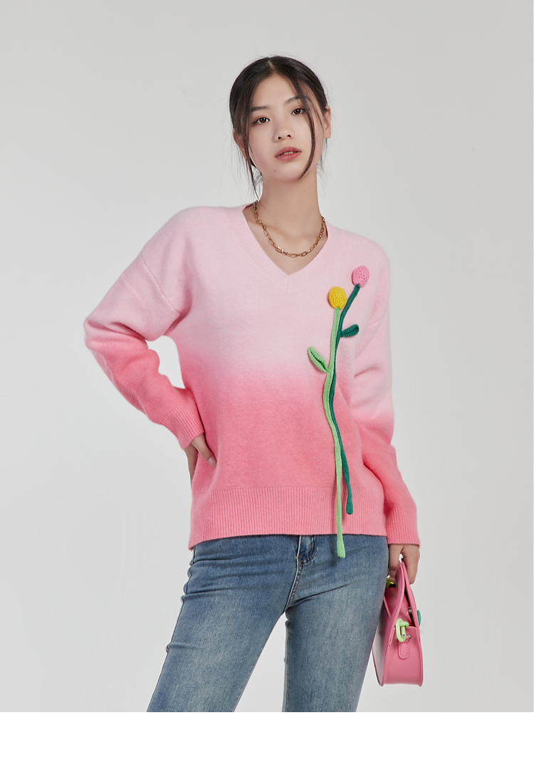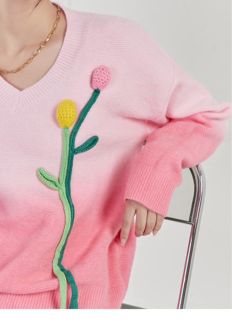 【現貨】高級感超好看毛衣法式鬱金香花朵漸層色寬鬆慵懶針織衫女