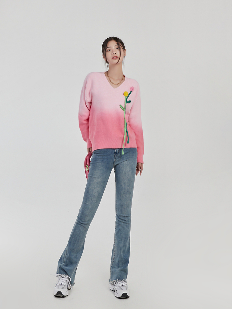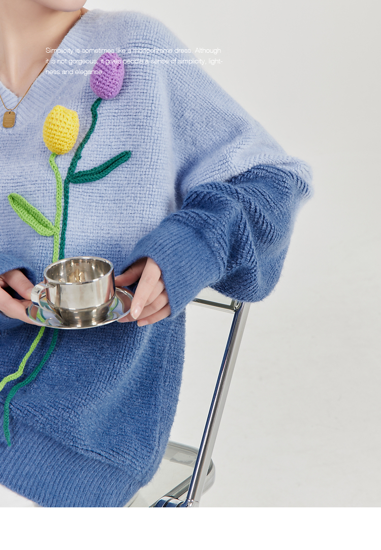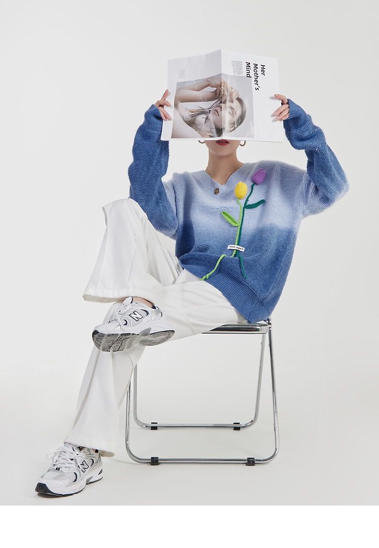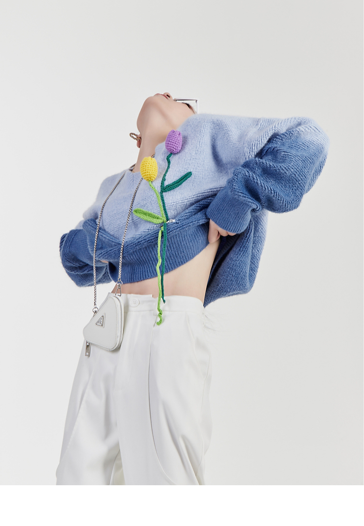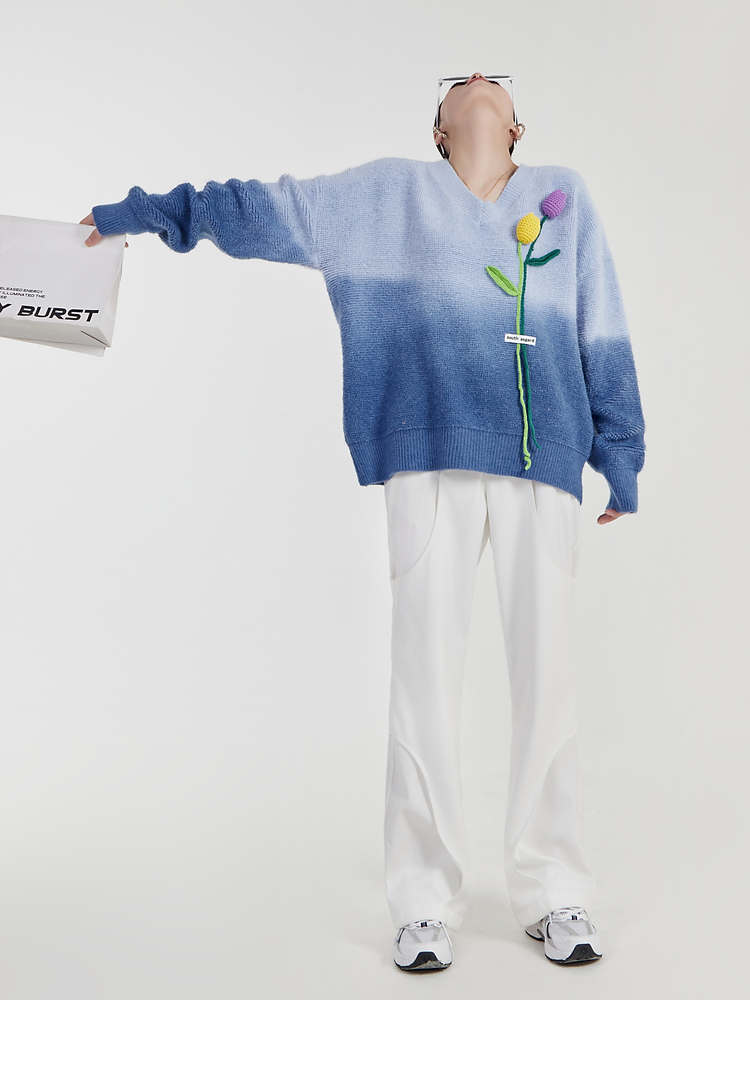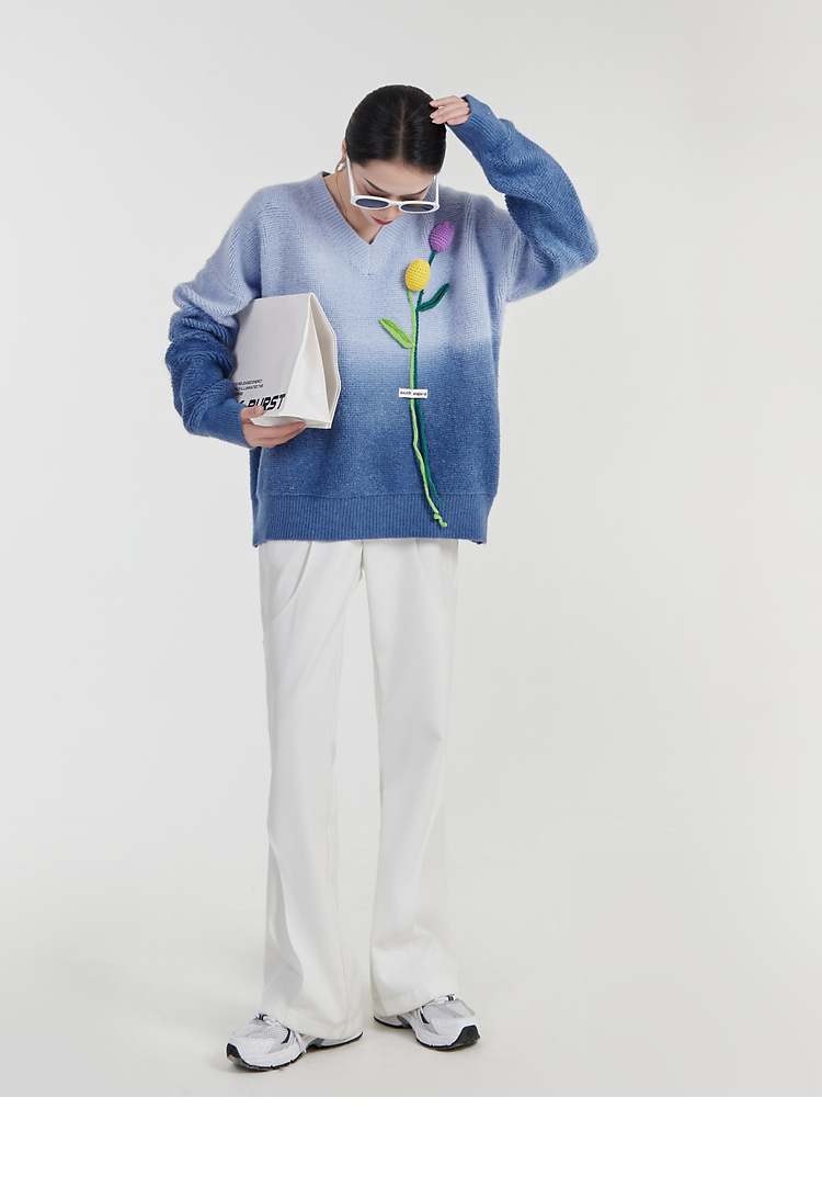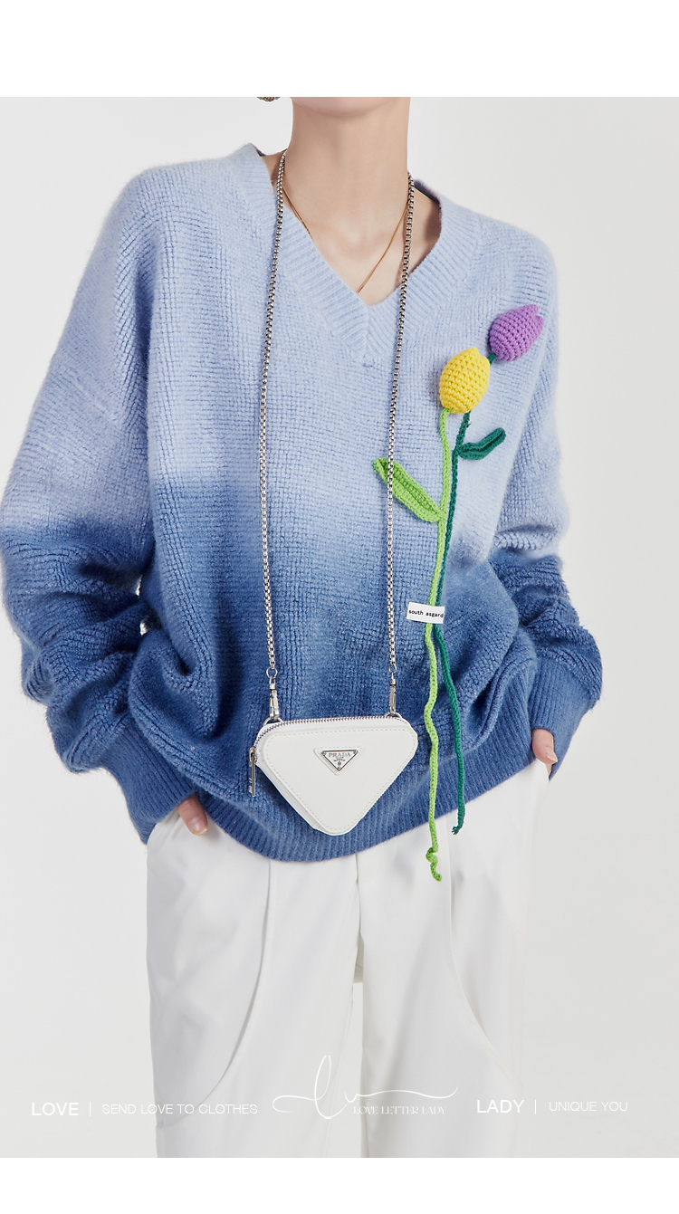 【現貨】高級感超好看毛衣法式鬱金香花朵漸層色寬鬆慵懶針織衫女