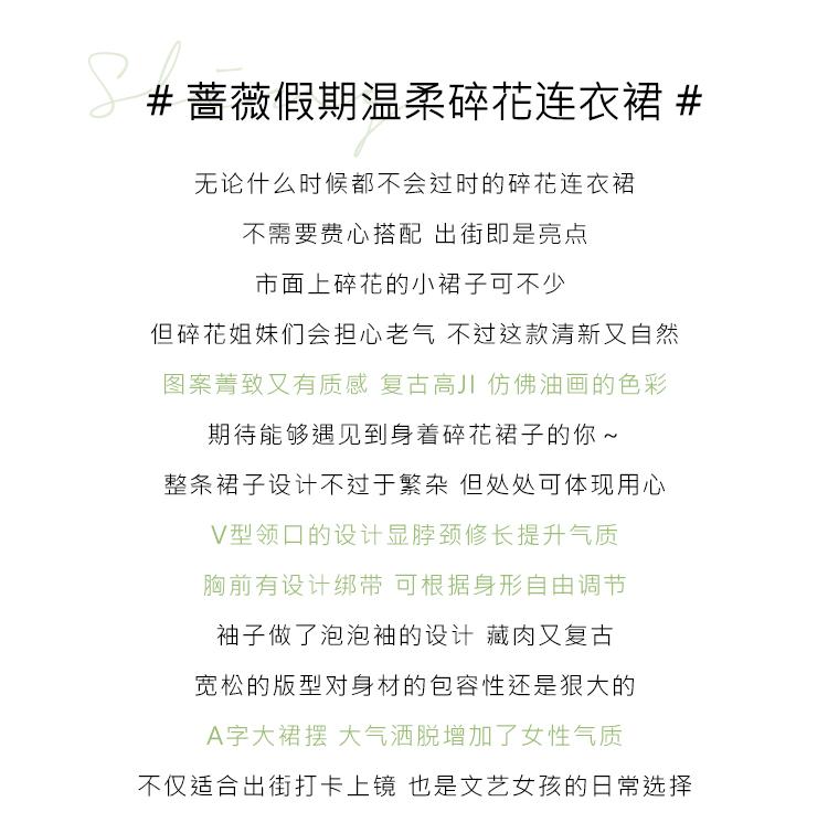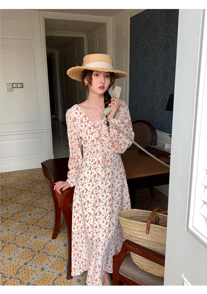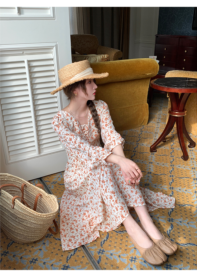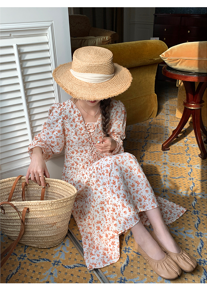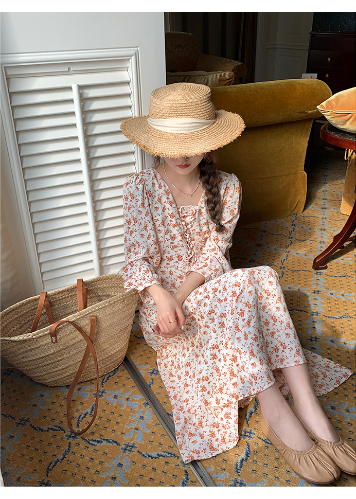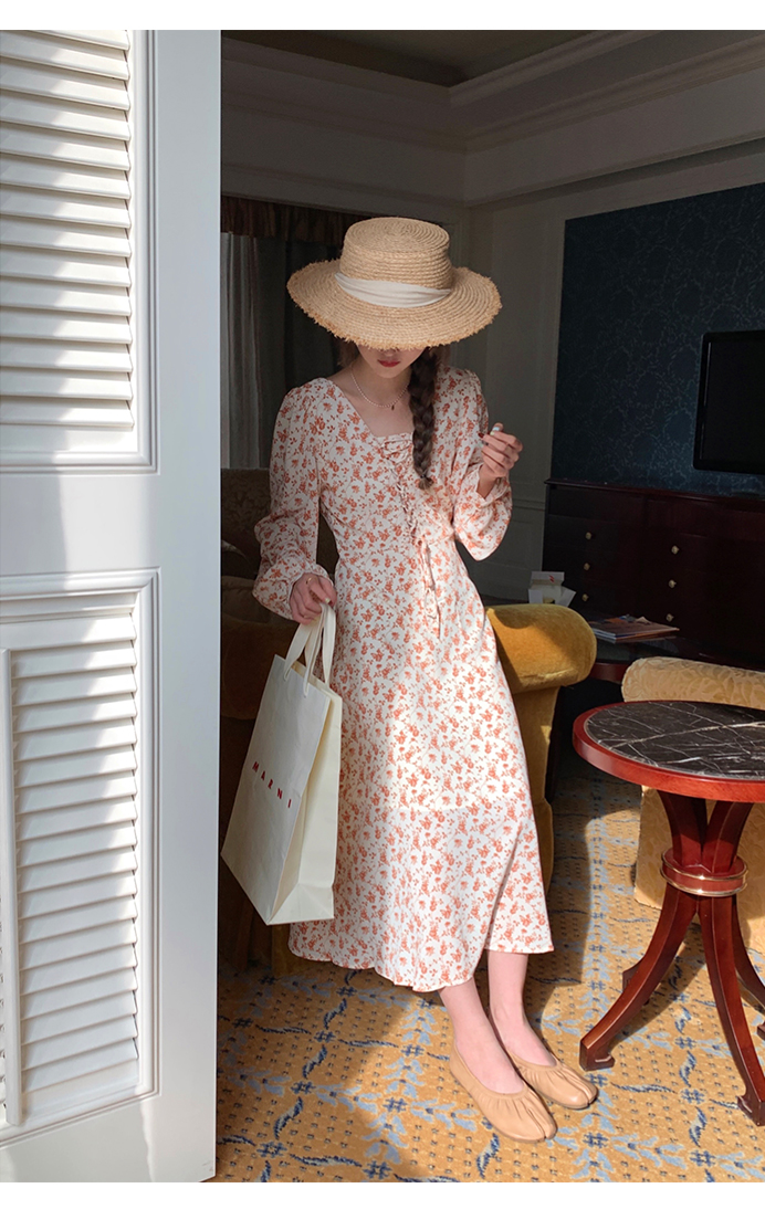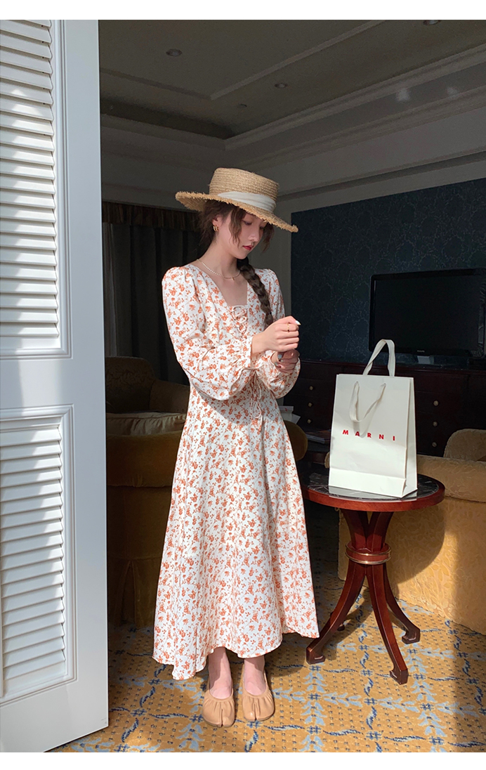 米花家【薔薇假期】V領碎花洋裝女春收腰顯瘦小個子長裙2023新