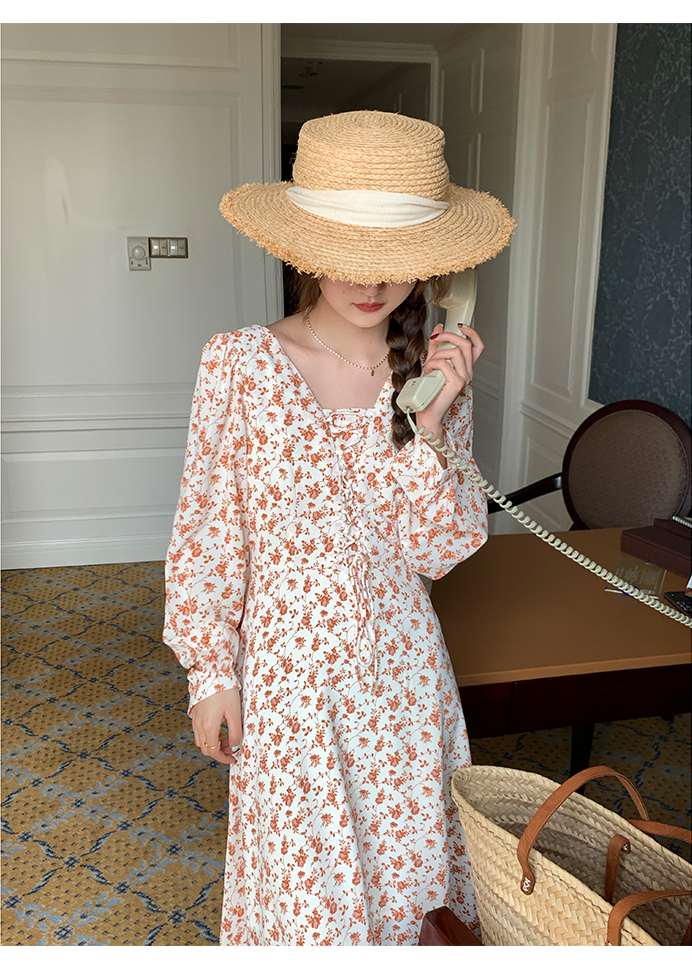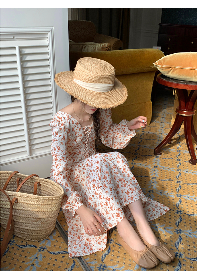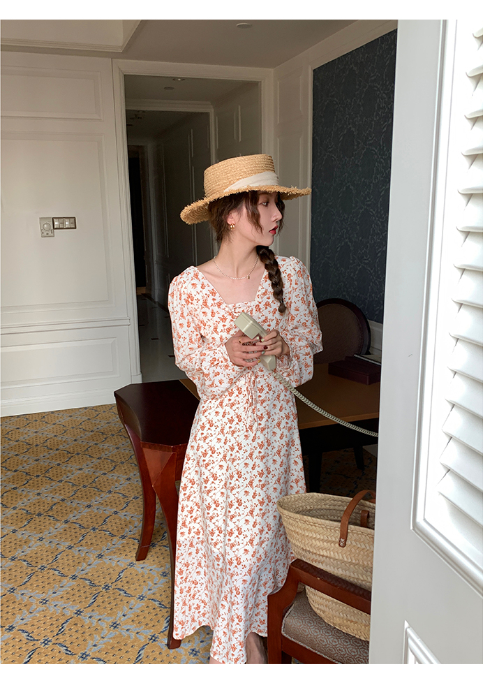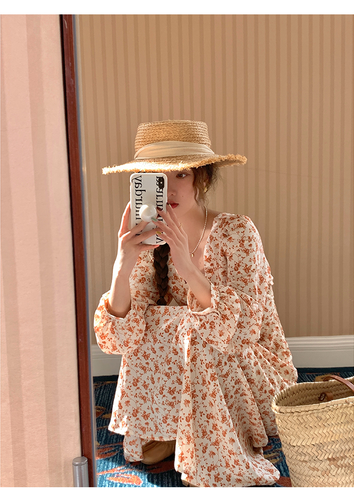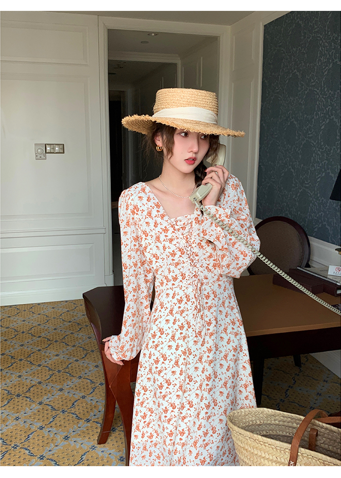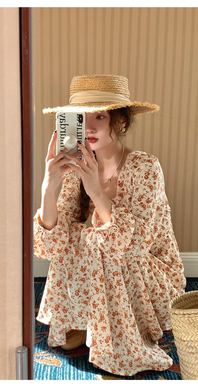 米花家【薔薇假期】V領碎花洋裝女春收腰顯瘦小個子長裙2023新