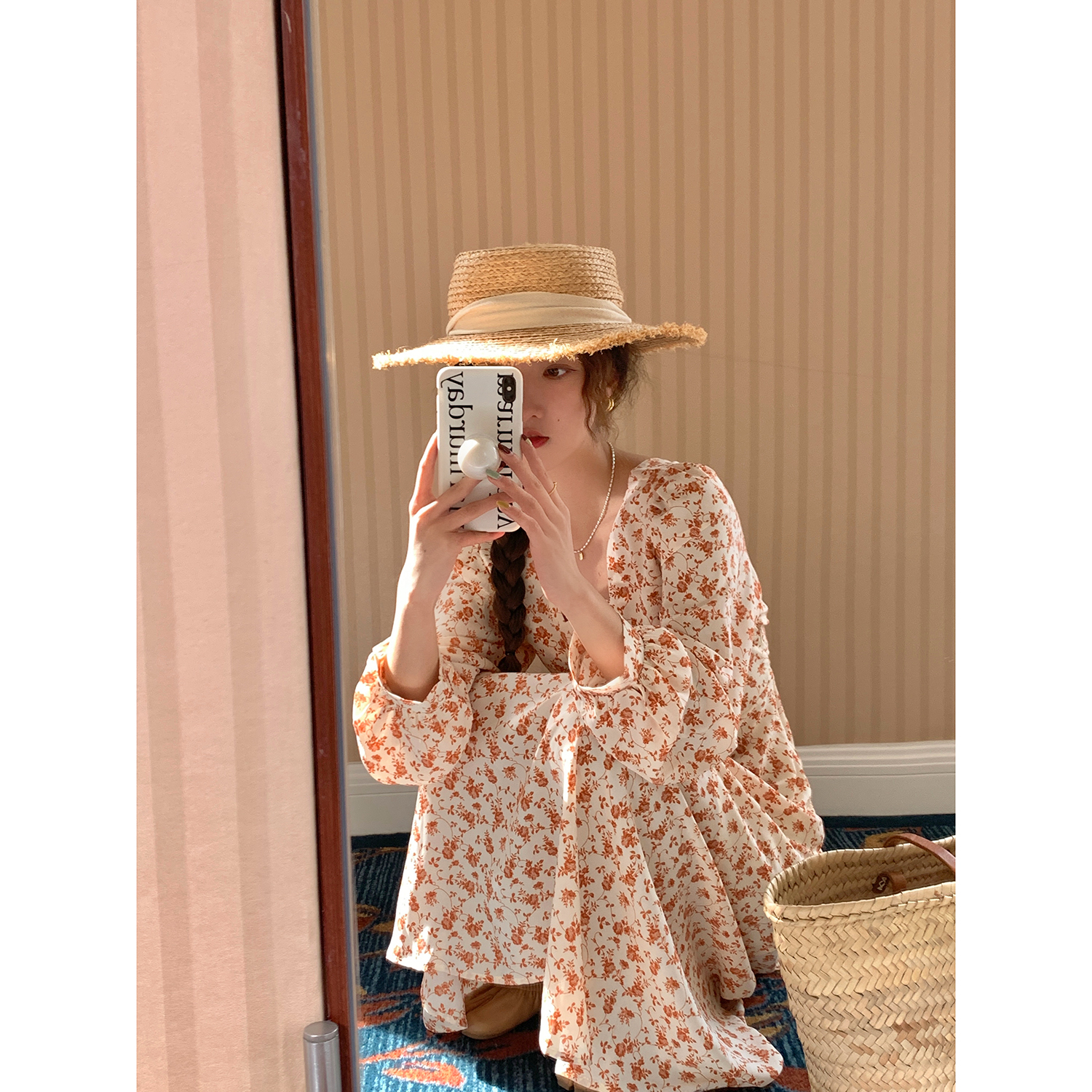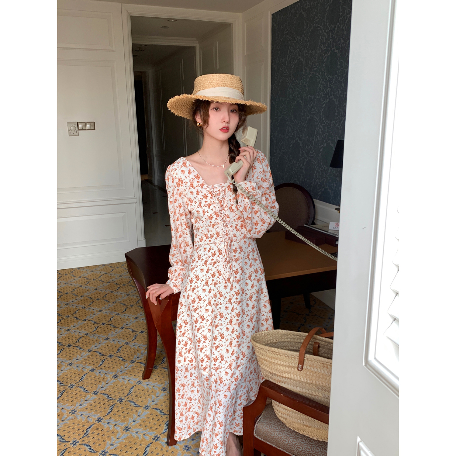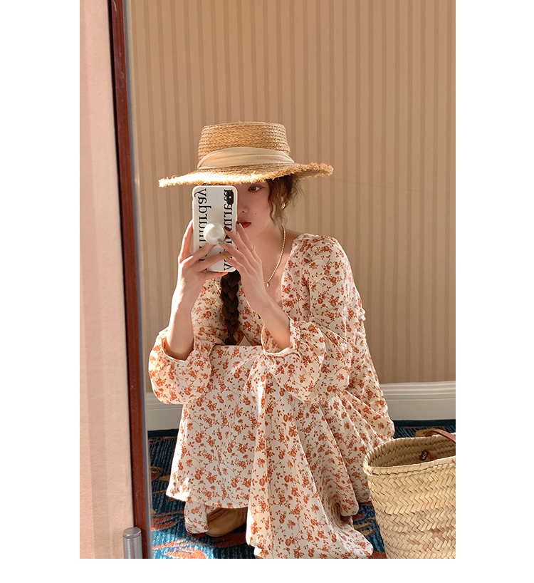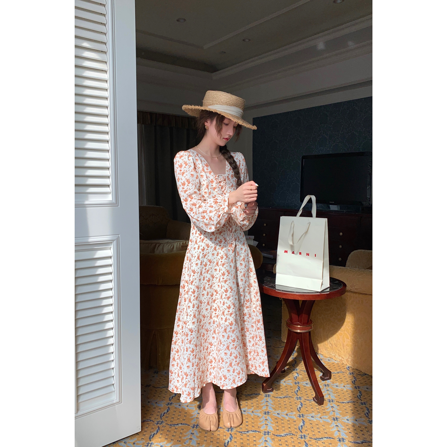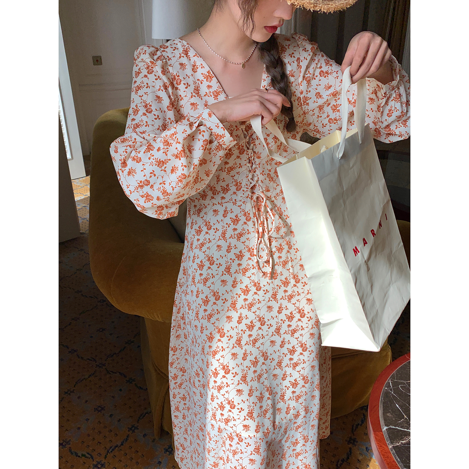 米花家【薔薇假期】V領碎花洋裝女春收腰顯瘦小個子長裙2023新