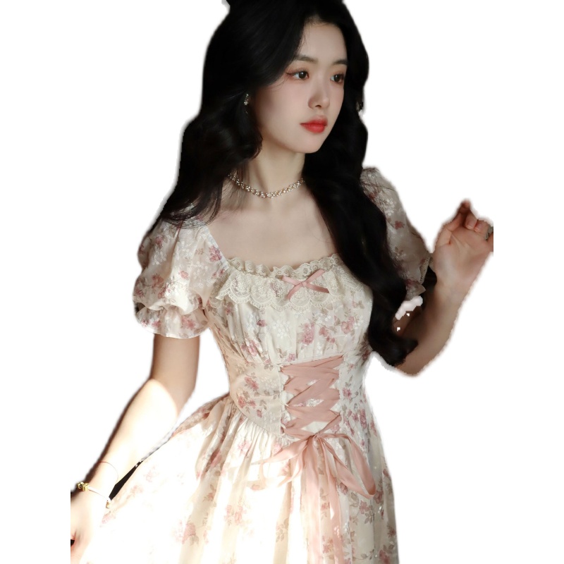 2023夏季新款法式甜美碎花裙短袖高腰顯瘦洋裝女小個子初戀裙子