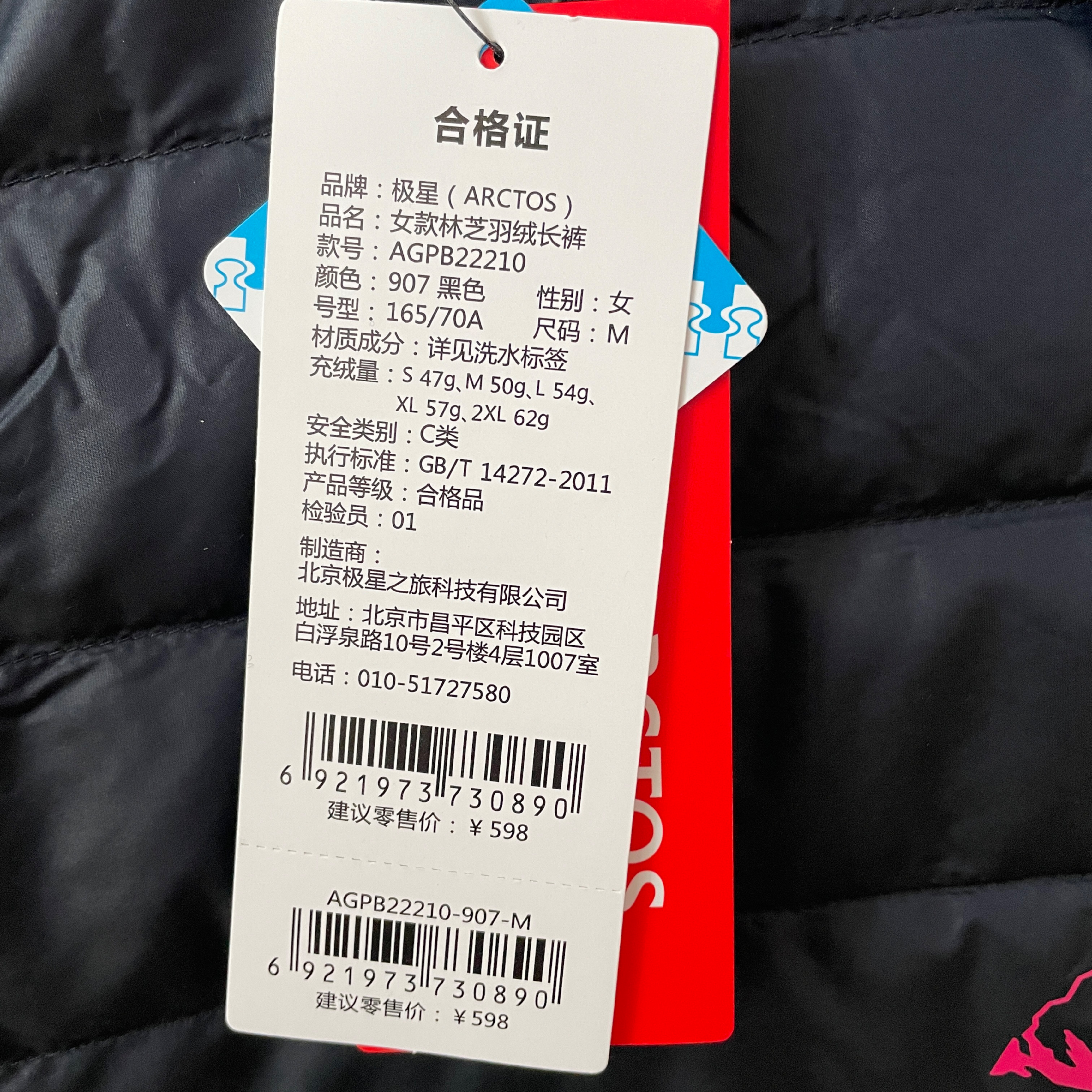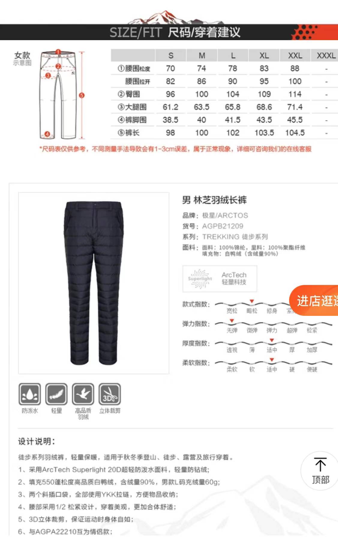 斷碼特價 Arctos極星戶外男女款700蓬鴨絨超輕防風防水保暖羽絨褲