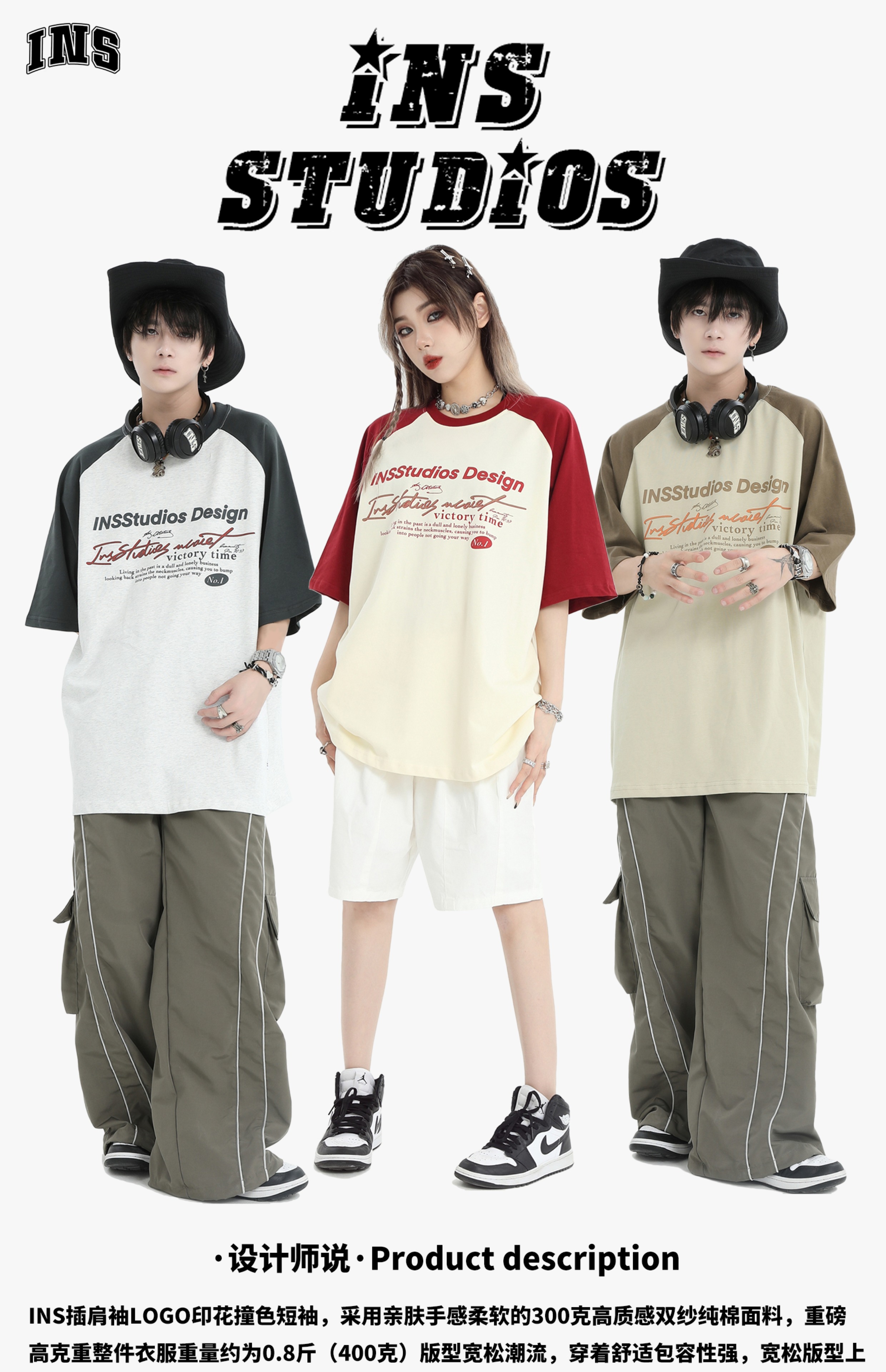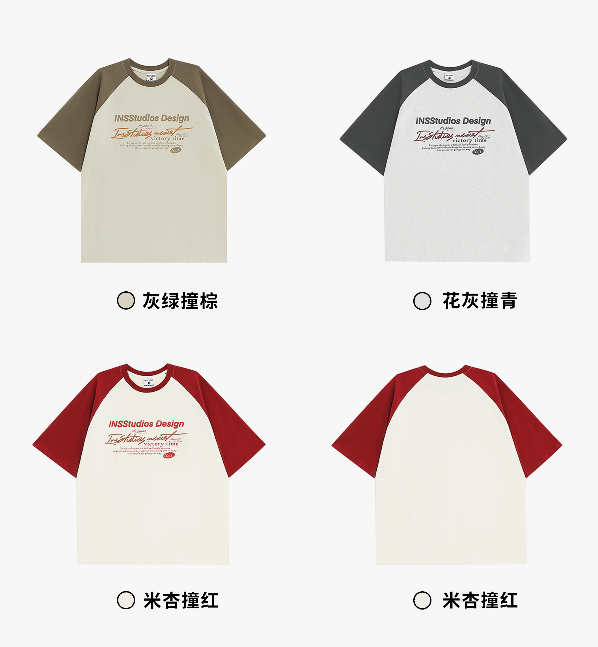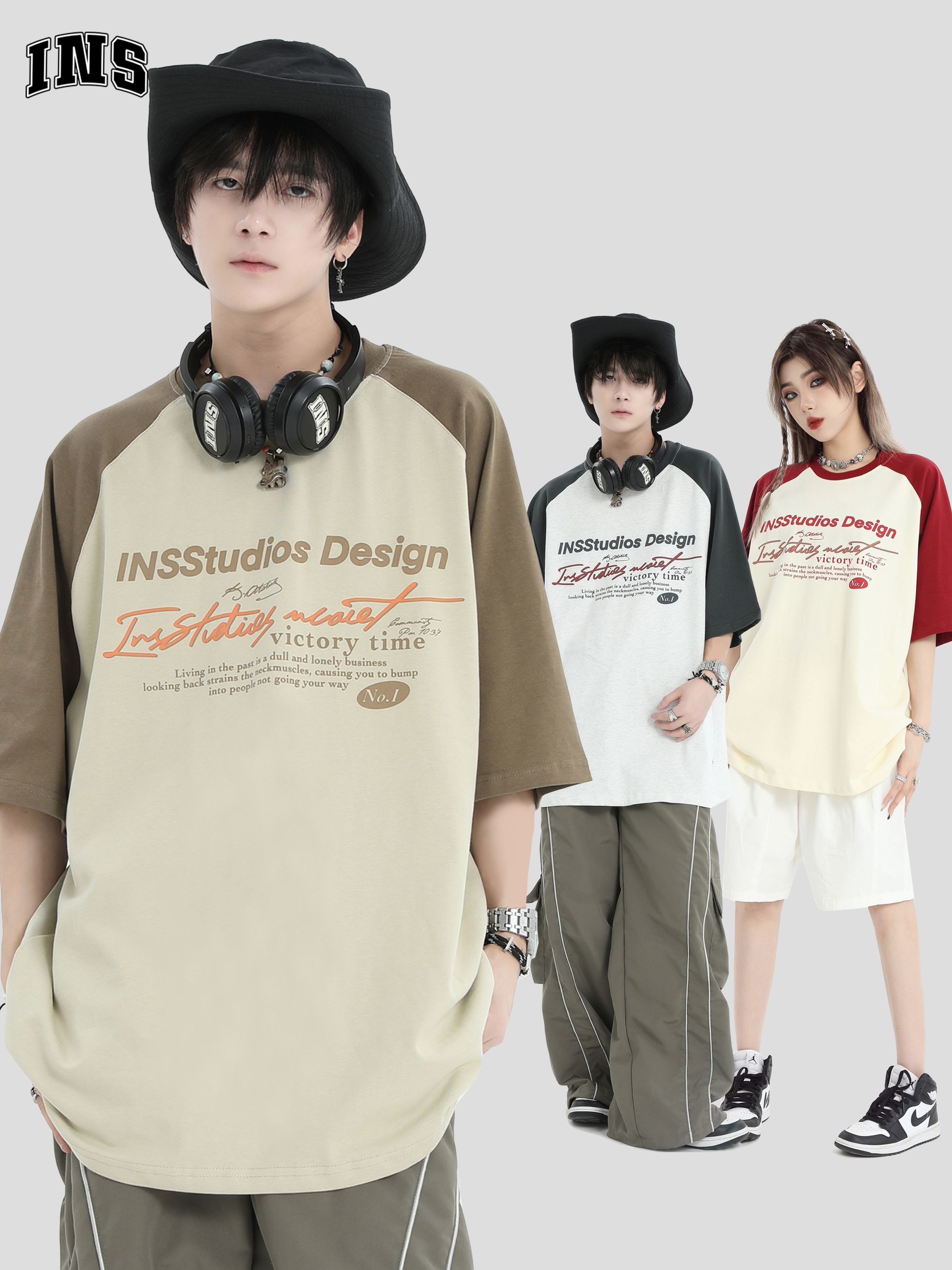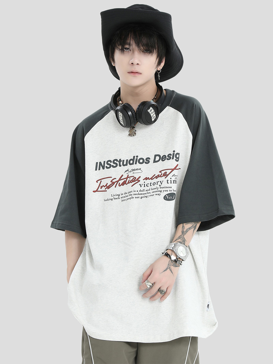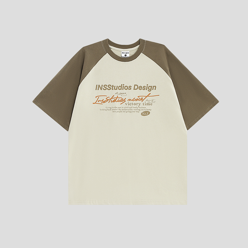 INSstudios 國潮牌情侶美式插肩袖LOGO印花撞色短袖寬鬆半袖T恤男