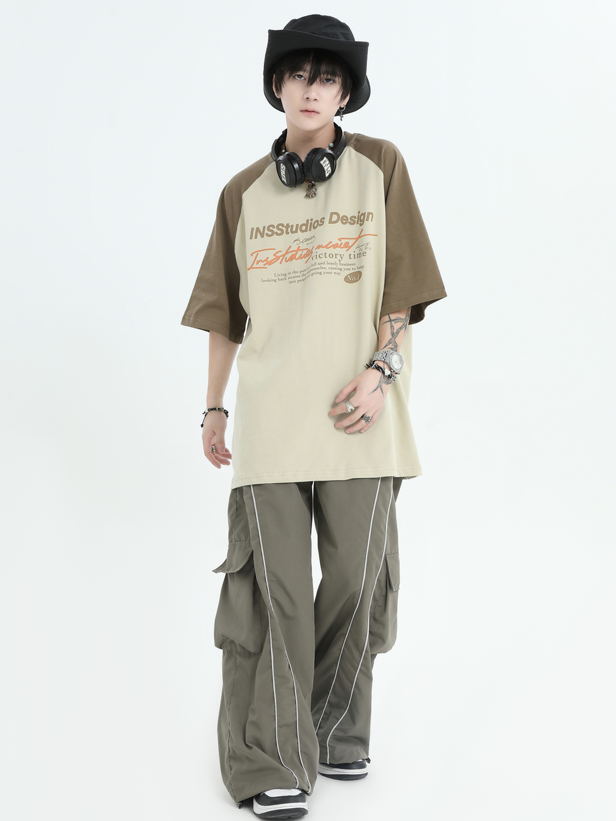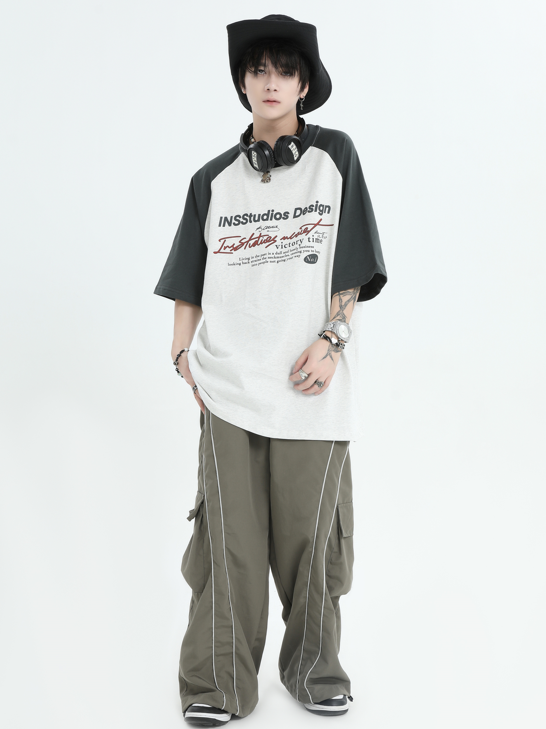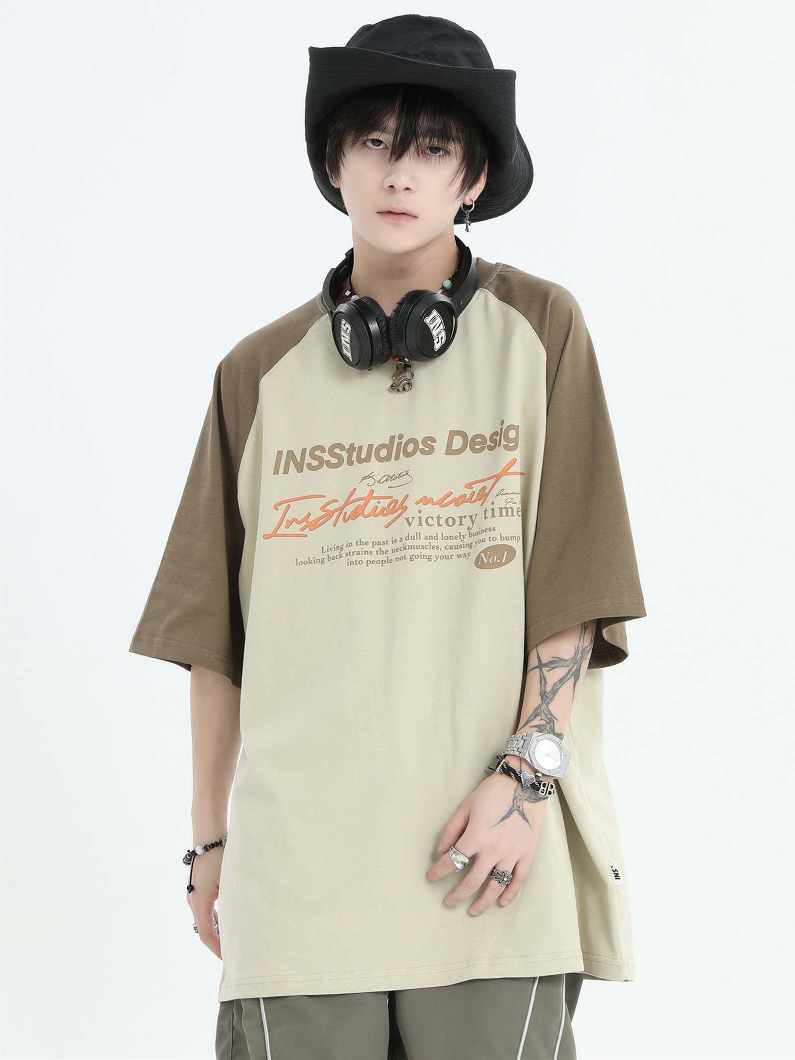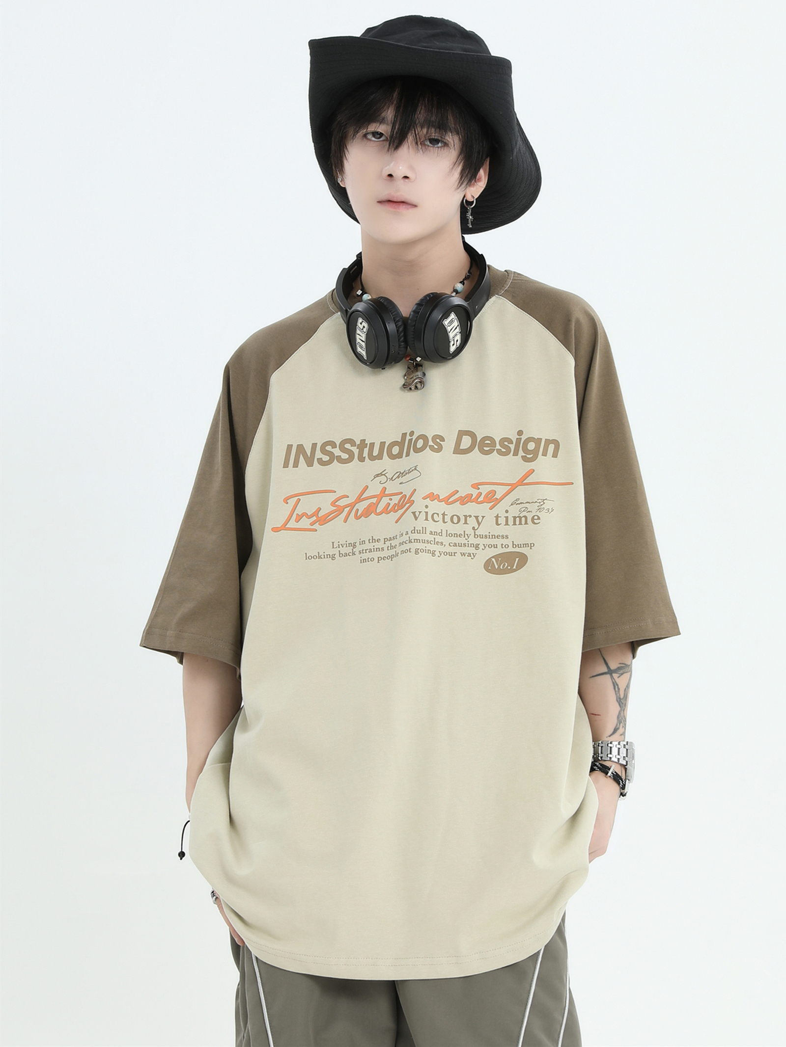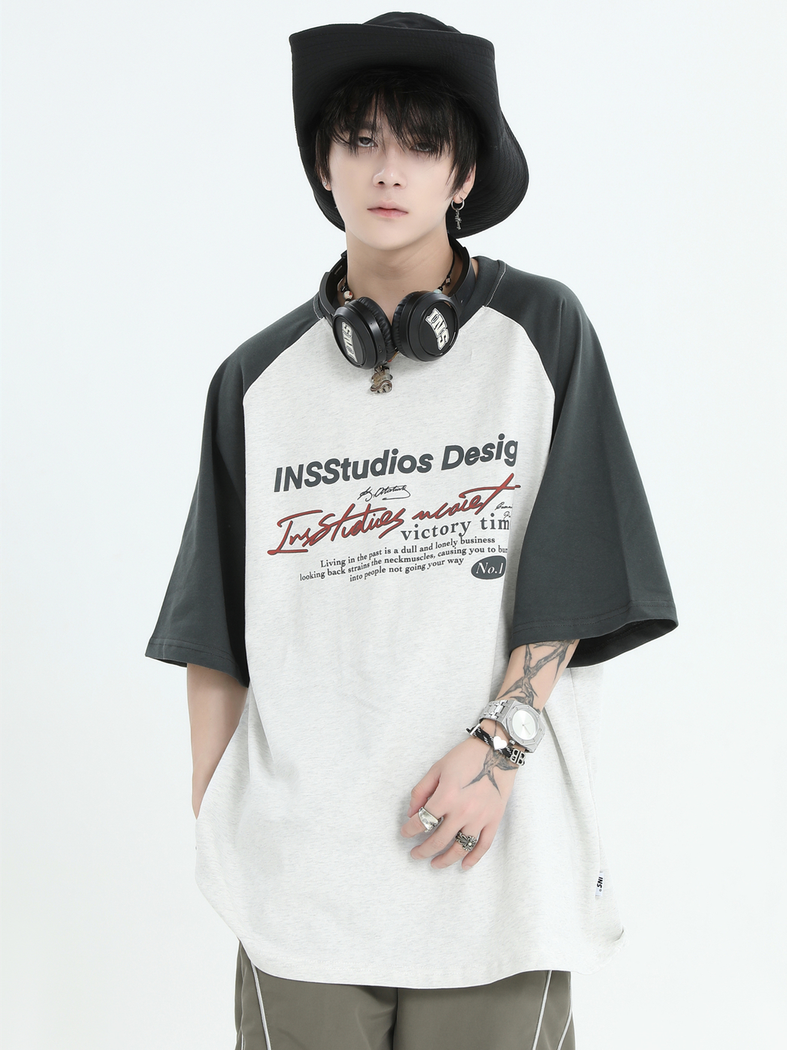 INSstudios 國潮牌情侶美式插肩袖LOGO印花撞色短袖寬鬆半袖T恤男