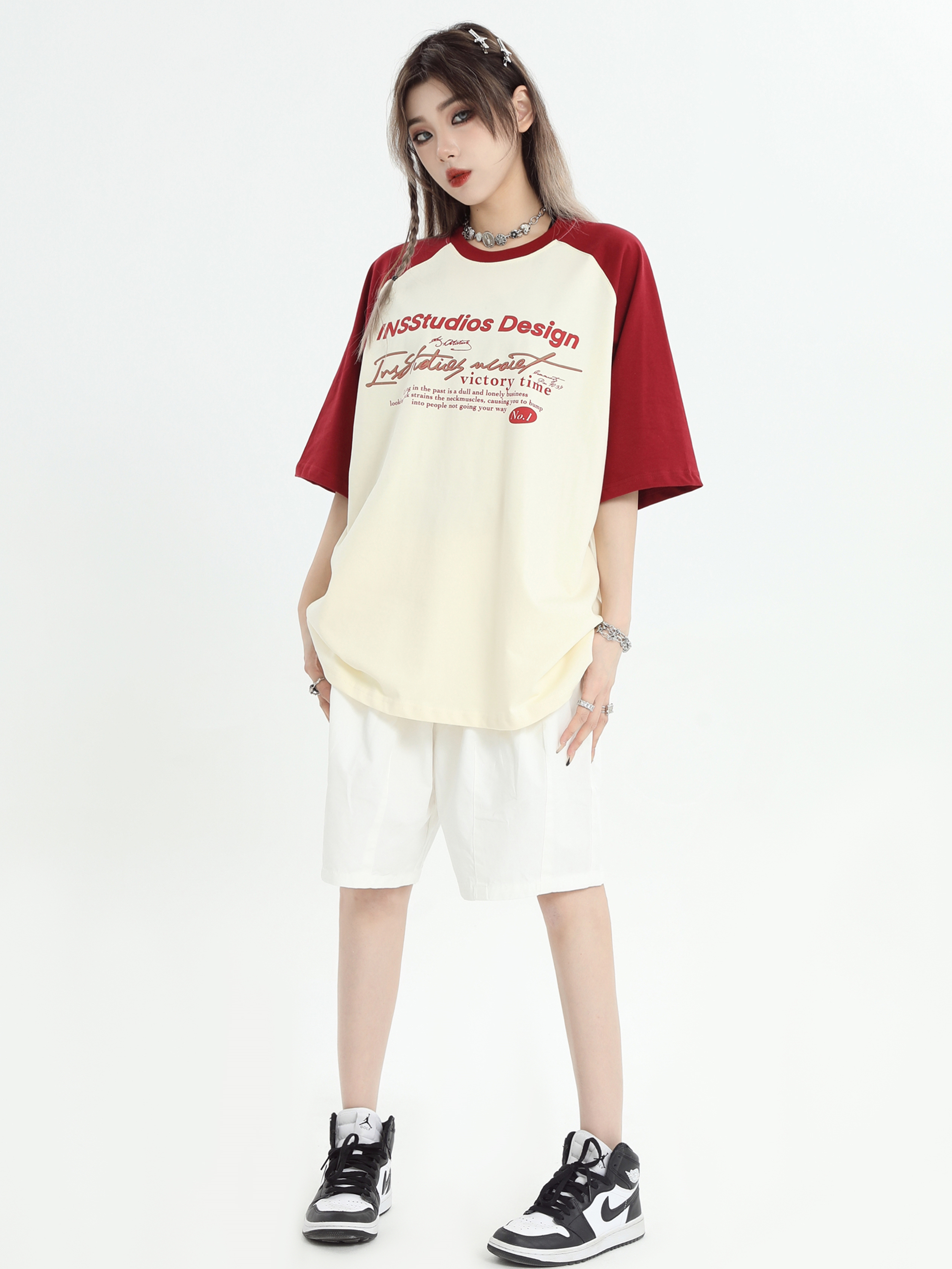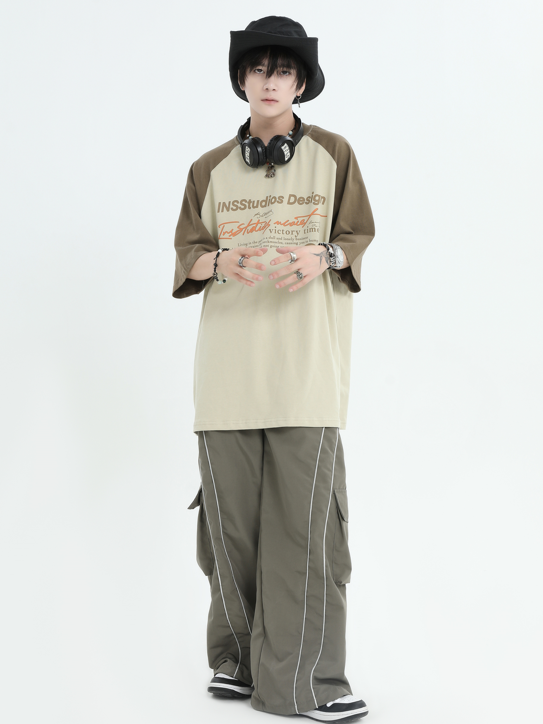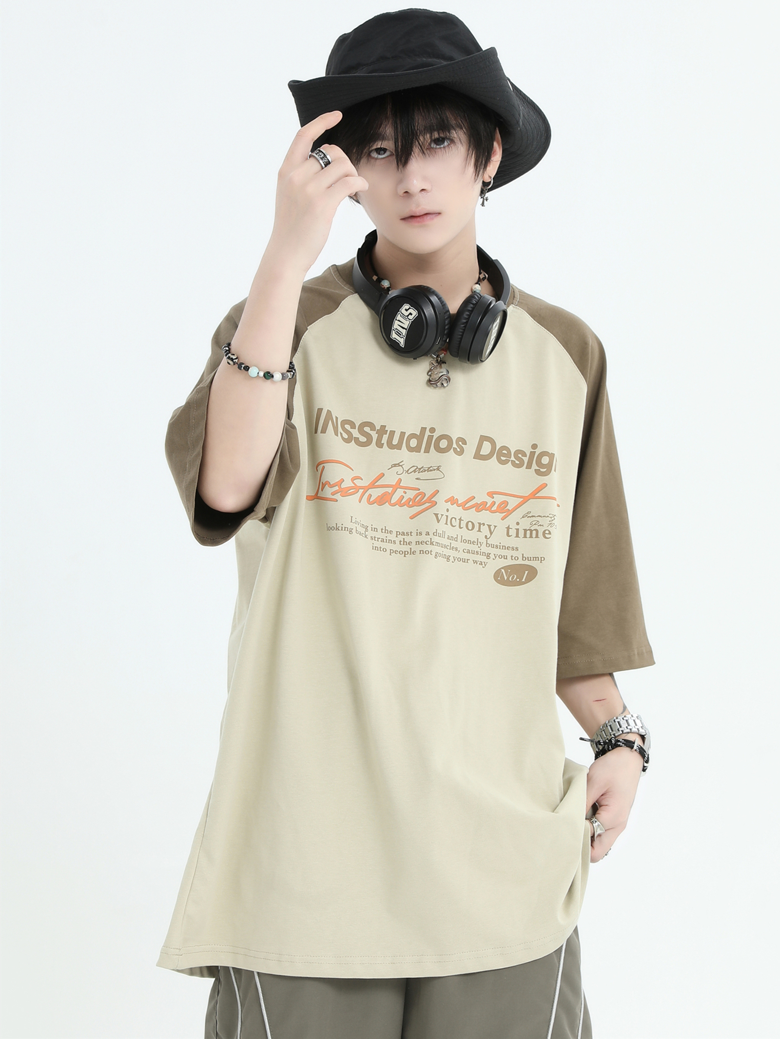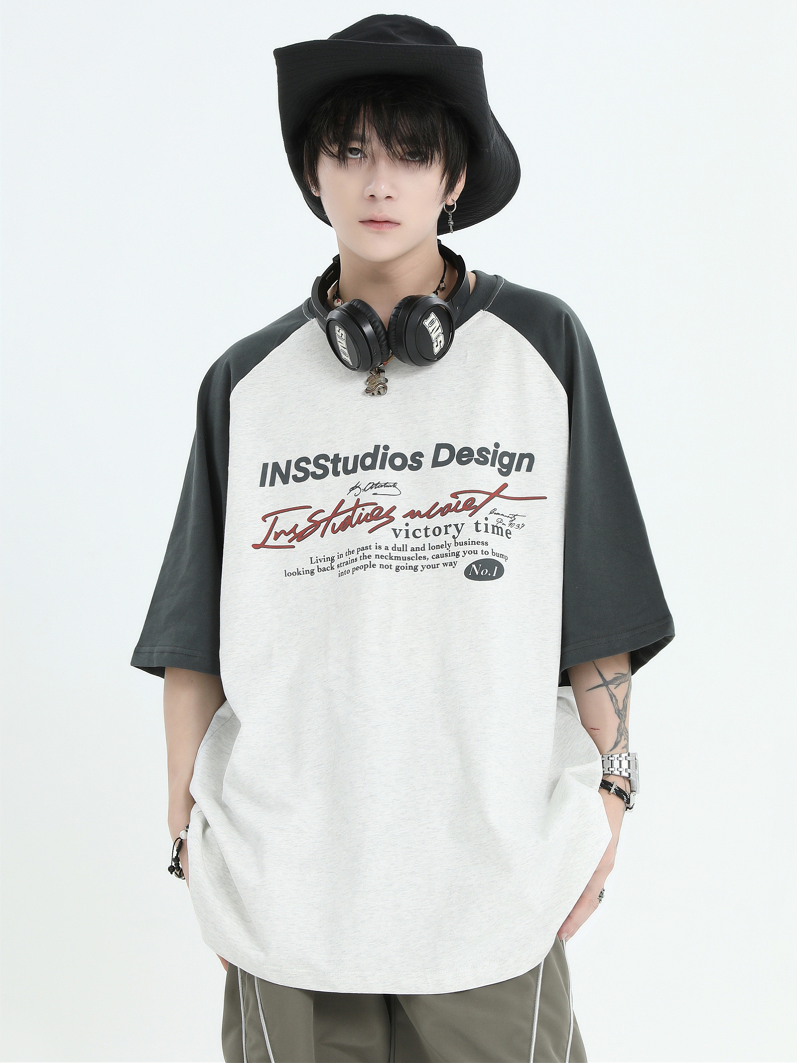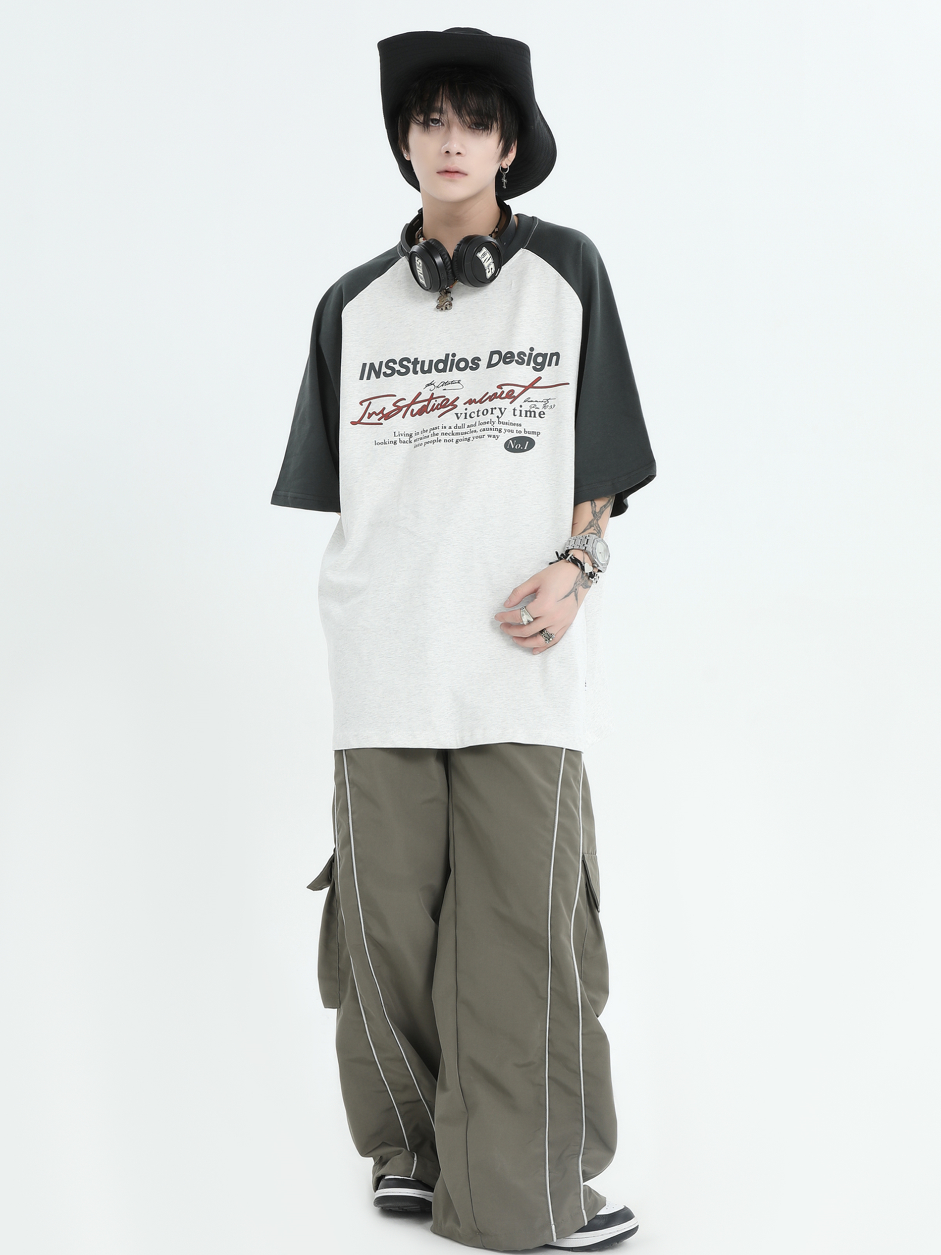 INSstudios 國潮牌情侶美式插肩袖LOGO印花撞色短袖寬鬆半袖T恤男