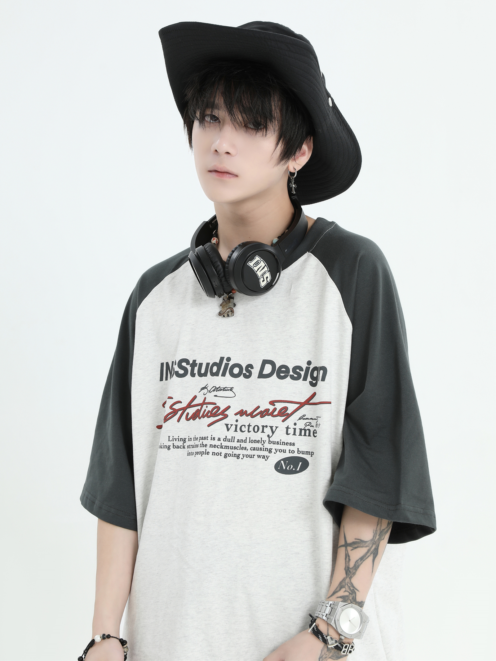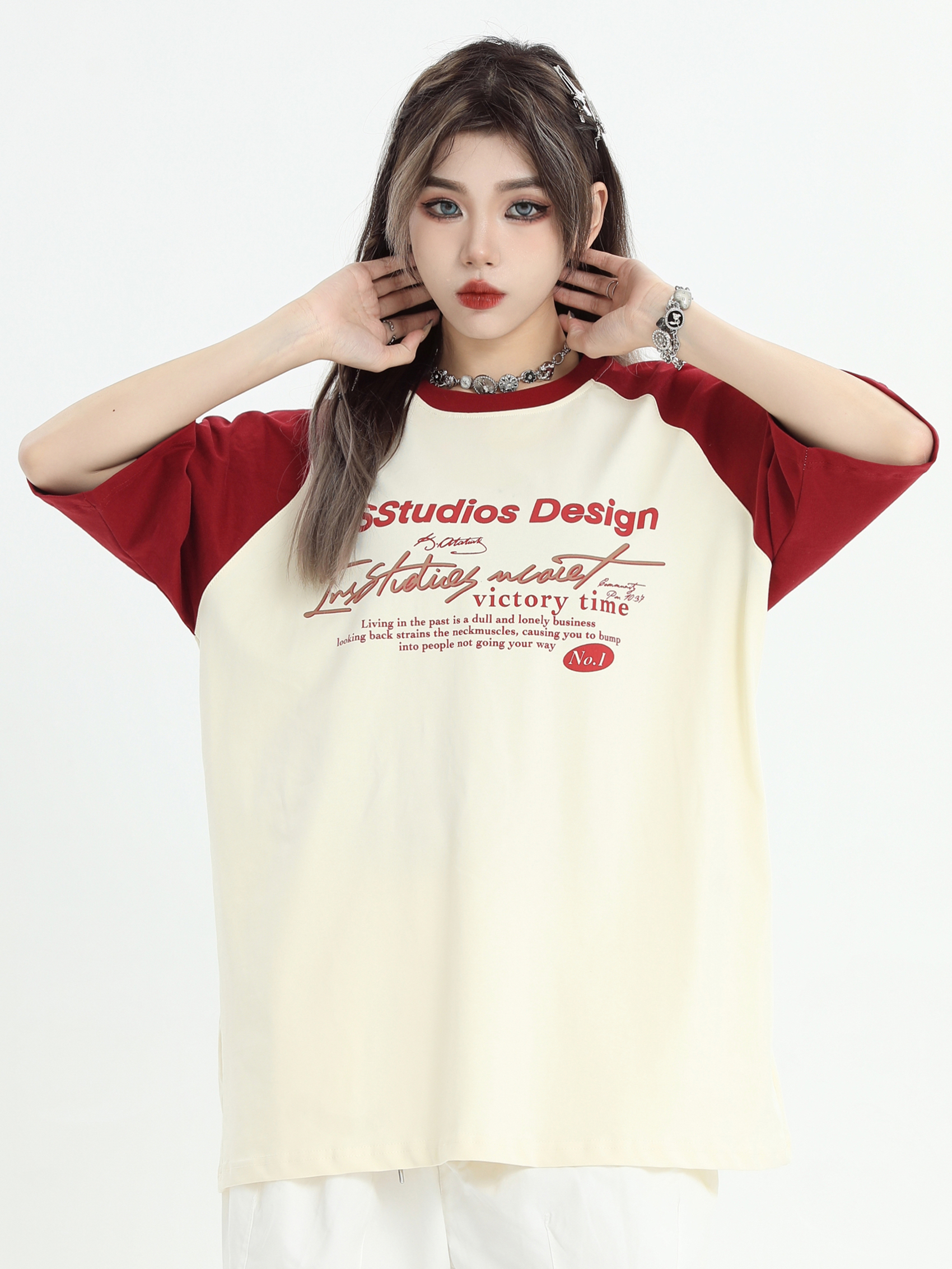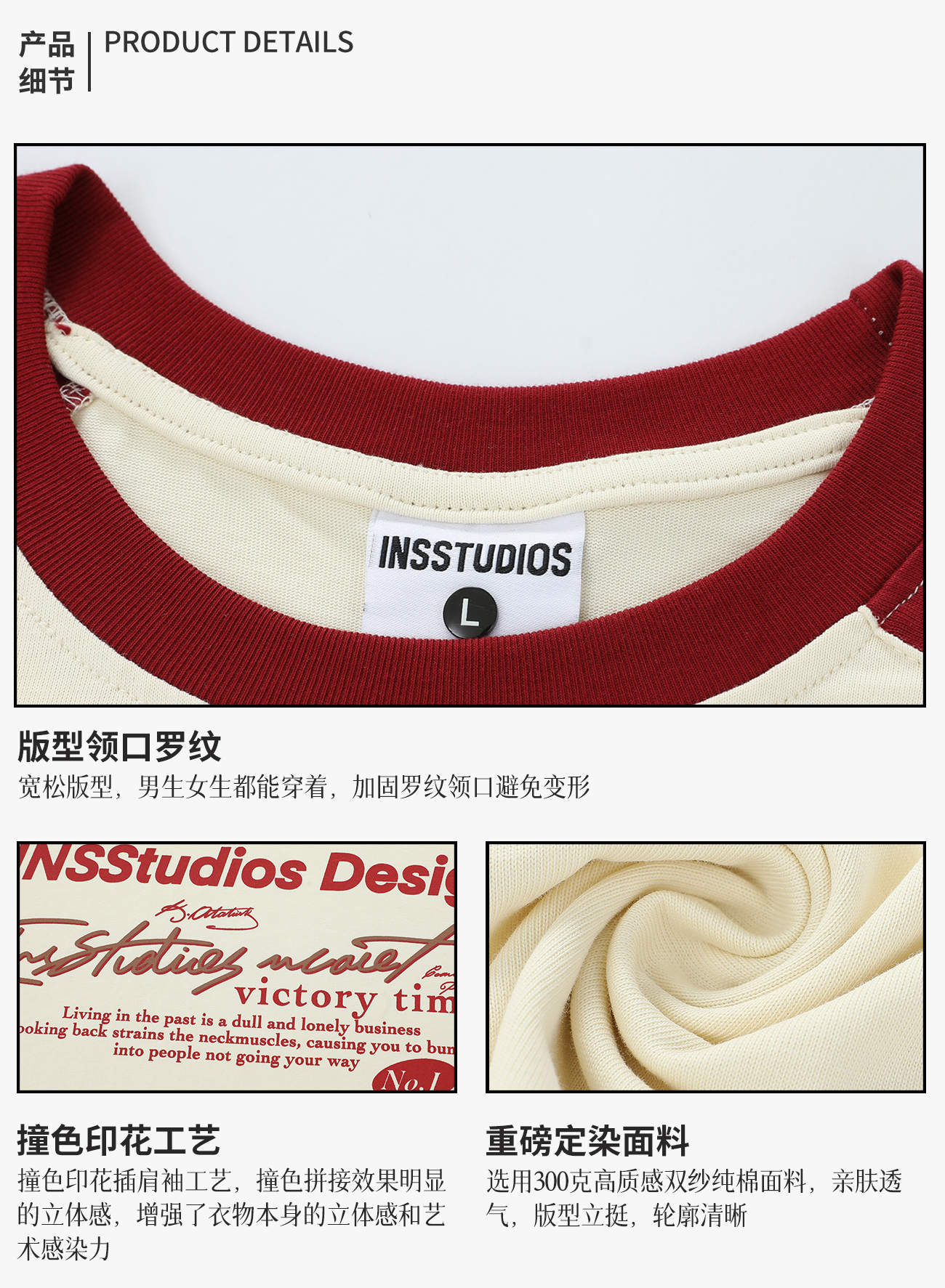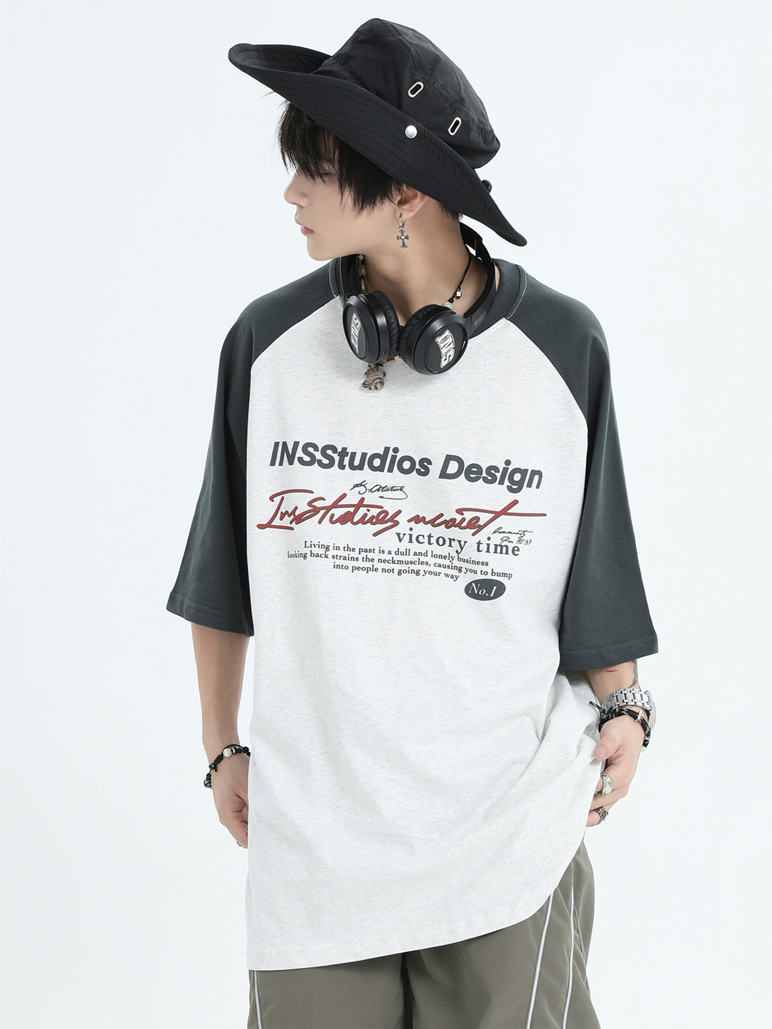 INSstudios 國潮牌情侶美式插肩袖LOGO印花撞色短袖寬鬆半袖T恤男